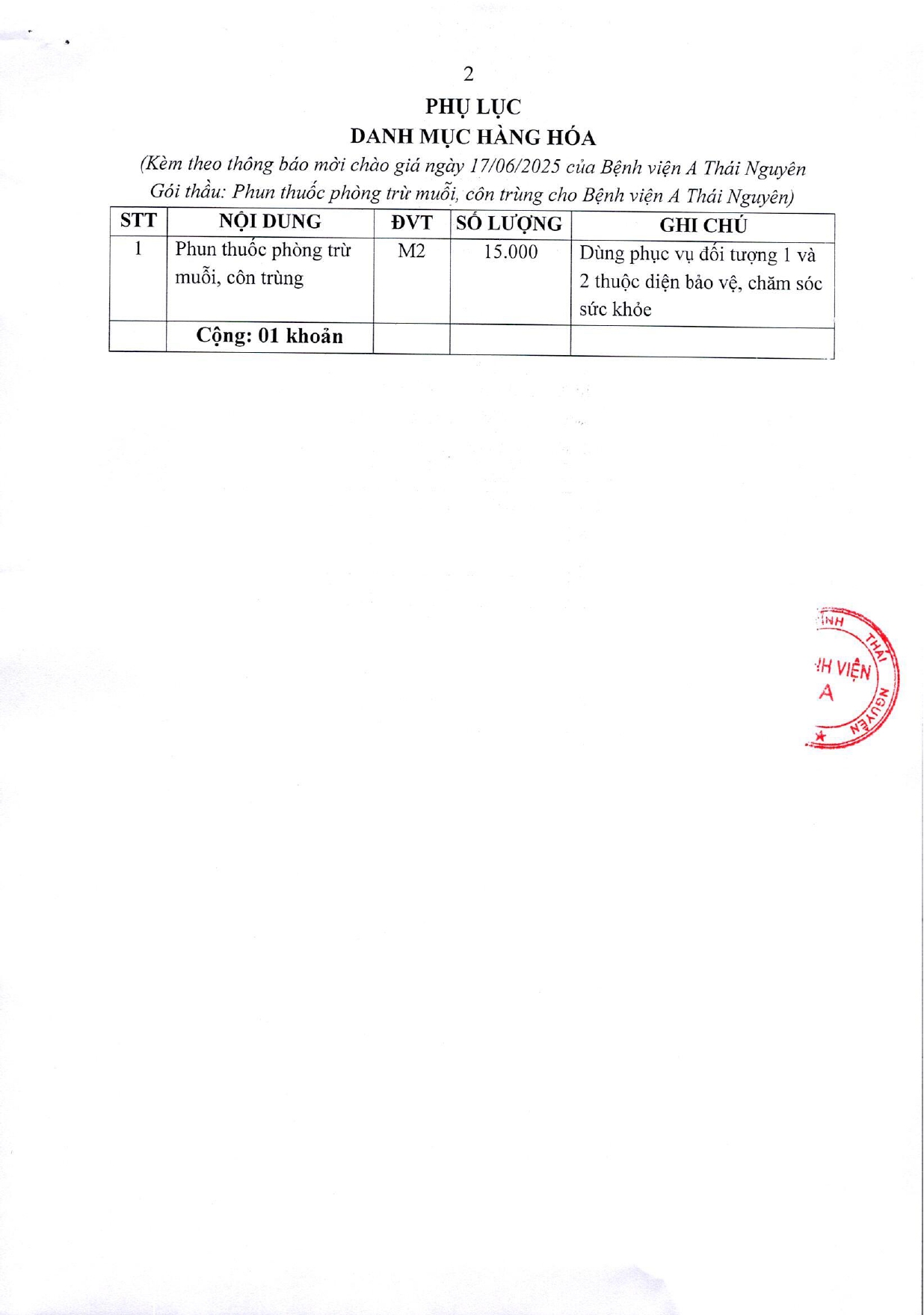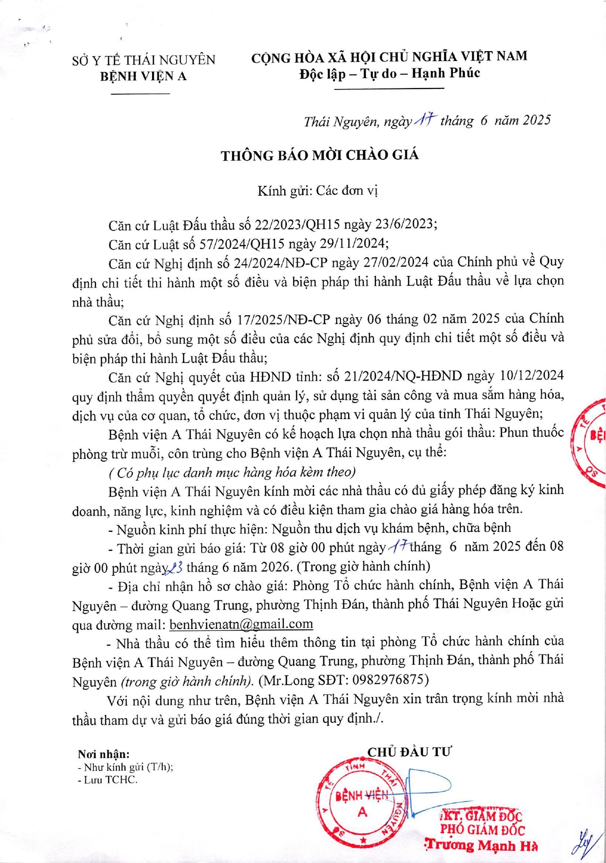 Thông báo mời chào giá gói thầu: Phun thuốc phòng trừ muỗi, côn trùng cho Bệnh viện A Thái Nguyên
