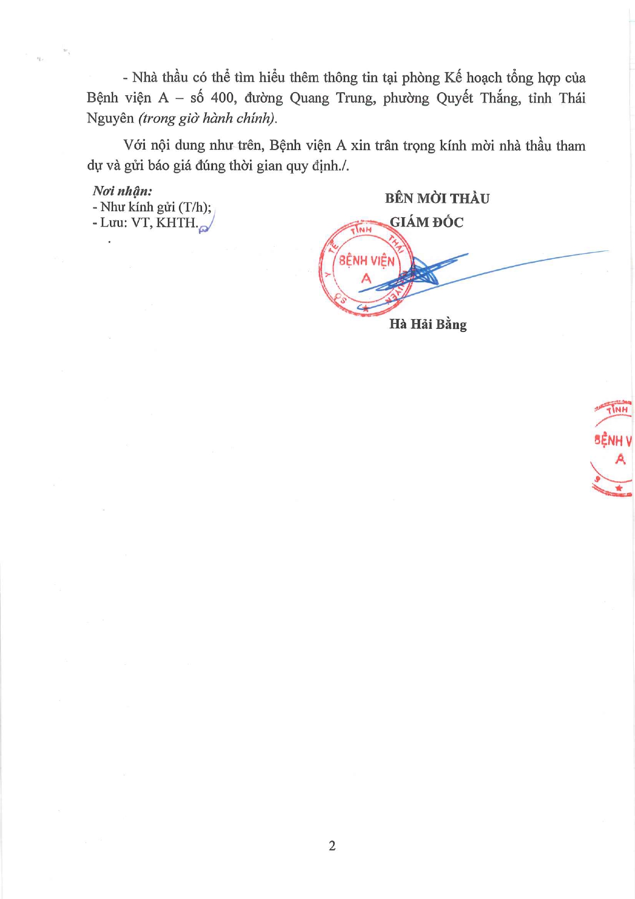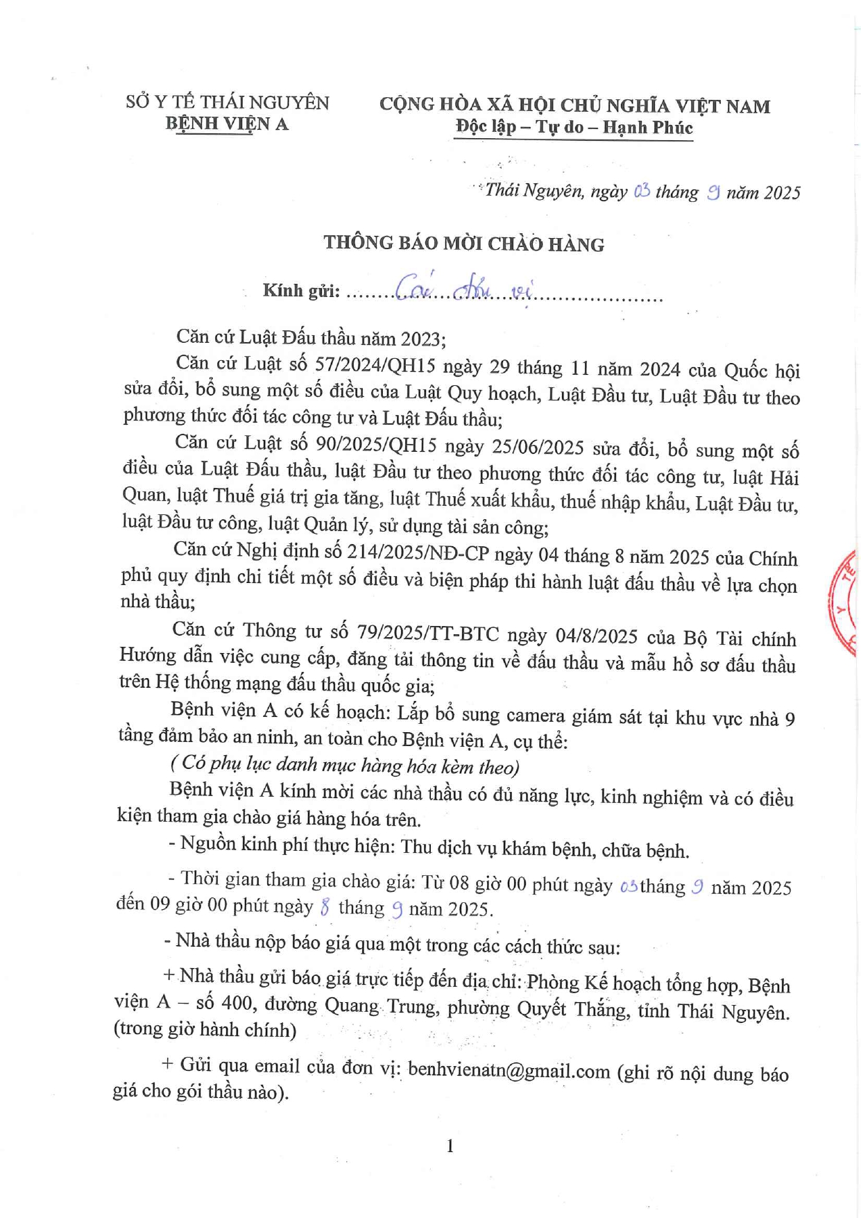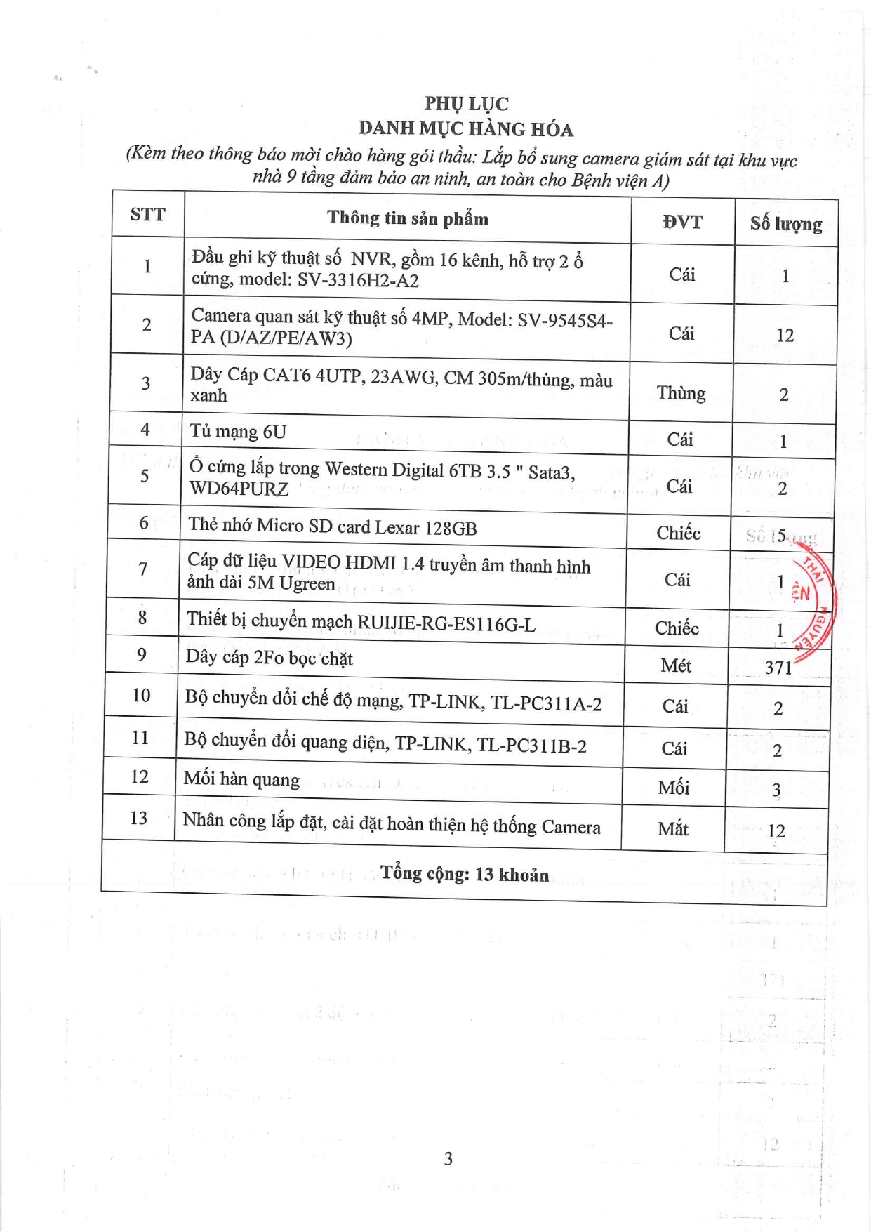 Thông báo mời chào hàng gói thầu: Lắp bổ sung camera giám sát tại khu vực nhà 9 tầng đảm bảo an ninh, an toàn cho Bệnh viện A
