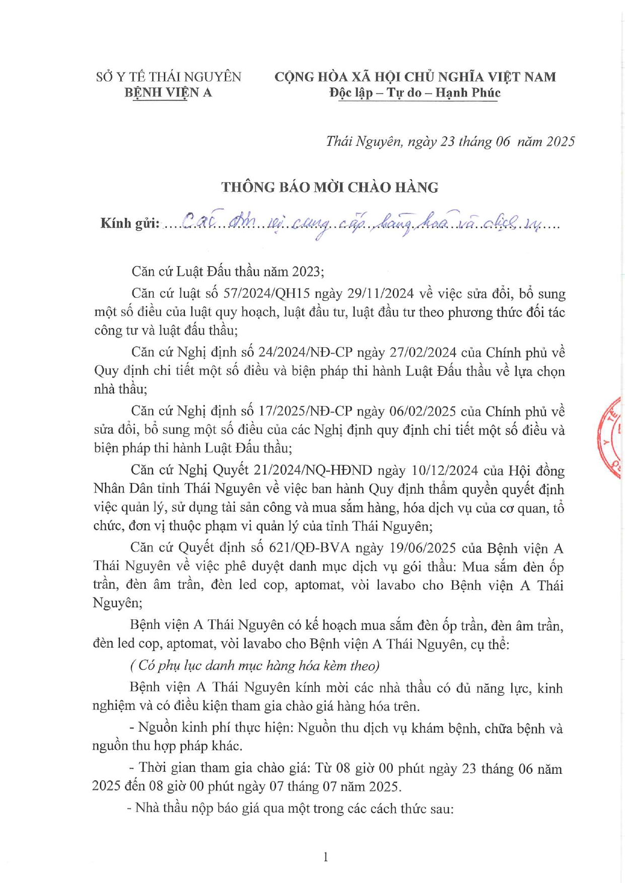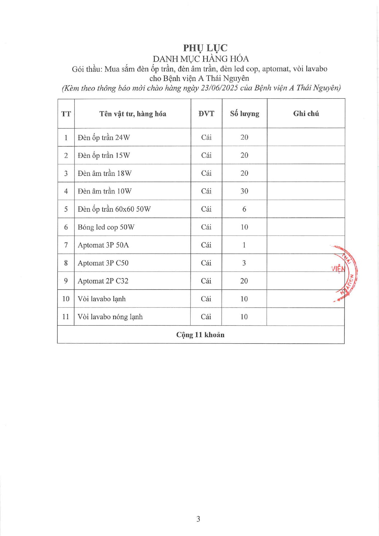 Thông báo mời chào hàng gói thầu: Mua sắm đèn ốp trần, đèn âm trần, đèn led cop, aptomat, vòi lavabo cho Bệnh viện A Thái Nguyên