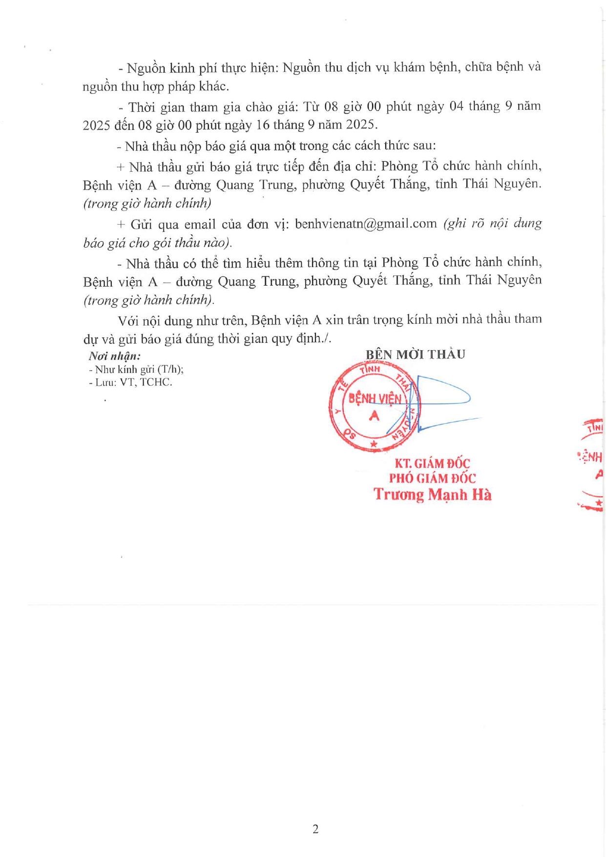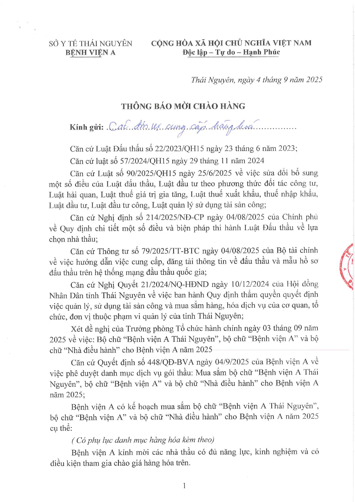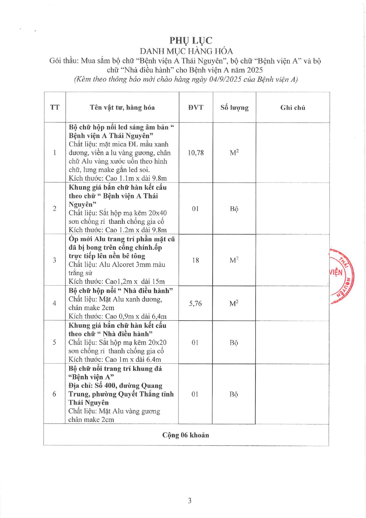 Thông báo mời chào giá gói thầu: Mua sắm bộ chữ "Bệnh viện A Thái Nguyên", bộ chữ "Bệnh viện A" và bộ chữ "Nhà điều hành" cho Bệnh viện A năm 2025