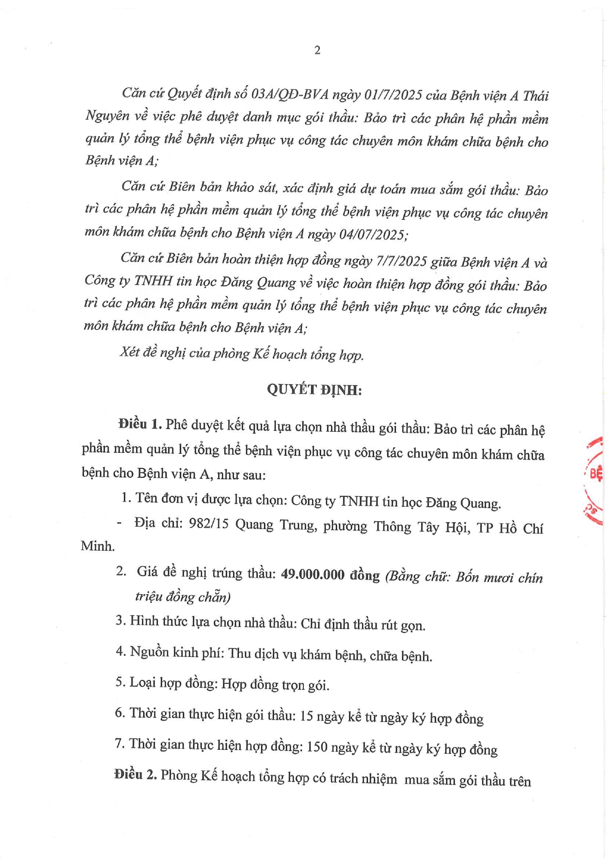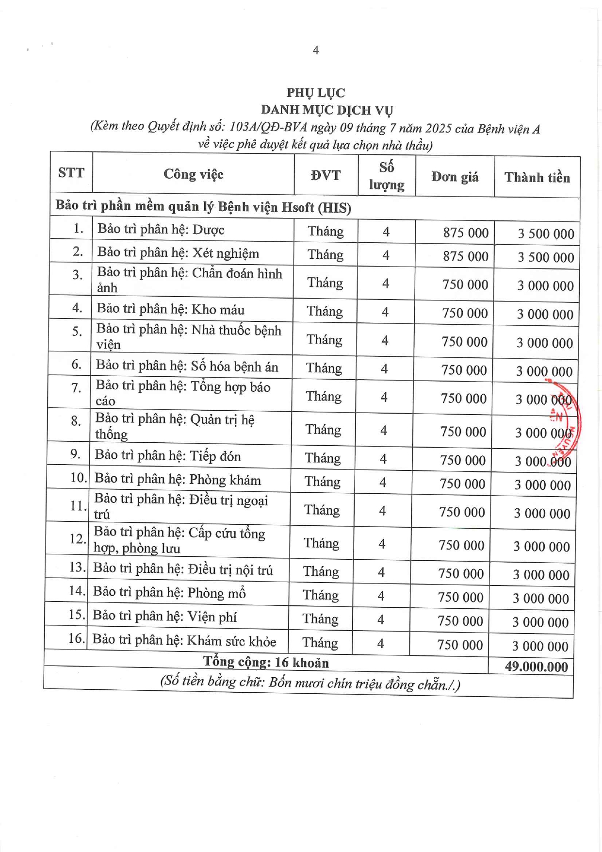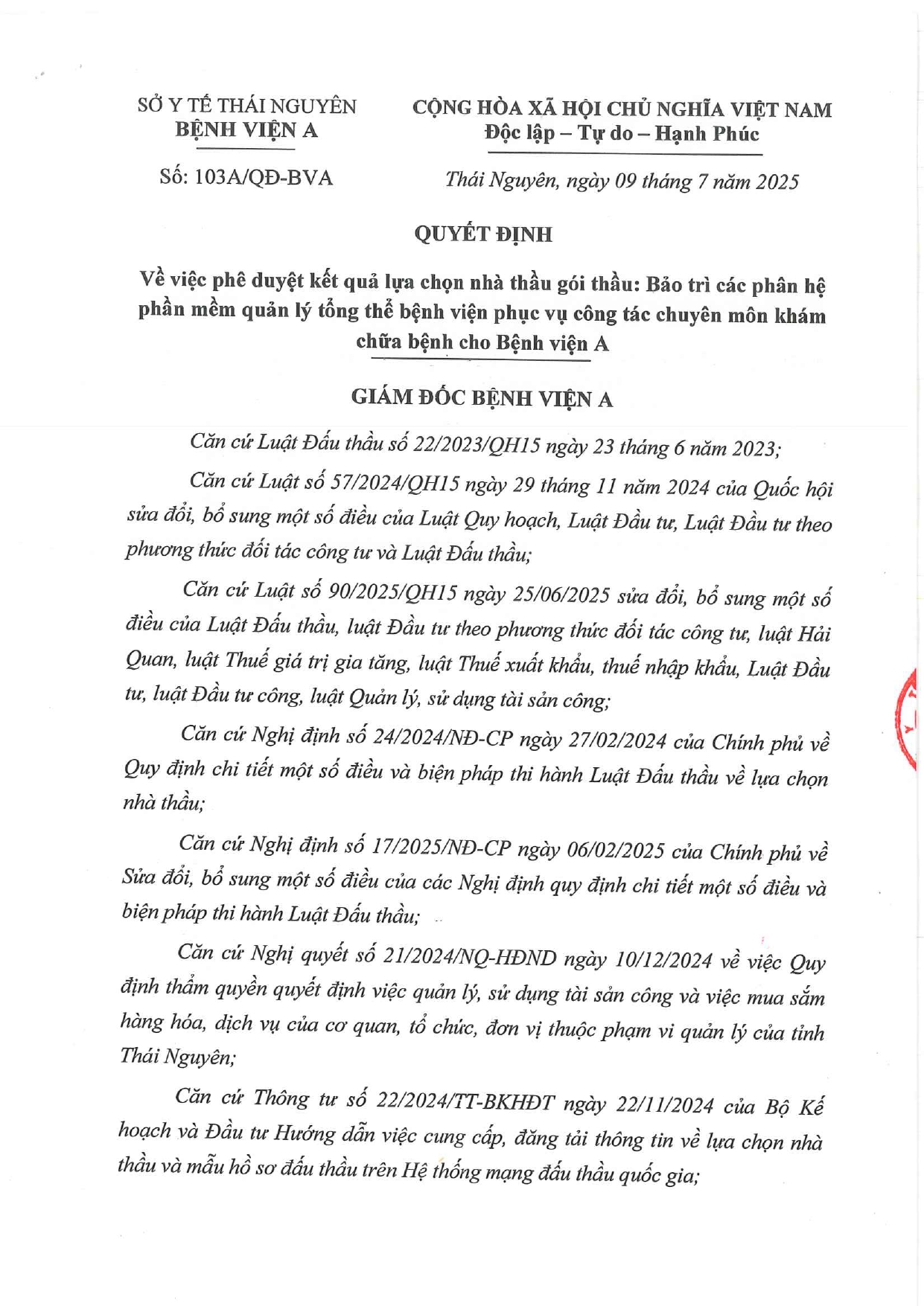 Quyết định về việc phê duyệt kết quả lựa chọn nhà thầu gói thầu: Bảo trì các phân hệ phần mềm quản lý tổng thể bệnh viện phục vụ công tác chuyên môn khám chữa bệnh cho Bệnh viện A