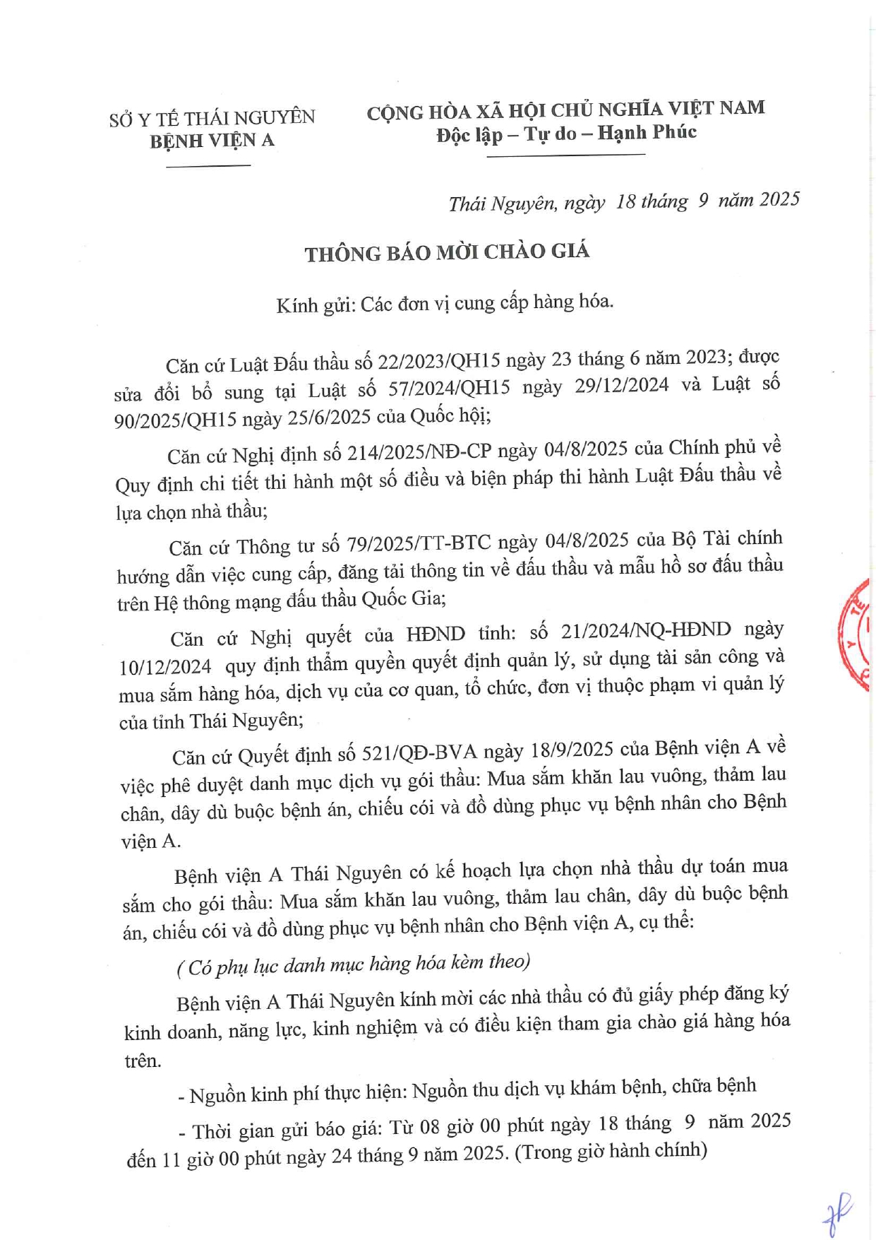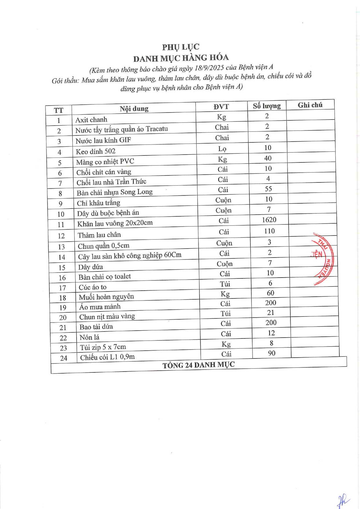 Thông báo chào giá gói thầu: Mua sắm khăn lau vuông, thảm lau chân, dây dù buộc bệnh án, chiếu cói và đồ dùng phục vụ bệnh nhân