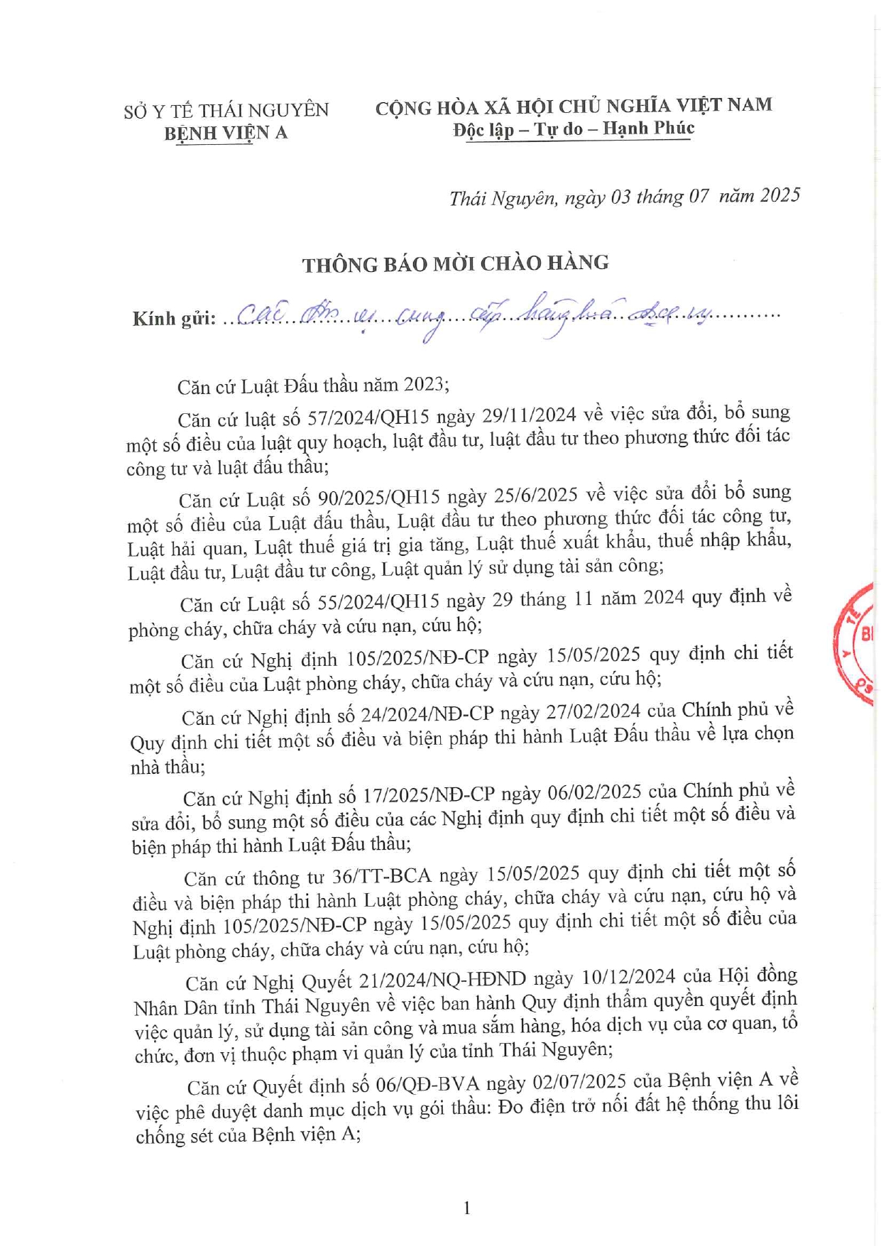 • Thông báo mời chào hàng gói thầu: Mua phụ kiện máy in phục vụ công tác chuyên môn khám chữa bệnh tại Bệnh viện A ( 10/10/2025)
