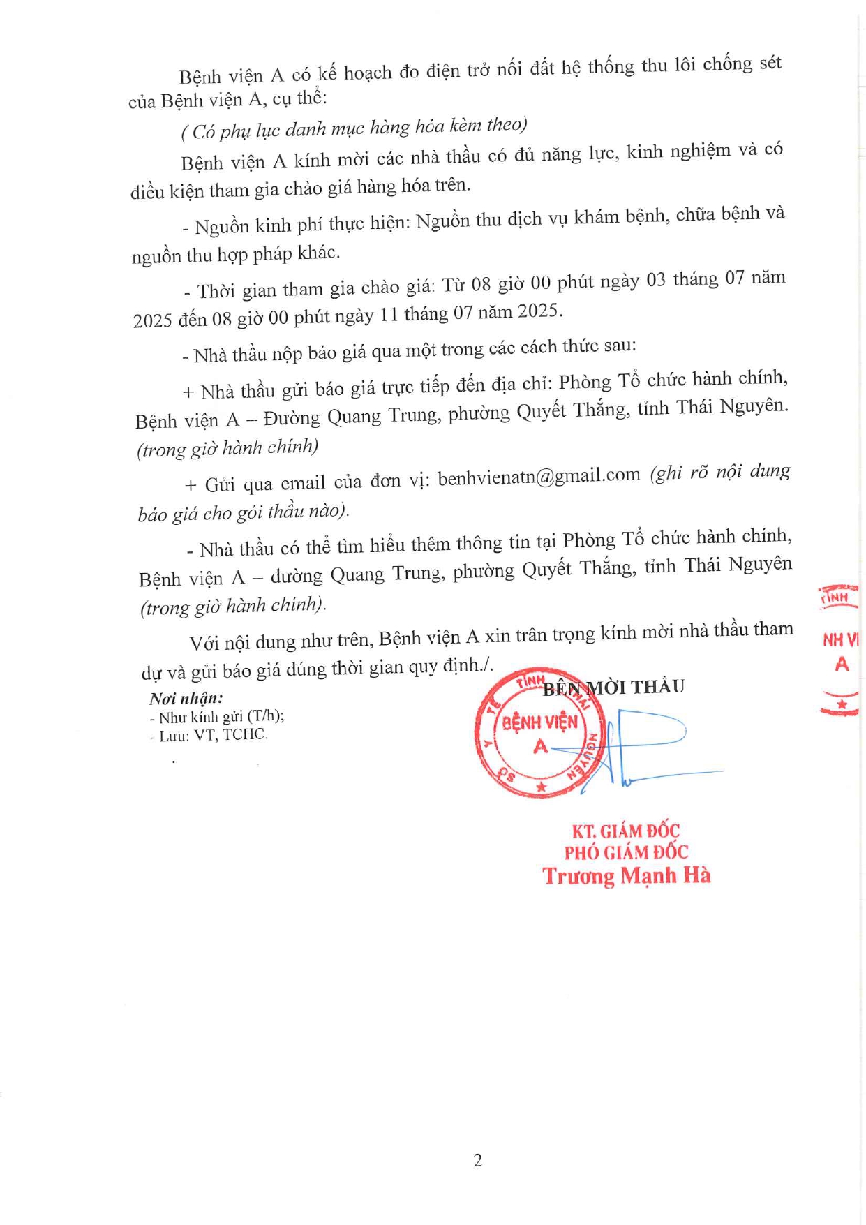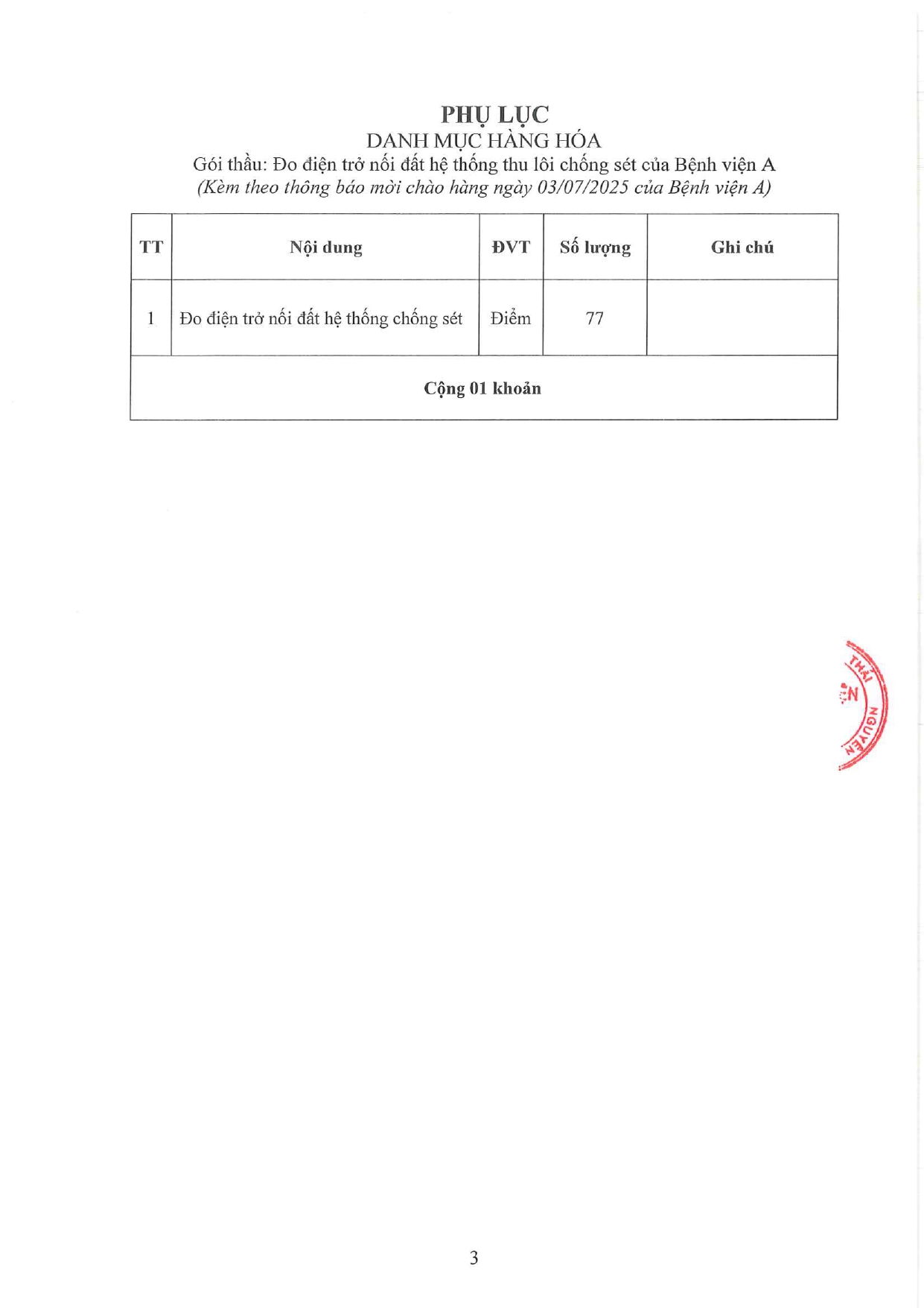 Thông báo mời chào hàng gói thầu: Đo điện trở nối đất hệ thống thu lôi chống sét của Bệnh viện A