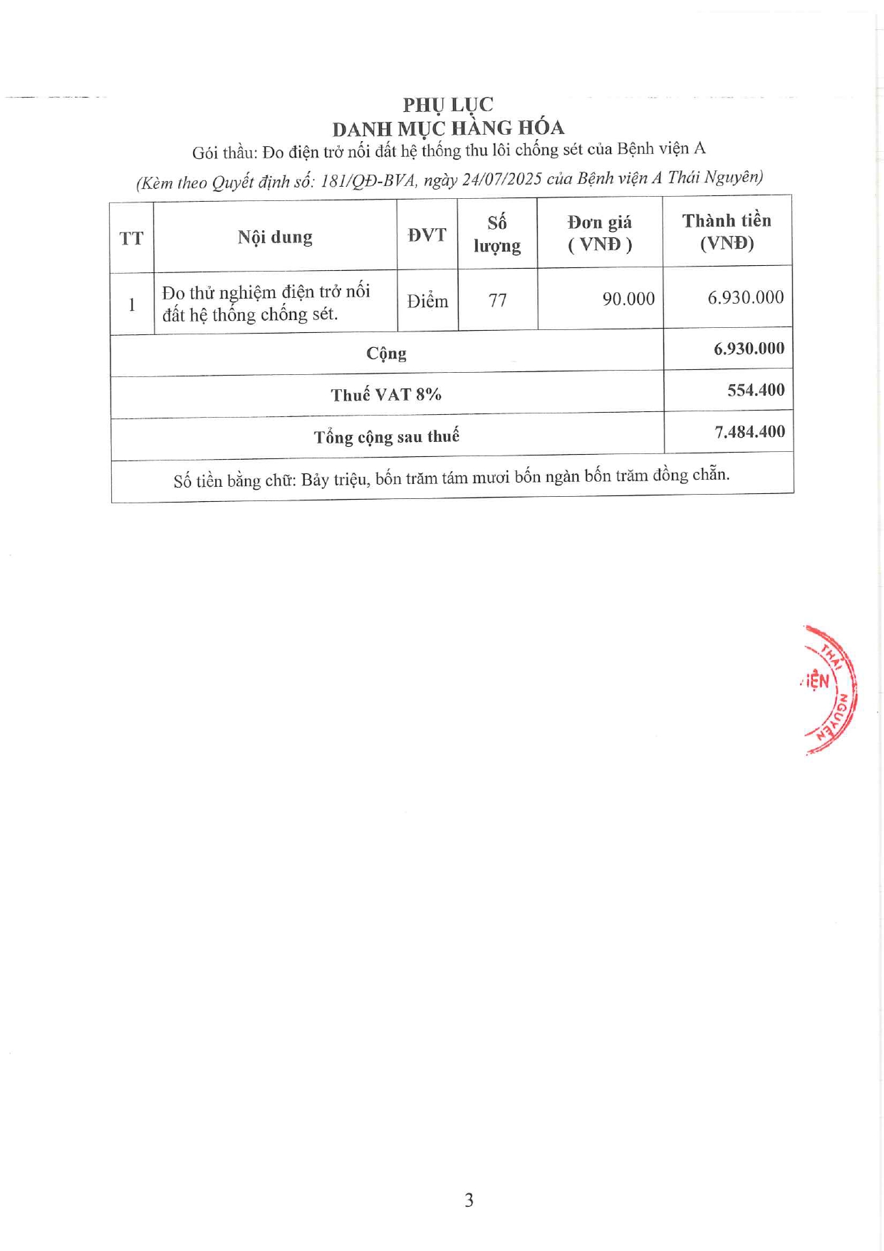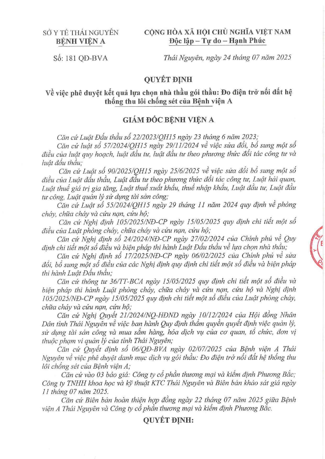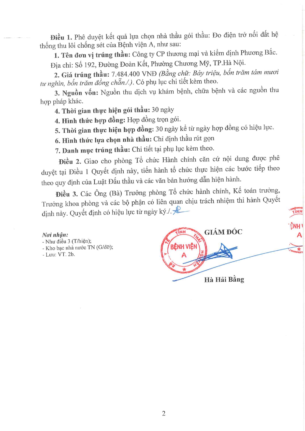 Quyết định về việc phê duyệt kết quả lựa chọn nhà thầu gói thầu: Đo điện trở nối đất hệ thống thu lôi chống sét của Bệnh viện A