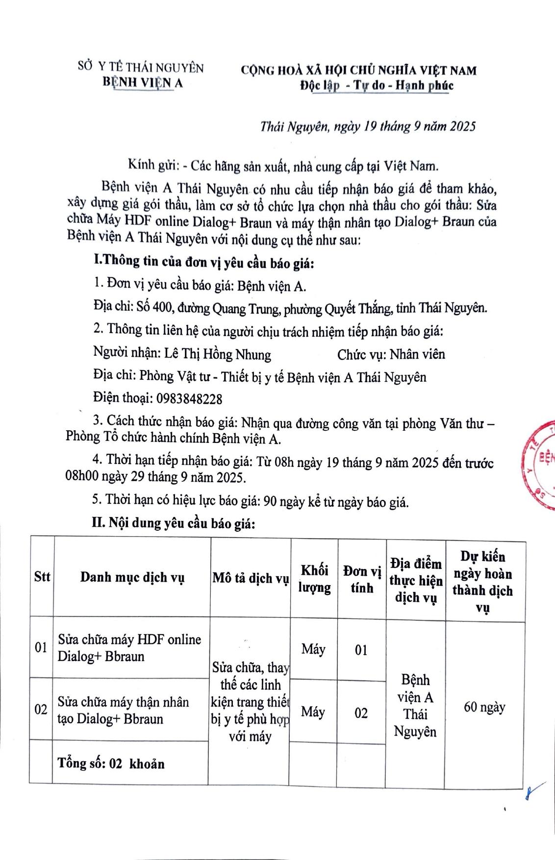 Thông báo mời chào giá gói thầu: Sửa chữa máy HDF online Dialog + Braun và máy thận nhân tạo Dialog + Braun của Bệnh viện A