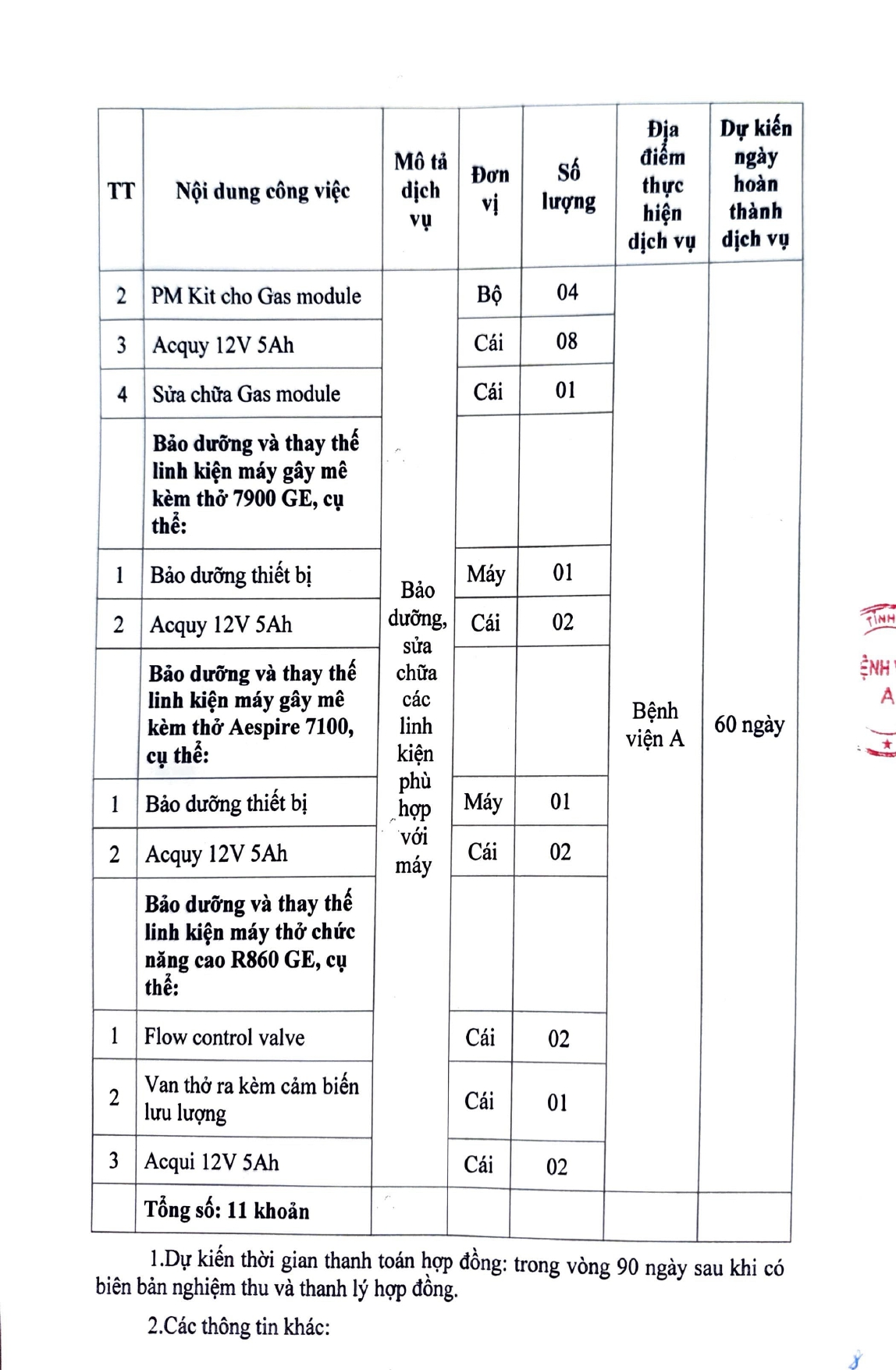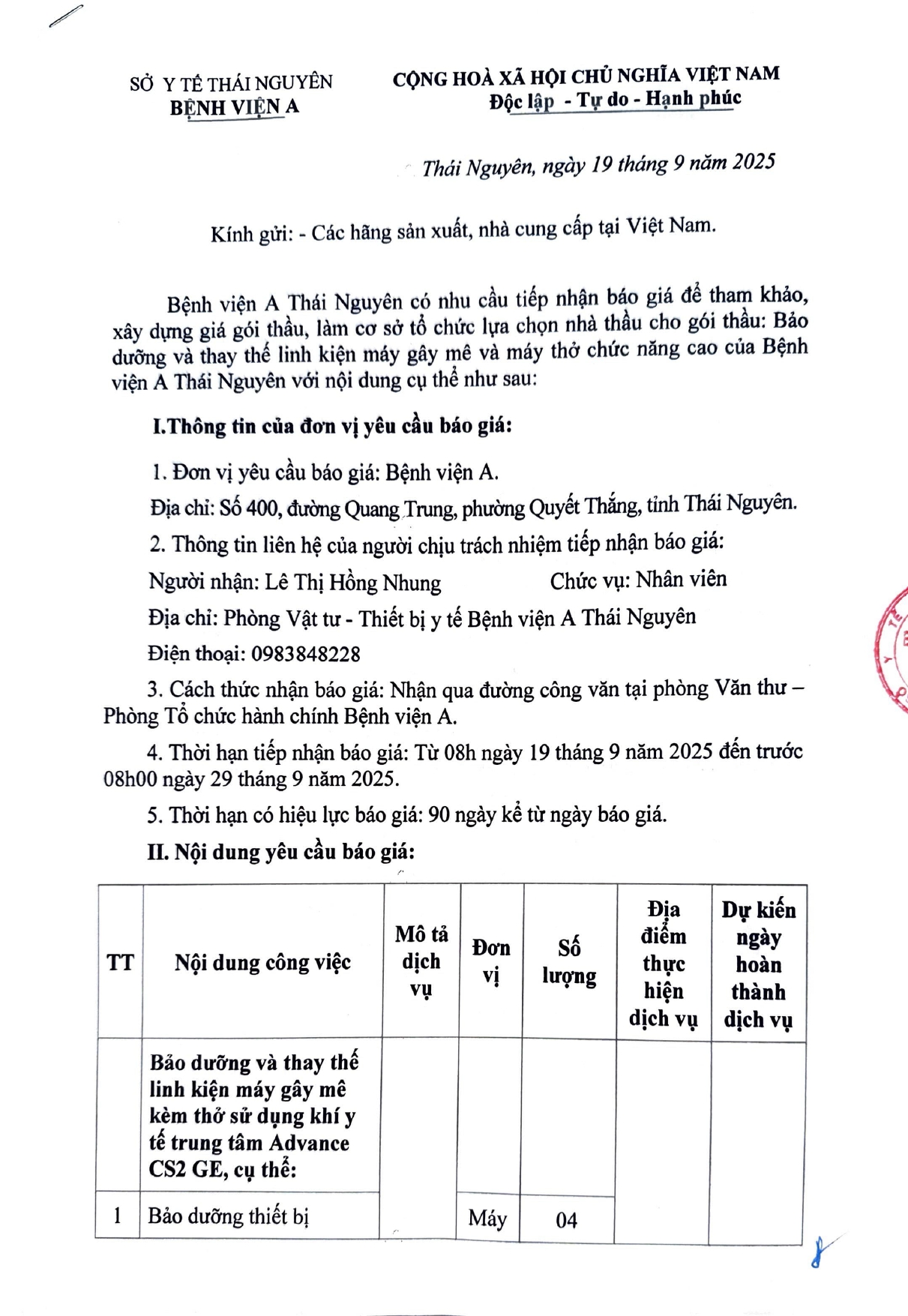 Thông báo mời chào giá gói thầu: Bảo dưỡng và thay thế linh kiện máy gây mê và máy thở chức năng cao của Bệnh viện A Thái Nguyên