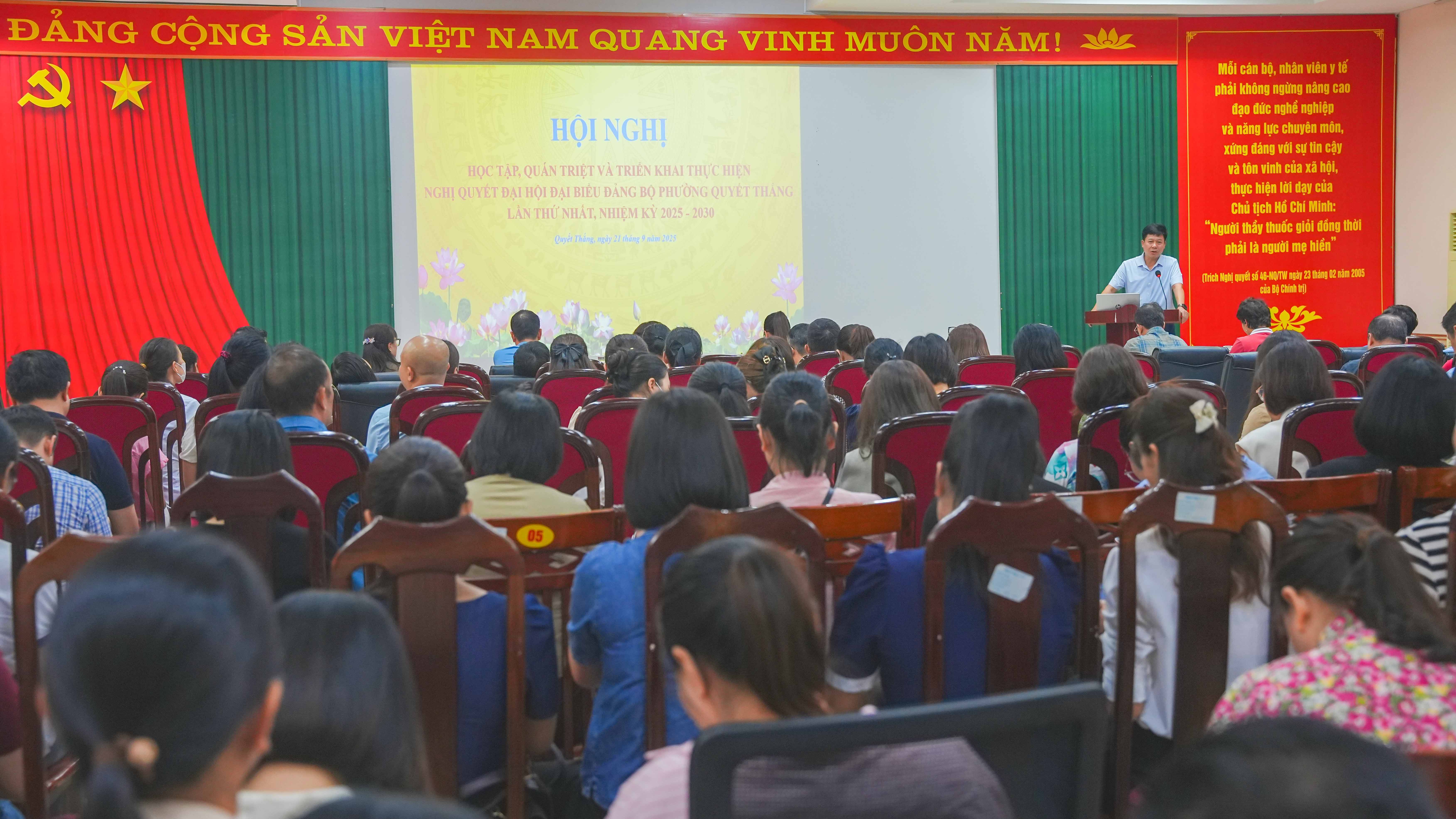 Ngày 21/9/2025, tại Hội trường lớn, Đảng bộ Bệnh viện A đã tổ chức Hội nghị học tập, quán triệt và triển khai thực hiện nghị quyết Đại hội Đại biểu Đảng bộ phường Quyết Thắng lần thứ nhất, nhiệm kỳ 2025-2030. Dự hội nghị có TTƯT. BSCKII Hà Hải Bằng – Bí thư Đảng ủy, Giám đốc bệnh viện cùng các đồng chí trong Ban Chấp hành Đảng bộ, 100% đảng viên của các Chi bộ trực thuộc.