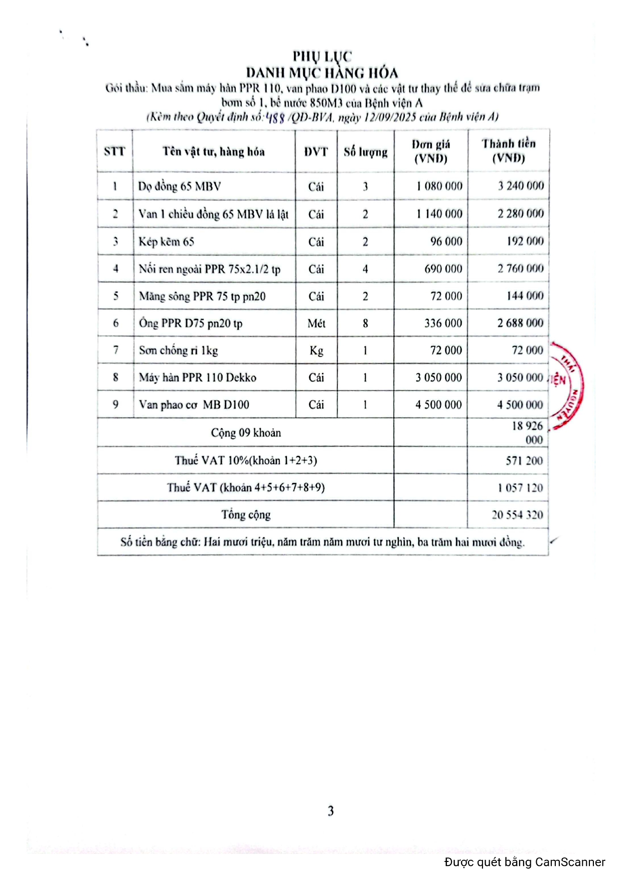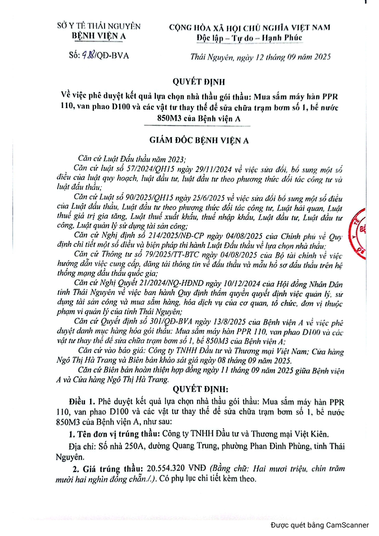 Quyết định về việc phê duyệt kết quả lựa chọn nhà thầu gói thầu: Mua sắm máy hàn PPR 110, van phao D100 và các vật tư thay thế để sửa chữa trạm bơm số 1, bể 850M3