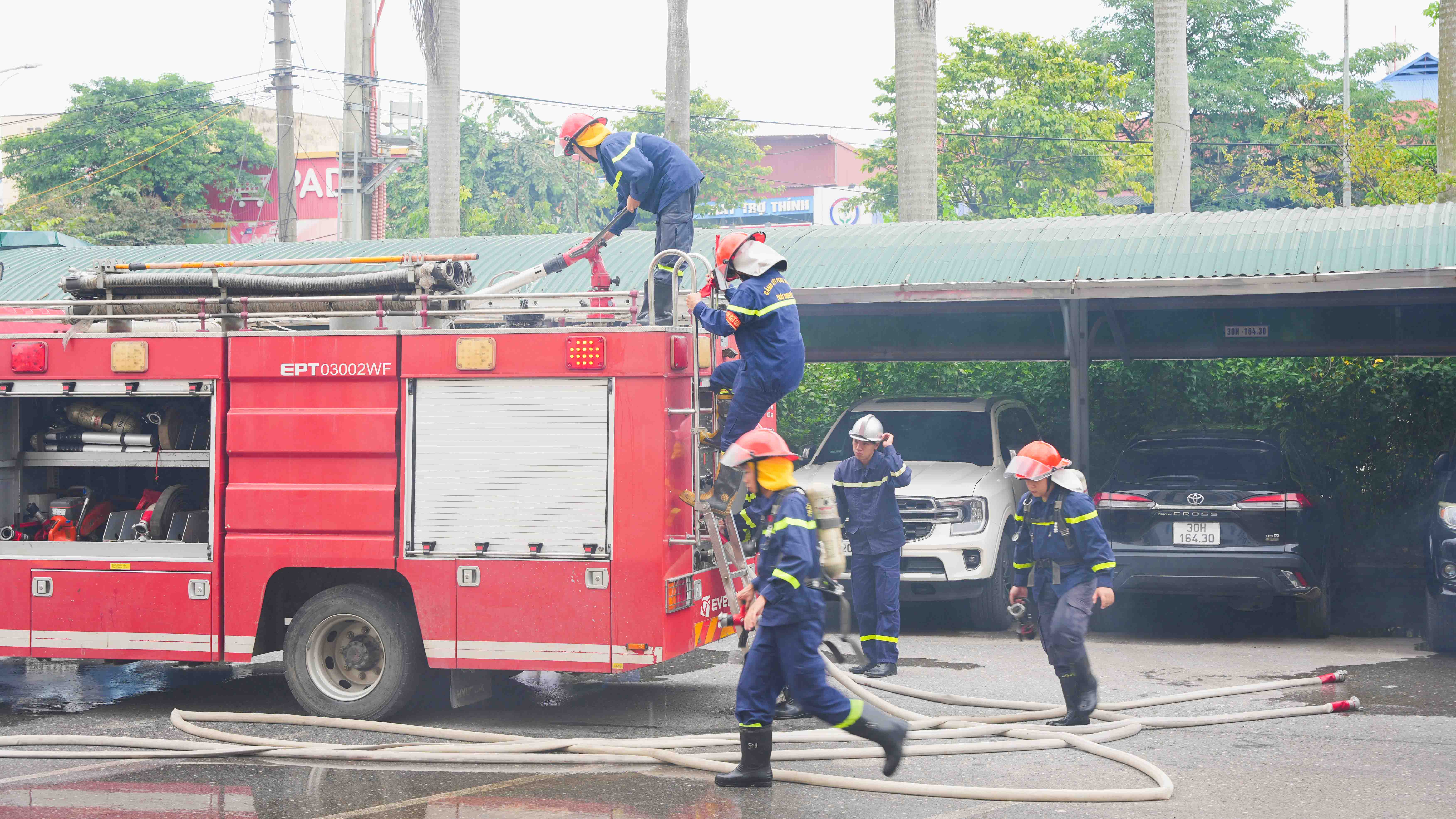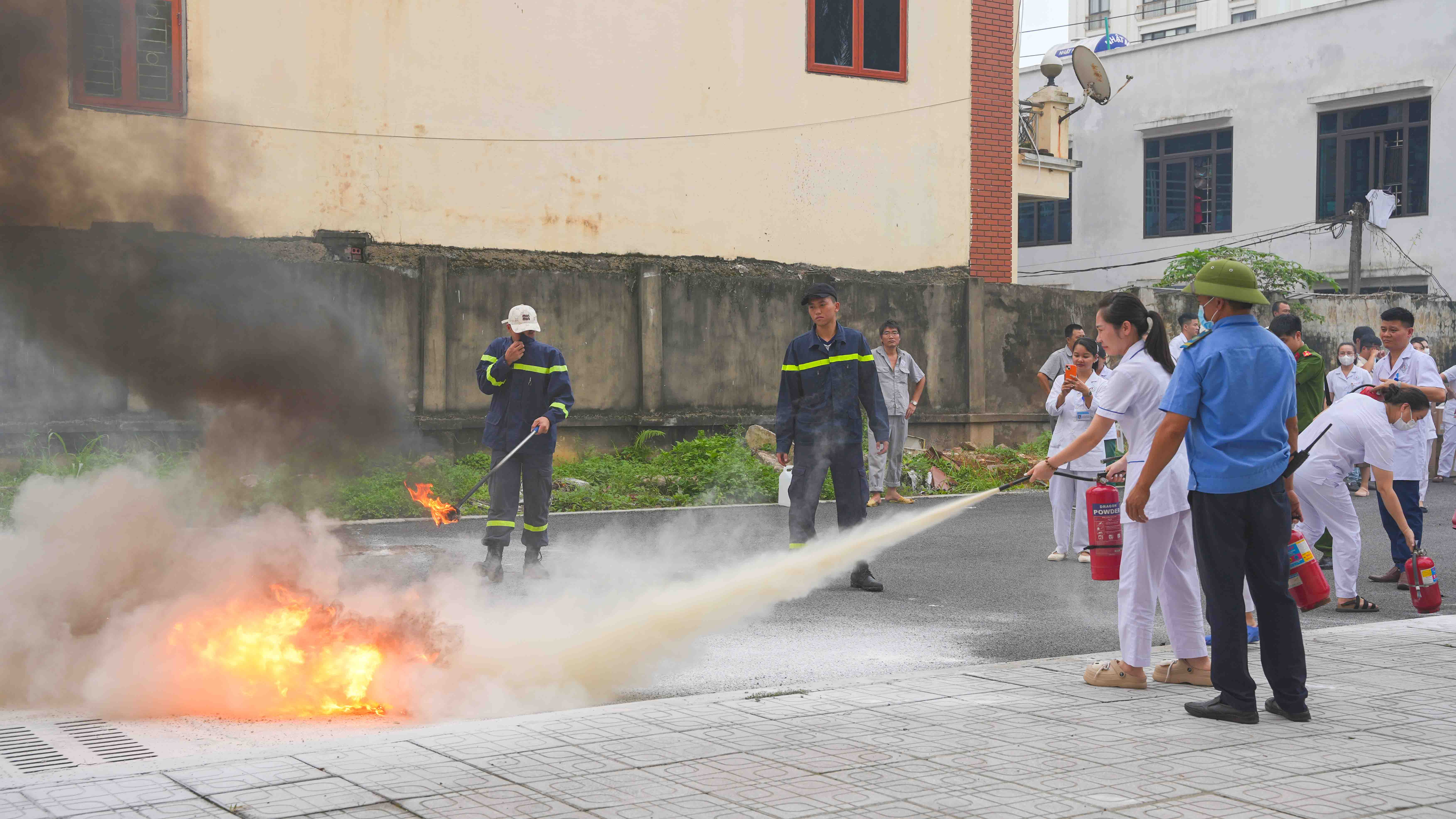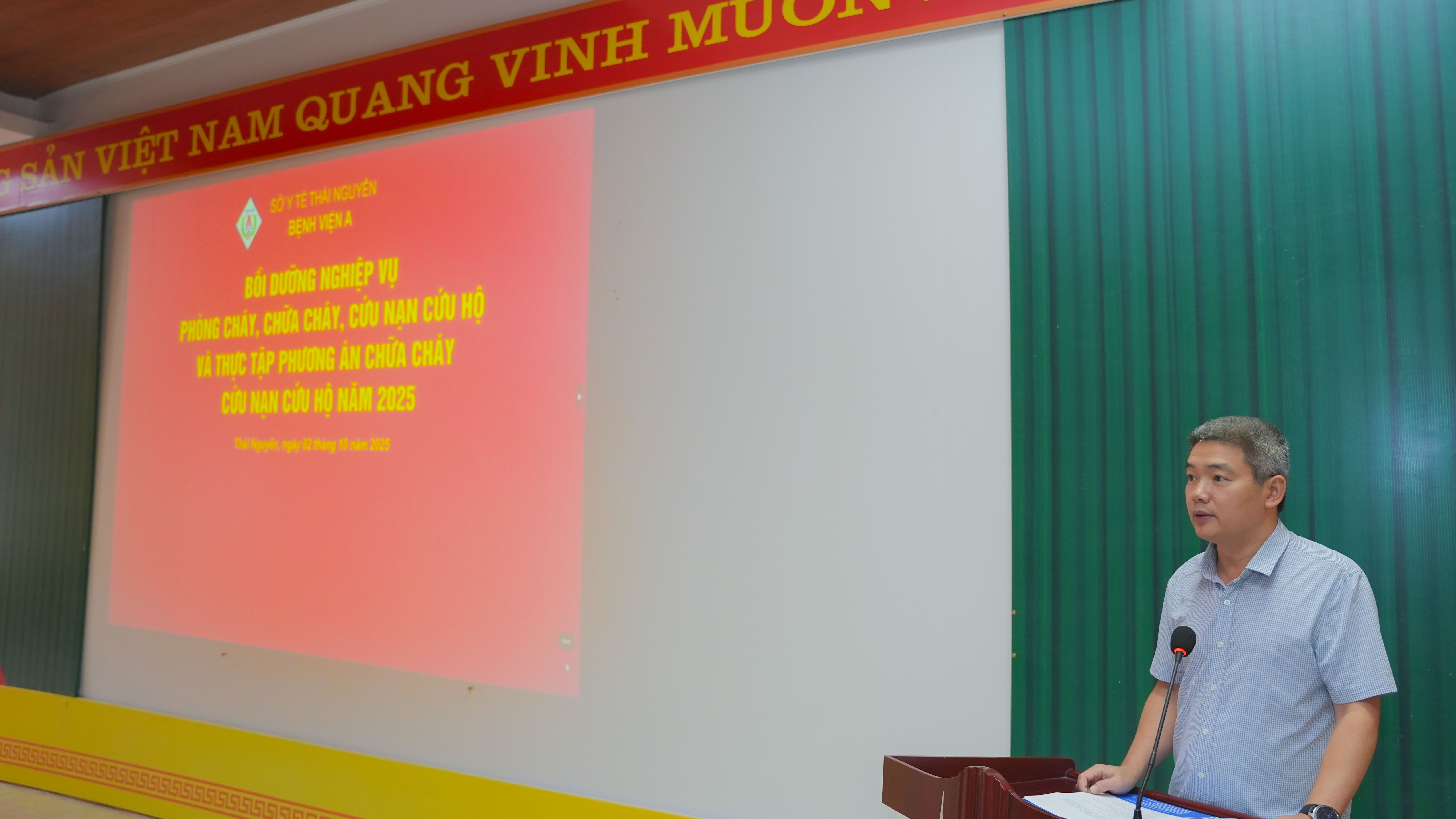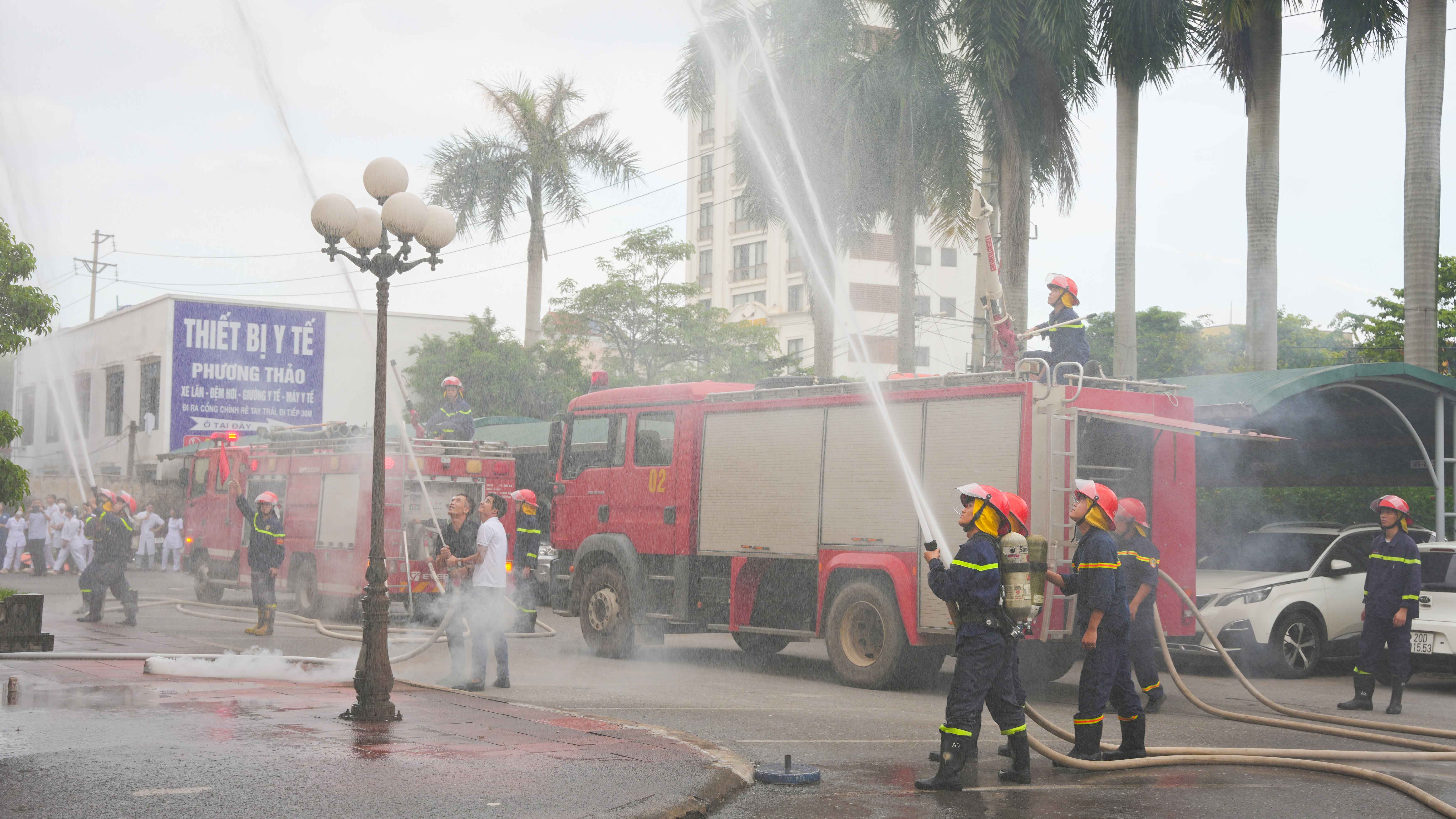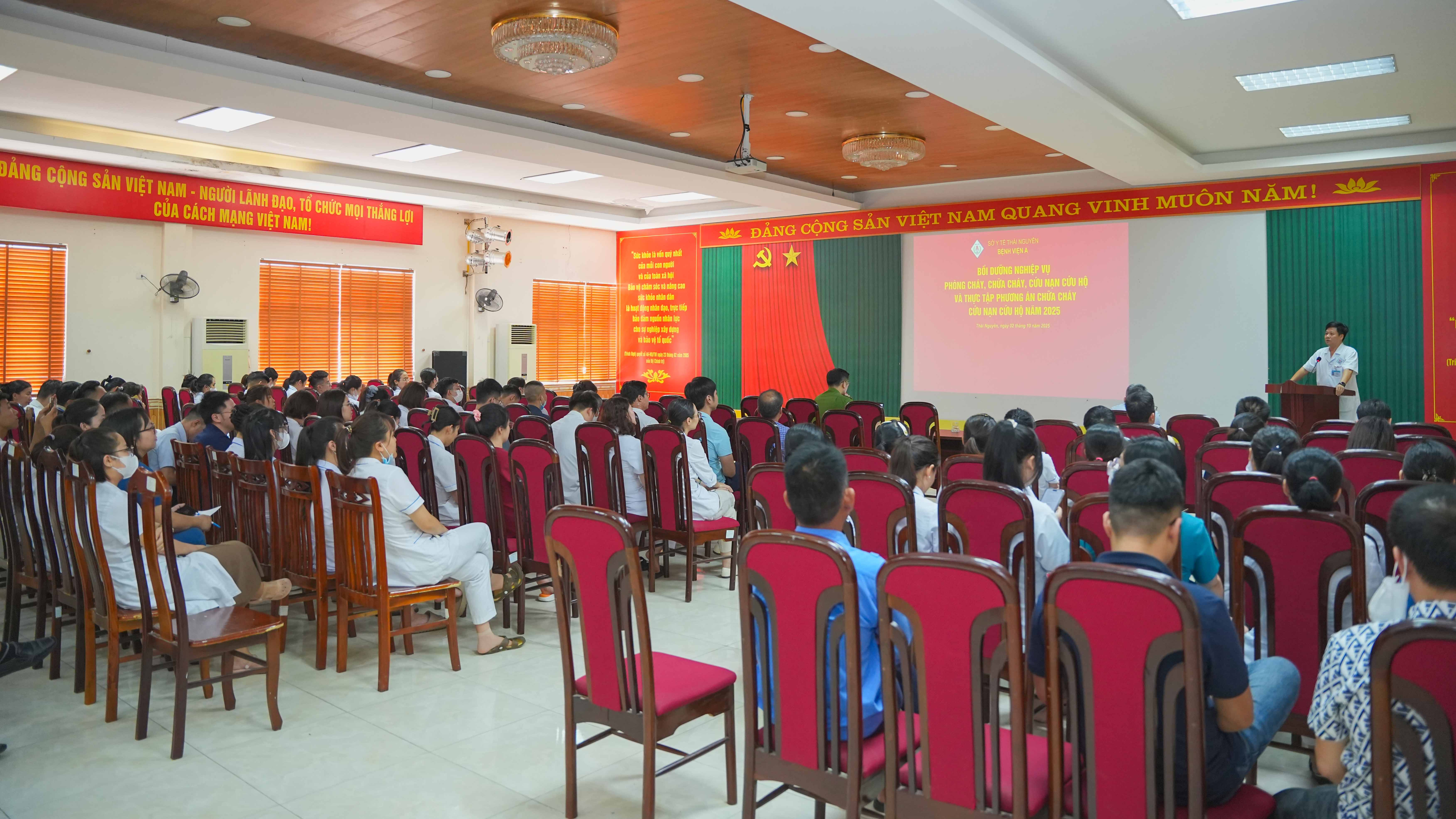 Theo đó ngày 2/10/2025, Bệnh viện A tổ chức thực tập phương án phòng cháy chữa cháy và cứu nạn, cứu hộ năm 2025 cho gần 100 đội viên đội PCCC&CNCH của Bệnh viện. Nội dung buổi tập huấn gồm hai phần, phần lý thuyết và phần thực hành. Trong đó, phần lý thuyết các học viên được cung cấp những văn bản pháp quy về công tác PCCC&CNCH như Luật PCCC & CNCH, Nghị định 105/2025/NĐ-CP, Nghị định 106/2025/NĐ-CP và Thông tư 36/2025/TT-BCA; học viên được thông tin về tình hình cháy, nổ trên địa bàn cả nước và trên địa bàn tỉnh Thái Nguyên. Qua đó, mọi cán bộ, viên chức, người lao động hiểu rõ trách nhiệm và nghĩa vụ của mình trong phòng cháy và chữa cháy đồng thời nêu cao tinh thần phòng ngừa, đảm bảo an toàn PCCC tại đơn vị, nắm được một số biện pháp, giải pháp đảm bảo an toàn PCCC&CNCH tại cơ sở; quy trình cứu chữa một vụ cháy, nổ, biện pháp, giải pháp thoát nạn; hình thức, cách thức, phương pháp, nội dung tập huấn theo hướng thực chất, hiệu quả, nhất là tập huấn, hướng dẫn kỹ năng về phòng cháy, báo cháy, chữa cháy, thoát hiểm cho nhân viên và người bệnh ở các tòa nhà khi có sự cố xảy ra.