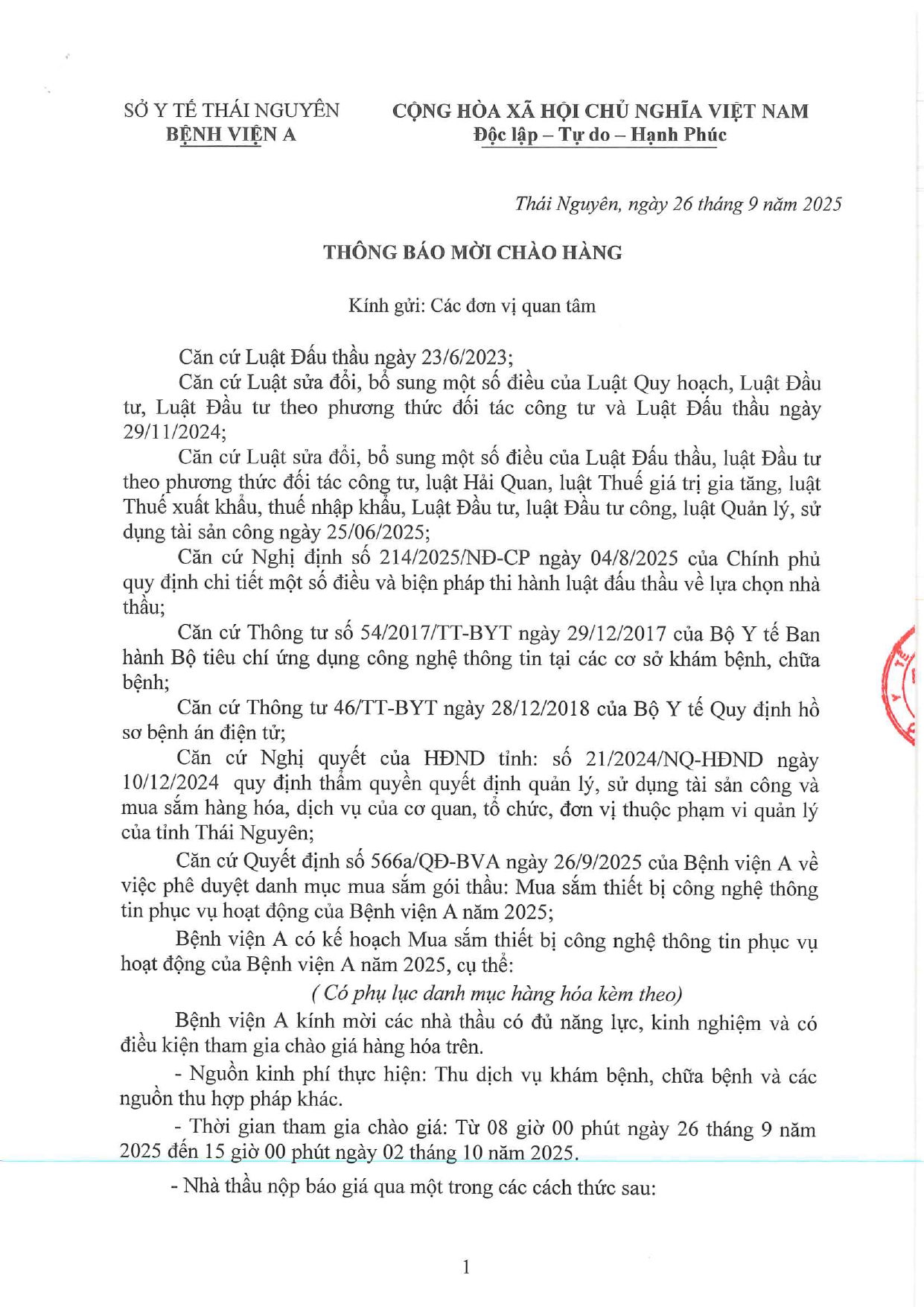 - Quyết định về việc phê duyệt kế hoạch lựa chọn nhà thầu dự toán mua sắm cho gói thầu: Mua sắm dép nhựa, ghế đẩu nhựa, xô nhựa, thùng rác, thùng nhựa các loại và đồ dùng vật rẻ tiền khác cho Bệnh viện A ( 03/10/2025)