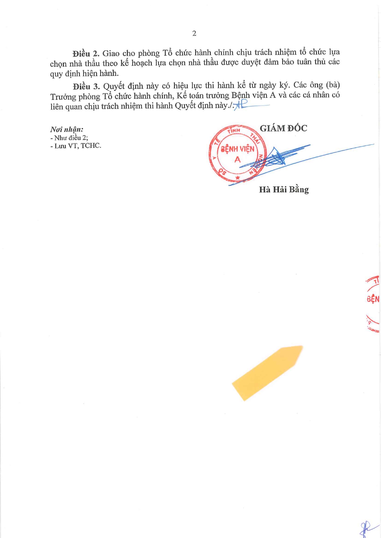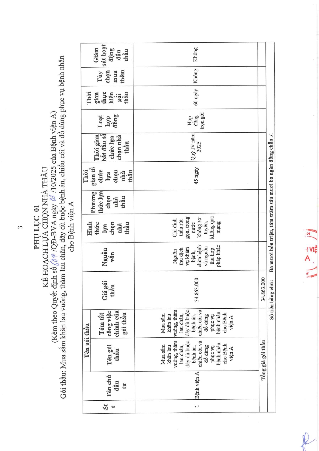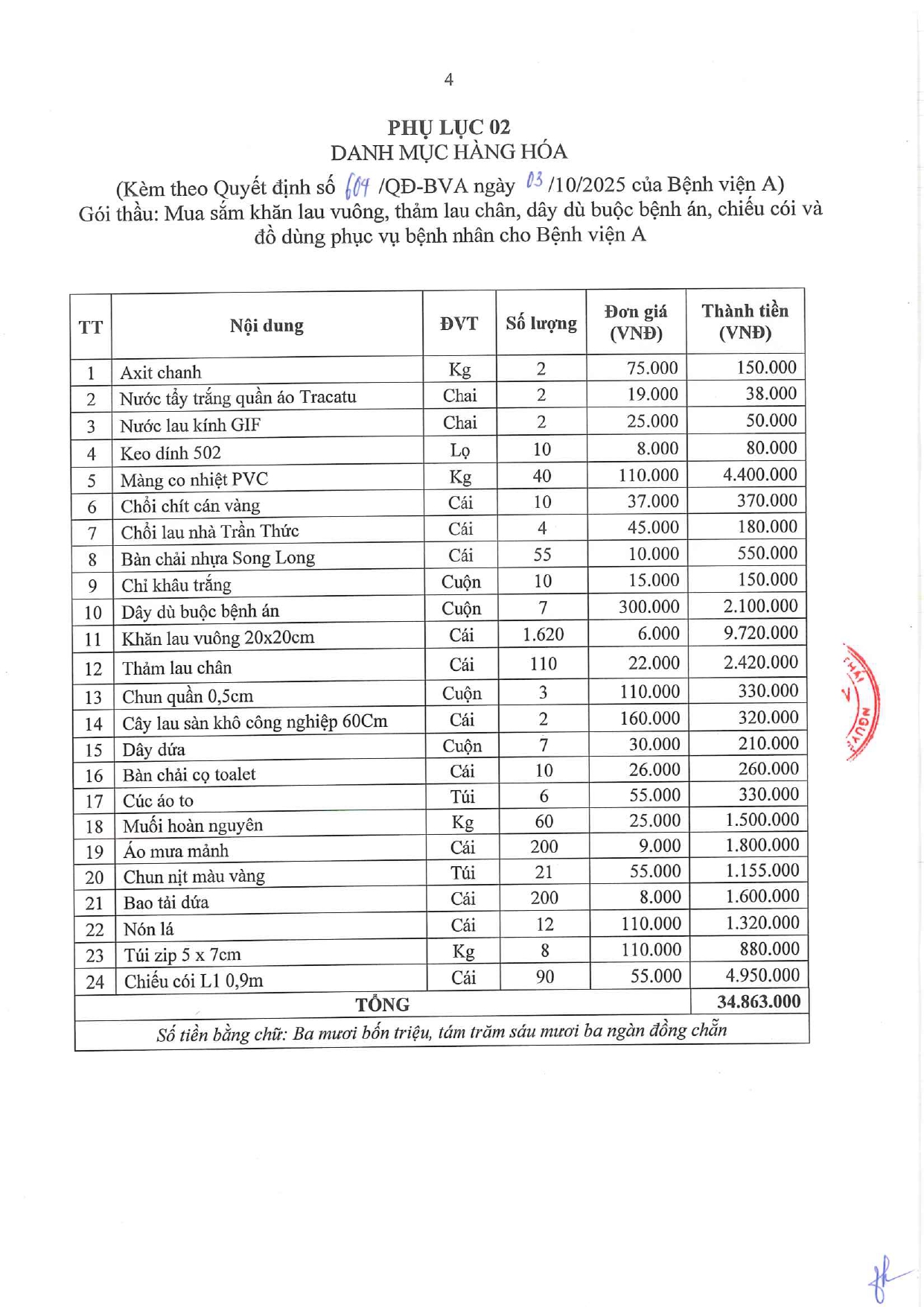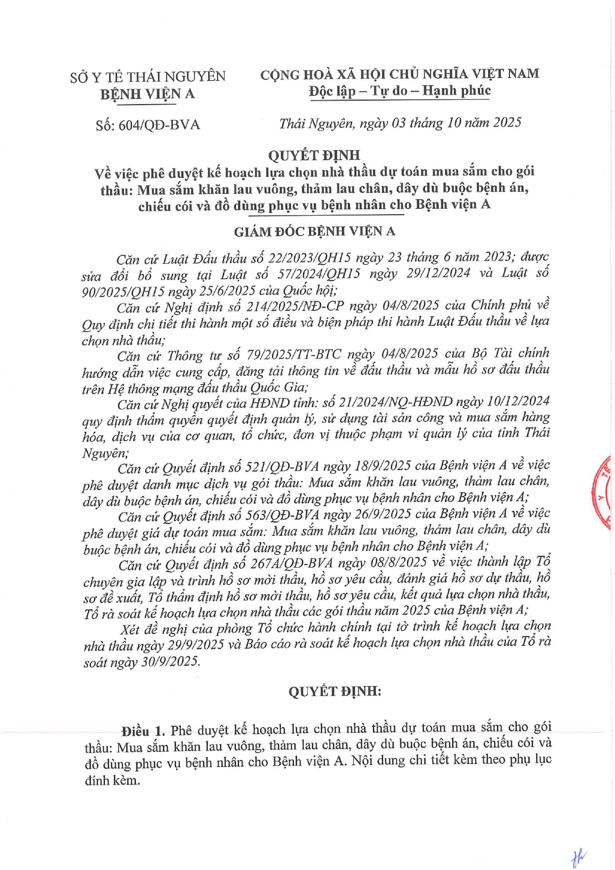 - Quyết định về việc phê duyệt kế hoạch lựa chọn nhà thầu của gói thầu: Mua sắm khăn lau vuông, thảm lau chân, dây dù buộc bệnh án, chiếu cói và đồ dùng phục vụ bệnh nhân cho Bệnh viện A ( 08/10/2025)