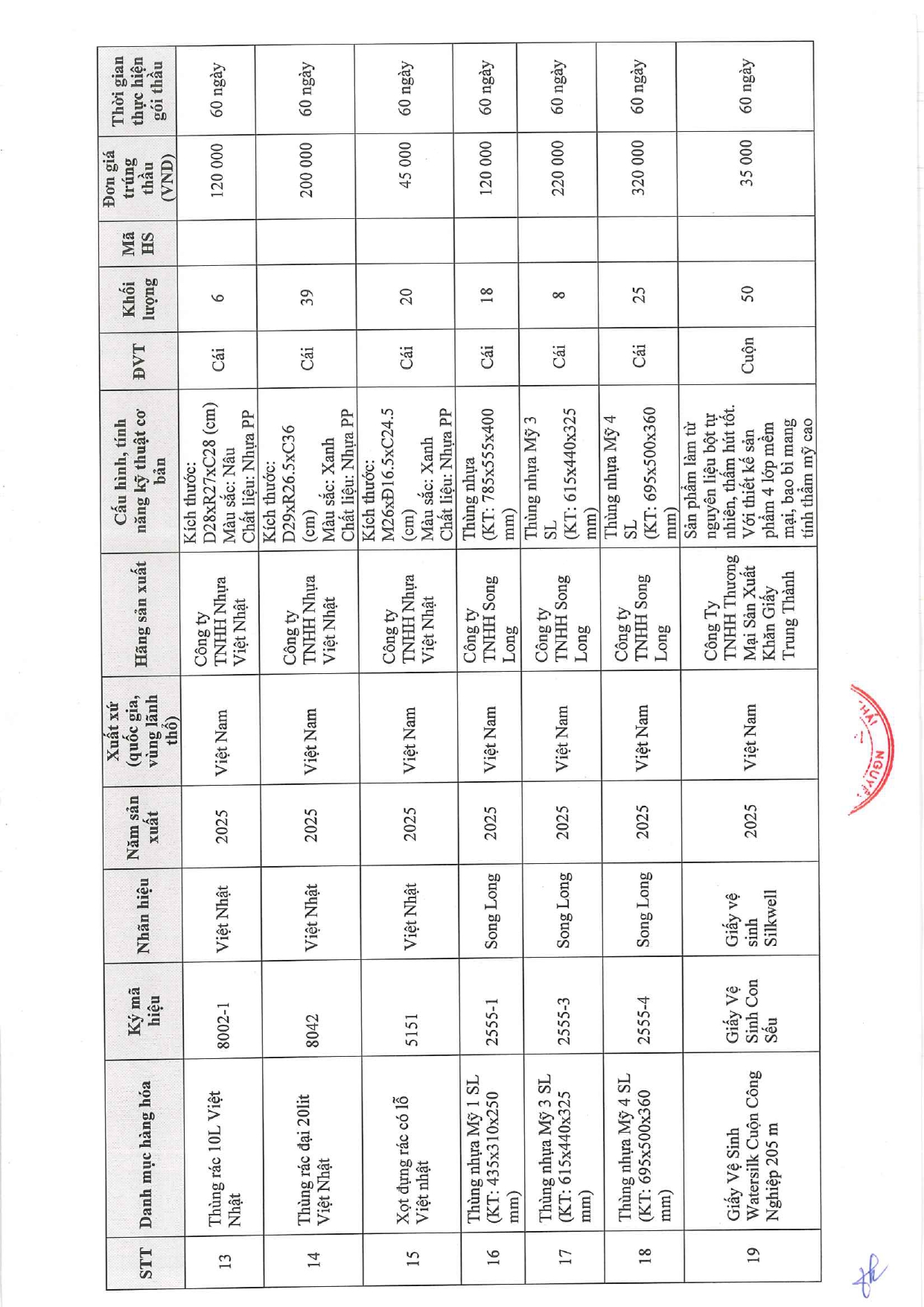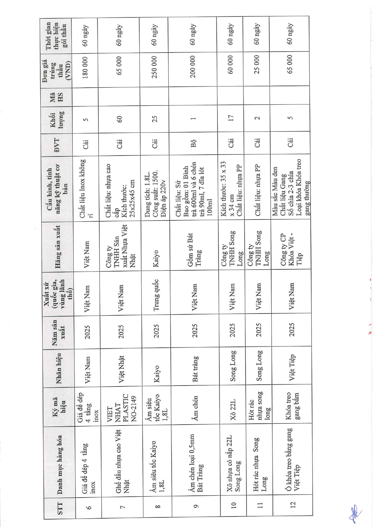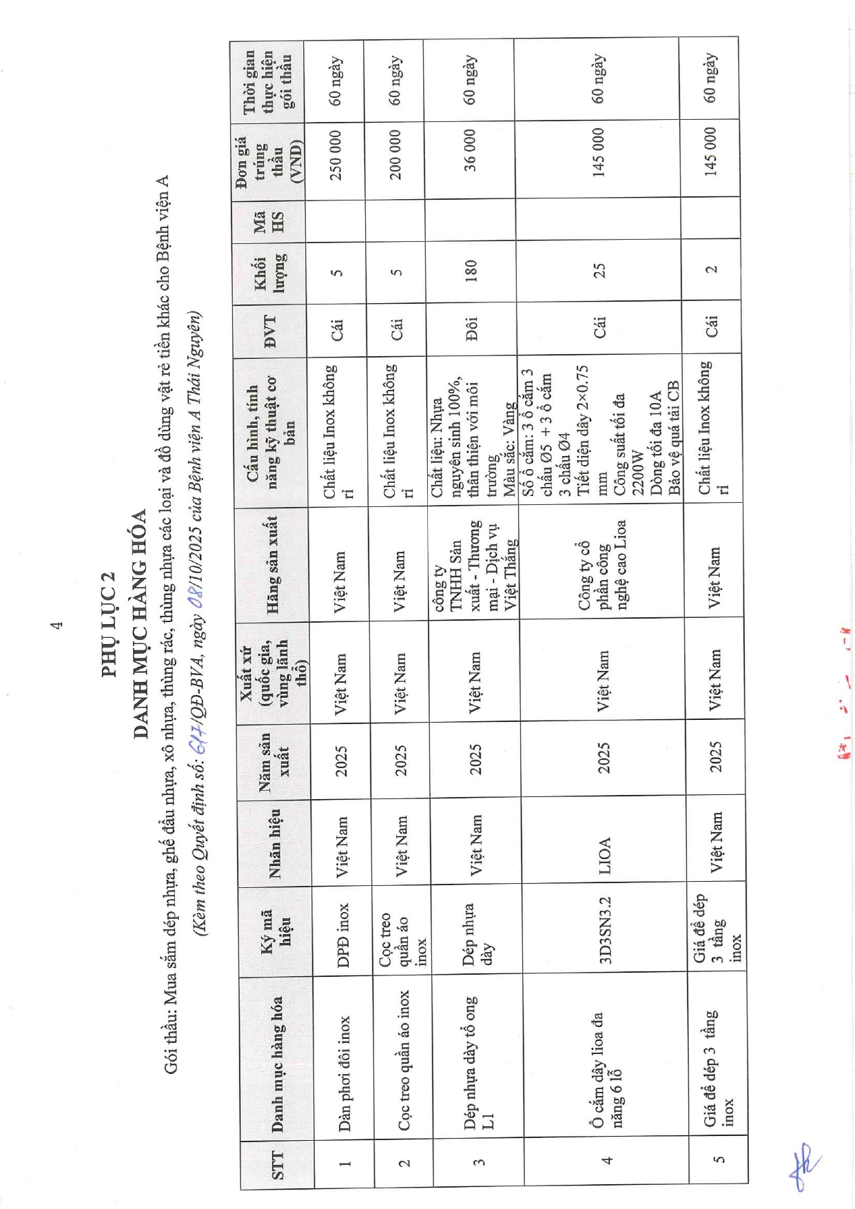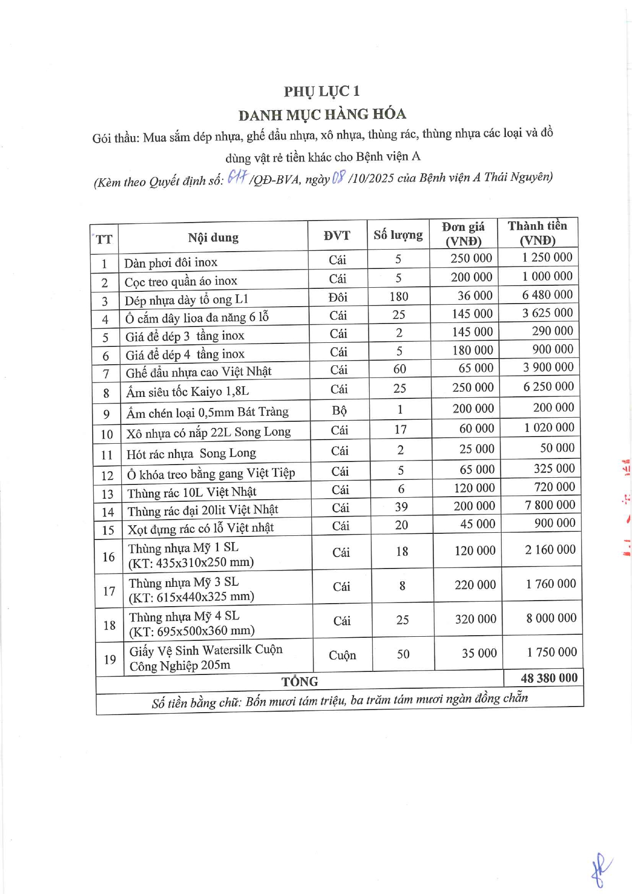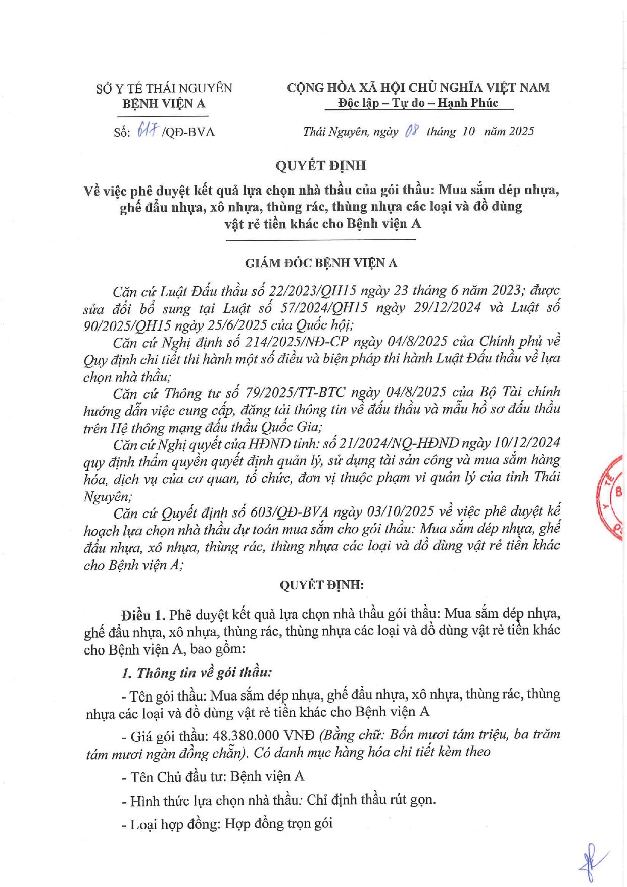 - Quyết định về việc phê duyệt kế hoạch lựa chọn nhà thầu dự toán mua sắm cho gói thầu: Mua sắm dép nhựa, ghế đẩu nhựa, xô nhựa, thùng rác, thùng nhựa các loại và đồ dùng vật rẻ tiền khác cho Bệnh viện A ( 03/10/2025)