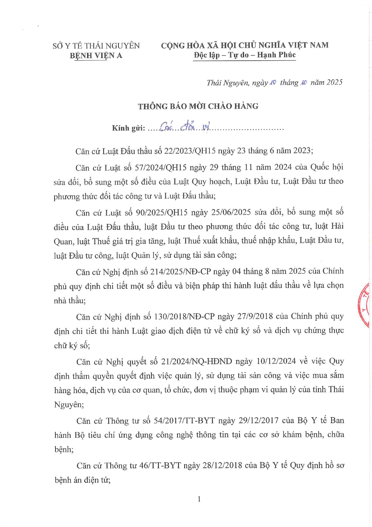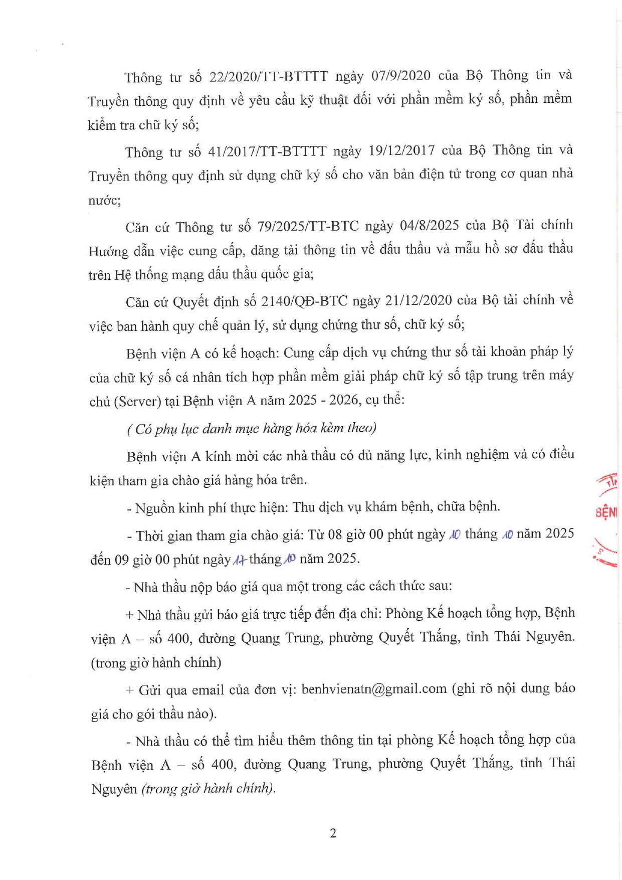 • Thông báo mời chào hàng gói thầu: Mua phụ kiện máy in phục vụ công tác chuyên môn khám chữa bệnh tại Bệnh viện A ( 10/10/2025)