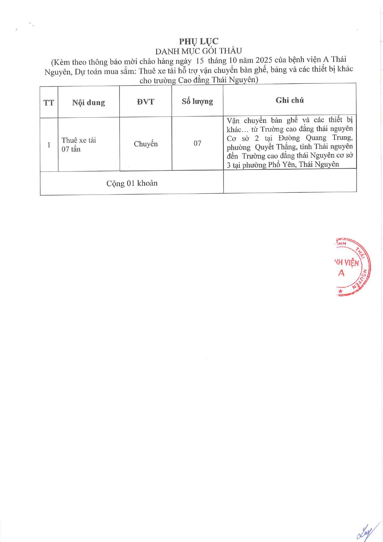 Thông báo mời chào giá gói thầu: Thuê xe tải hỗ trợ vận chuyển bàn ghế, bảng và các thiết bị khác cho trường Cao đẳng Thái Nguyên