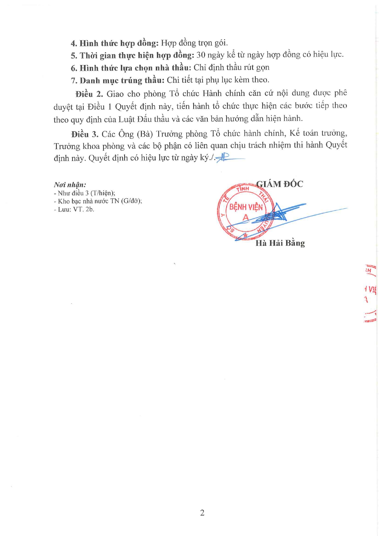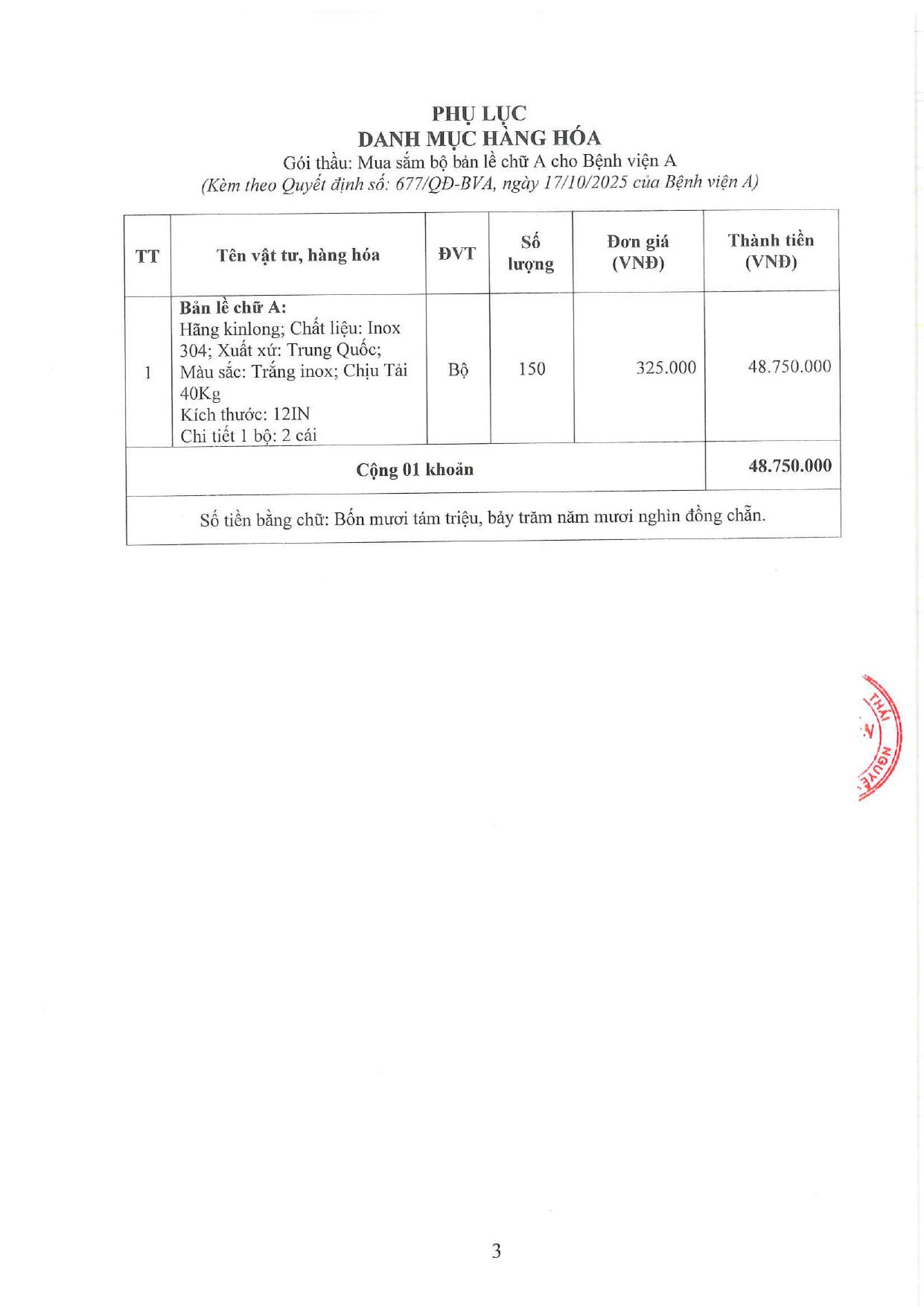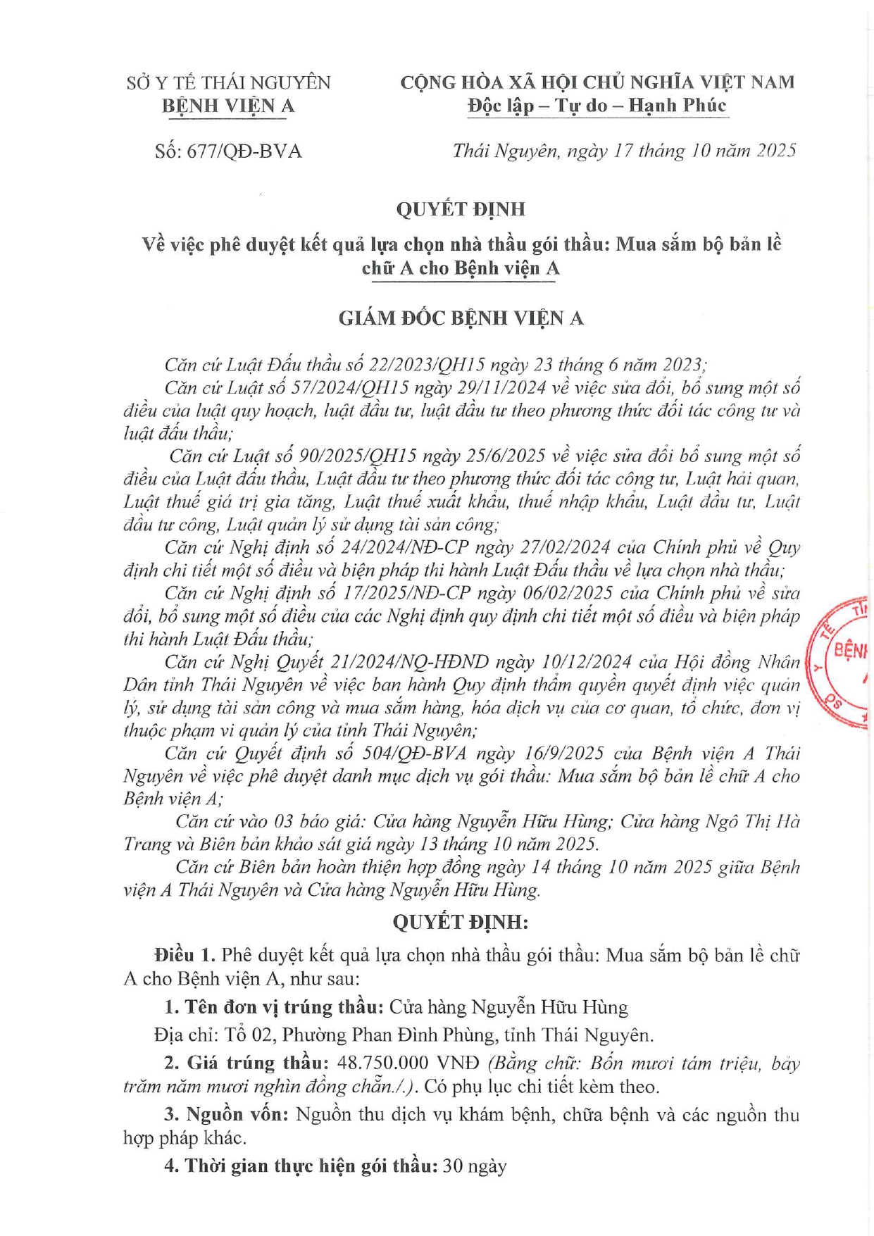Quyết định về việc phê duyệt kết quả lựa chọn nhà thầu gói thầu: Mua sắm bộ bản lề chữ A cho Bệnh viện A