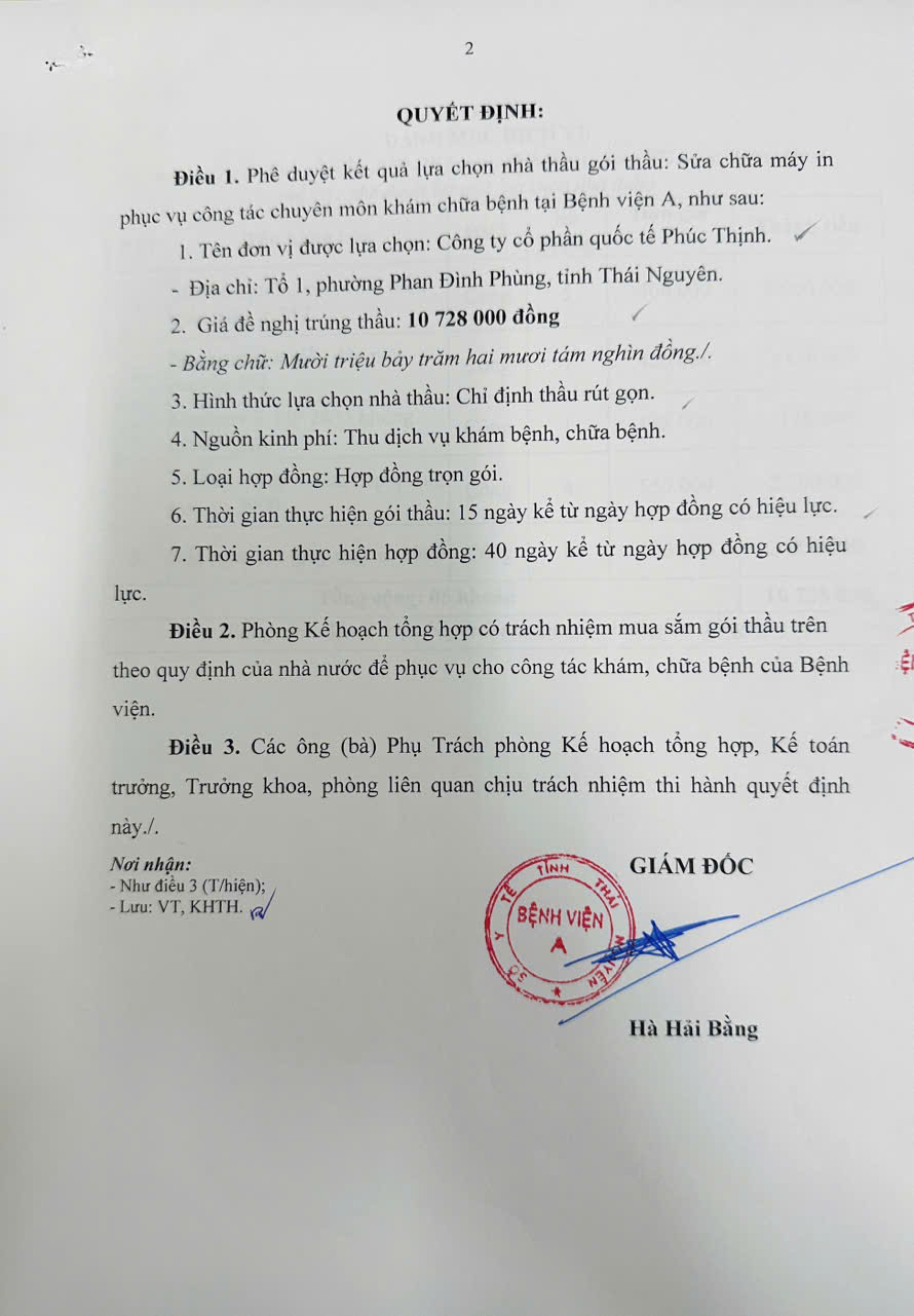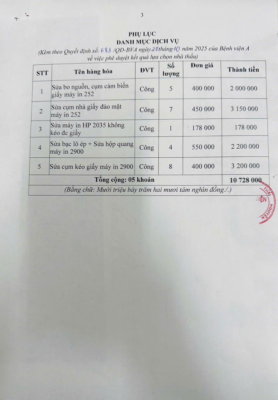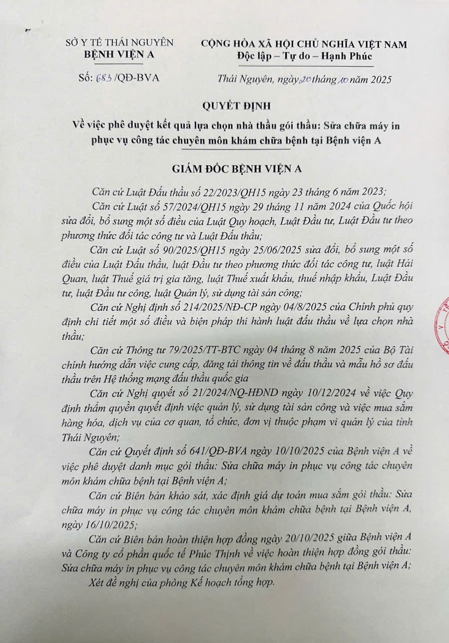 Quyết định về việc phê duyệt kết quả lựa chọn nhà thầu gói thầu: Sửa chữa máy in phục vụ công tác chuyên môn khám chữa bệnh tại Bệnh viện A