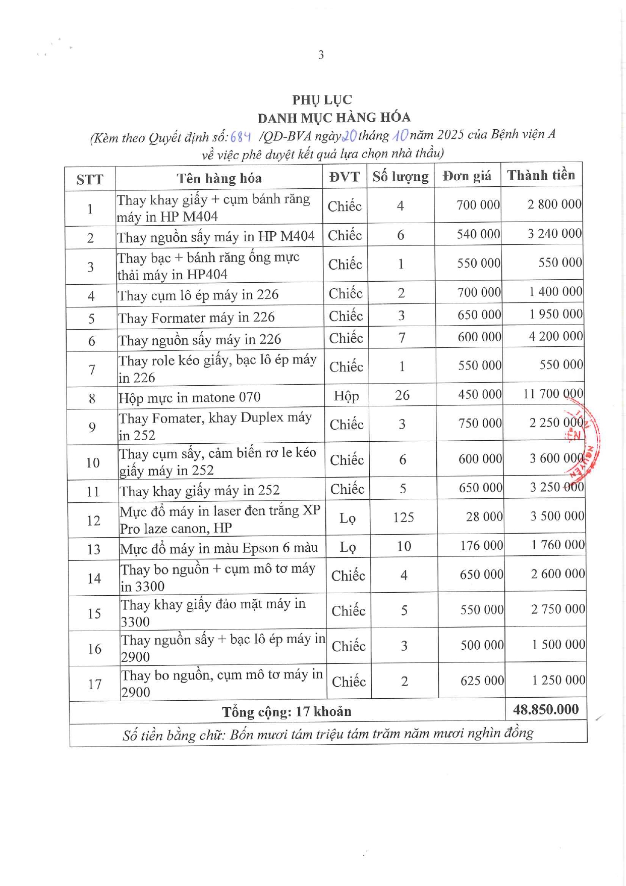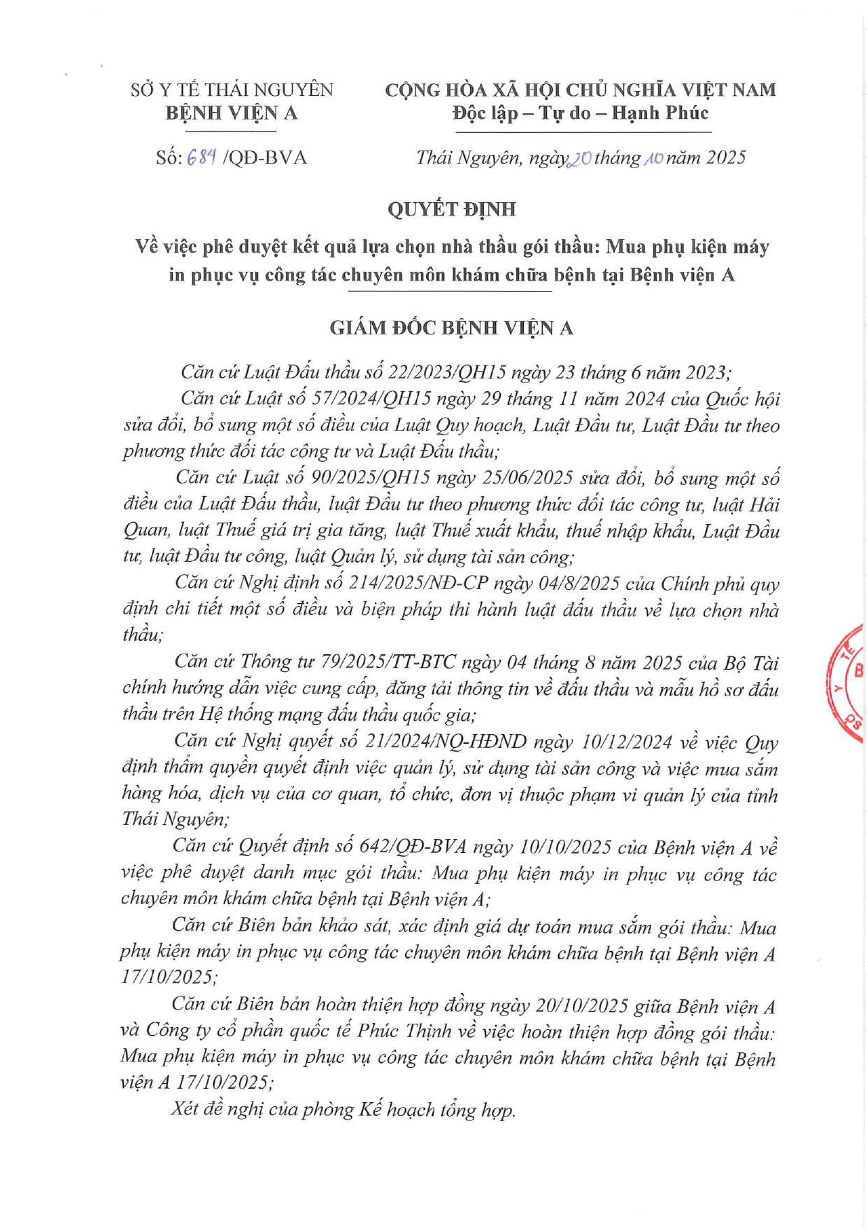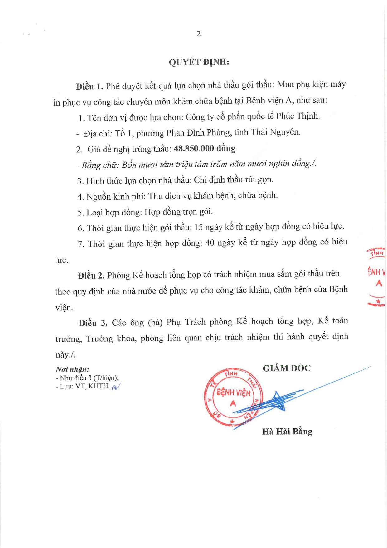 Quyết định về việc phê duyệt kết quả lựa chọn nhà thầu gói thầu: Mua phụ kiện máy in phục vụ công tác chuyên môn khám chữa bệnh tại Bệnh viện A
