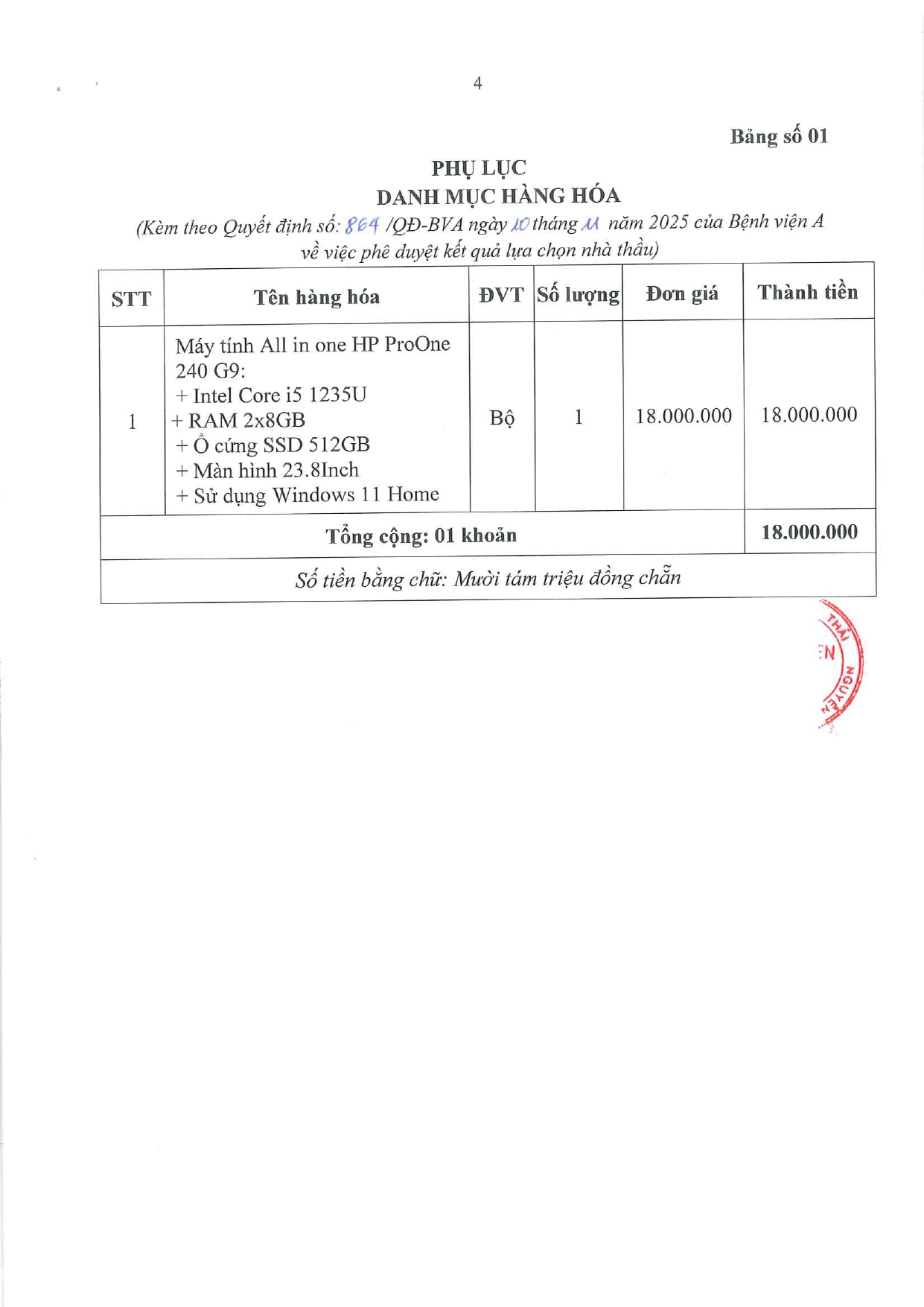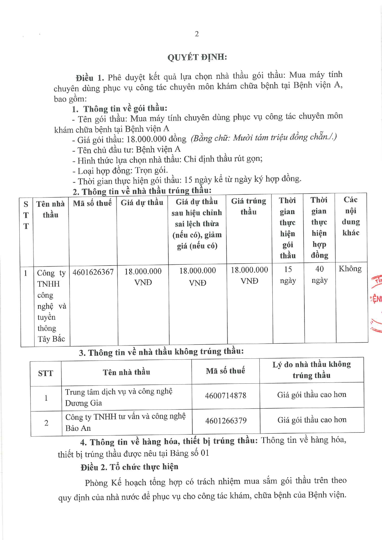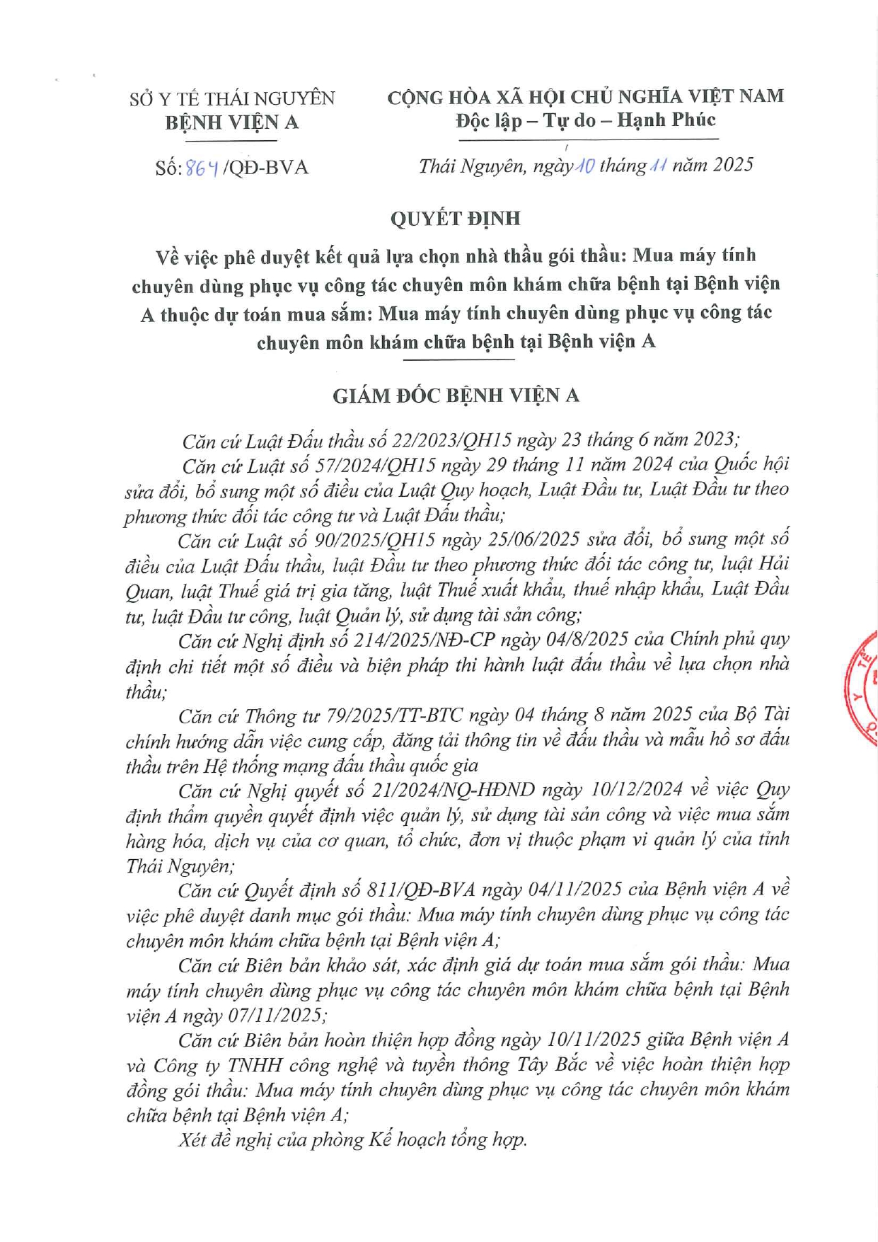 Quyết định về việc phê duyệt kết quả lựa chọn nhà thầu gói thầu: Mua máy tính chuyên dùng phục vụ công tác chuyên môn khám chữa bệnh tại Bệnh viện A