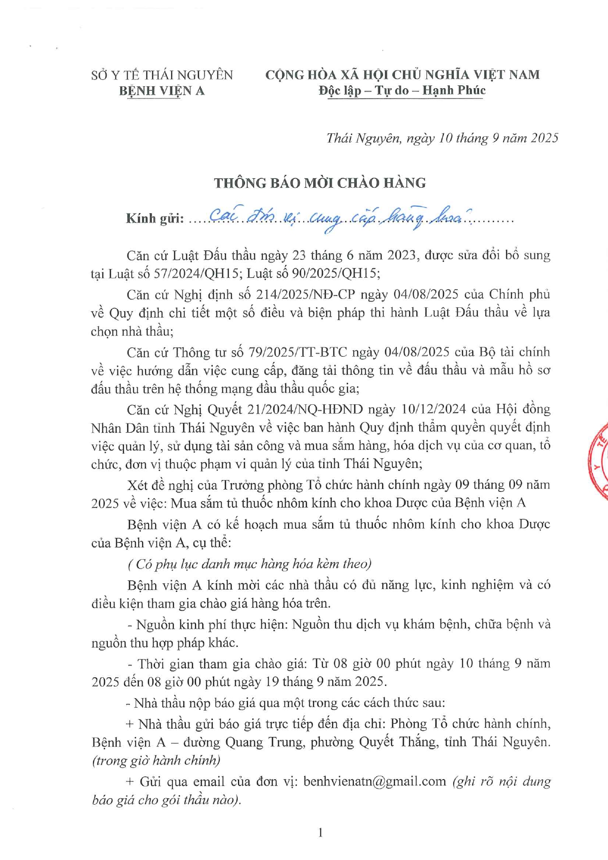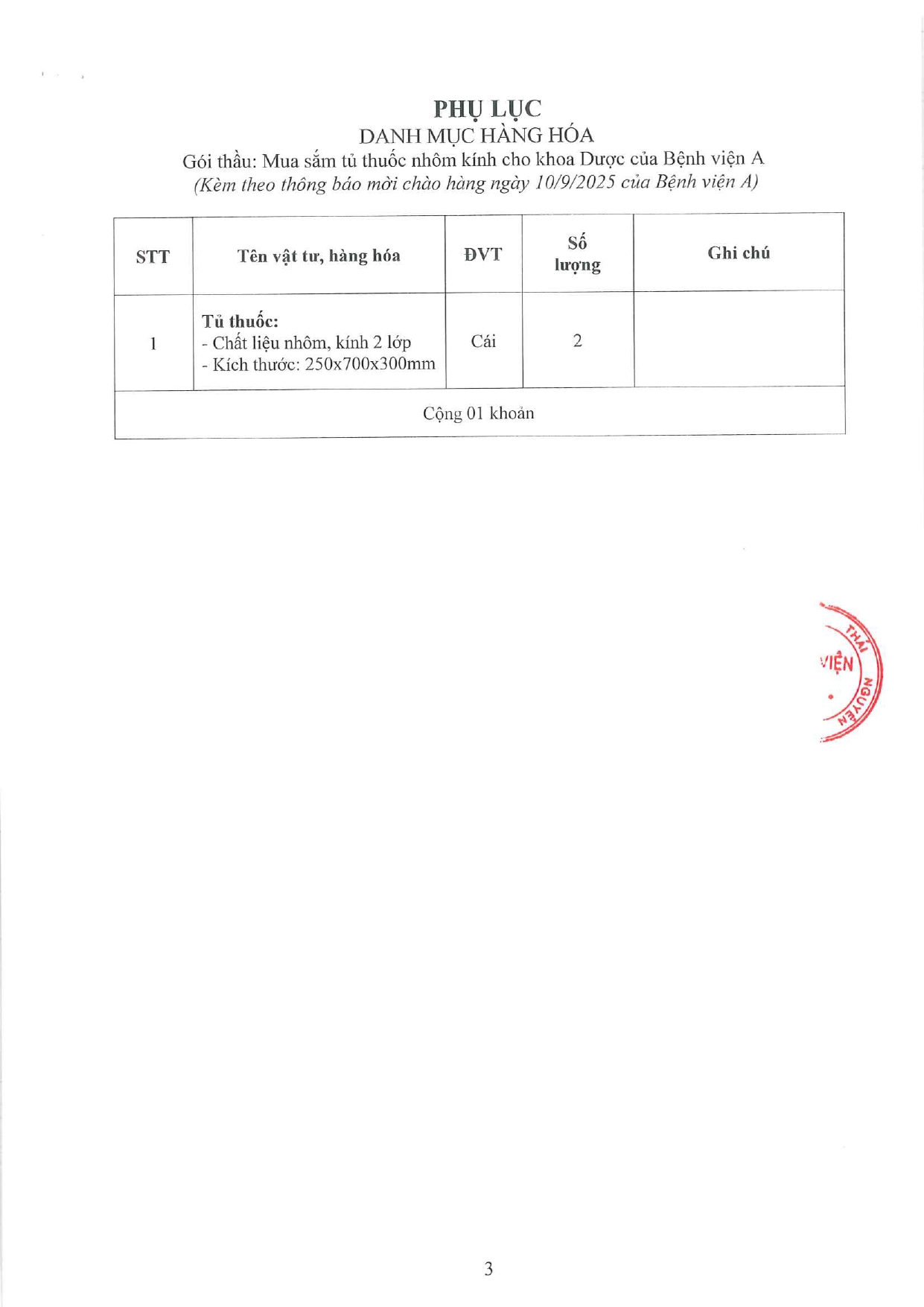 Thông báo mời chào hàng gói thầu: Mua sắm tủ thuốc nhôm kính cho khoa Dược của Bệnh viện A