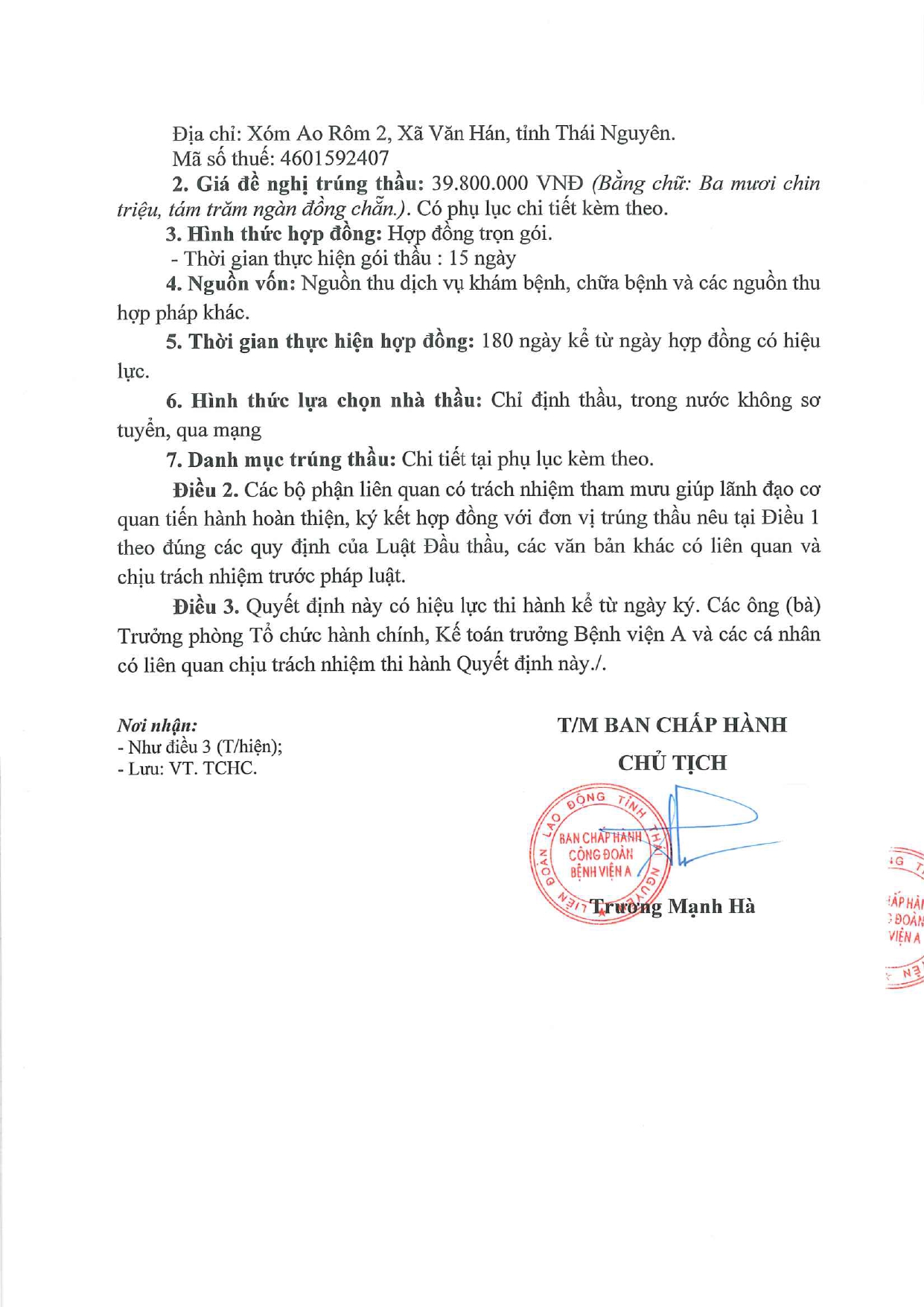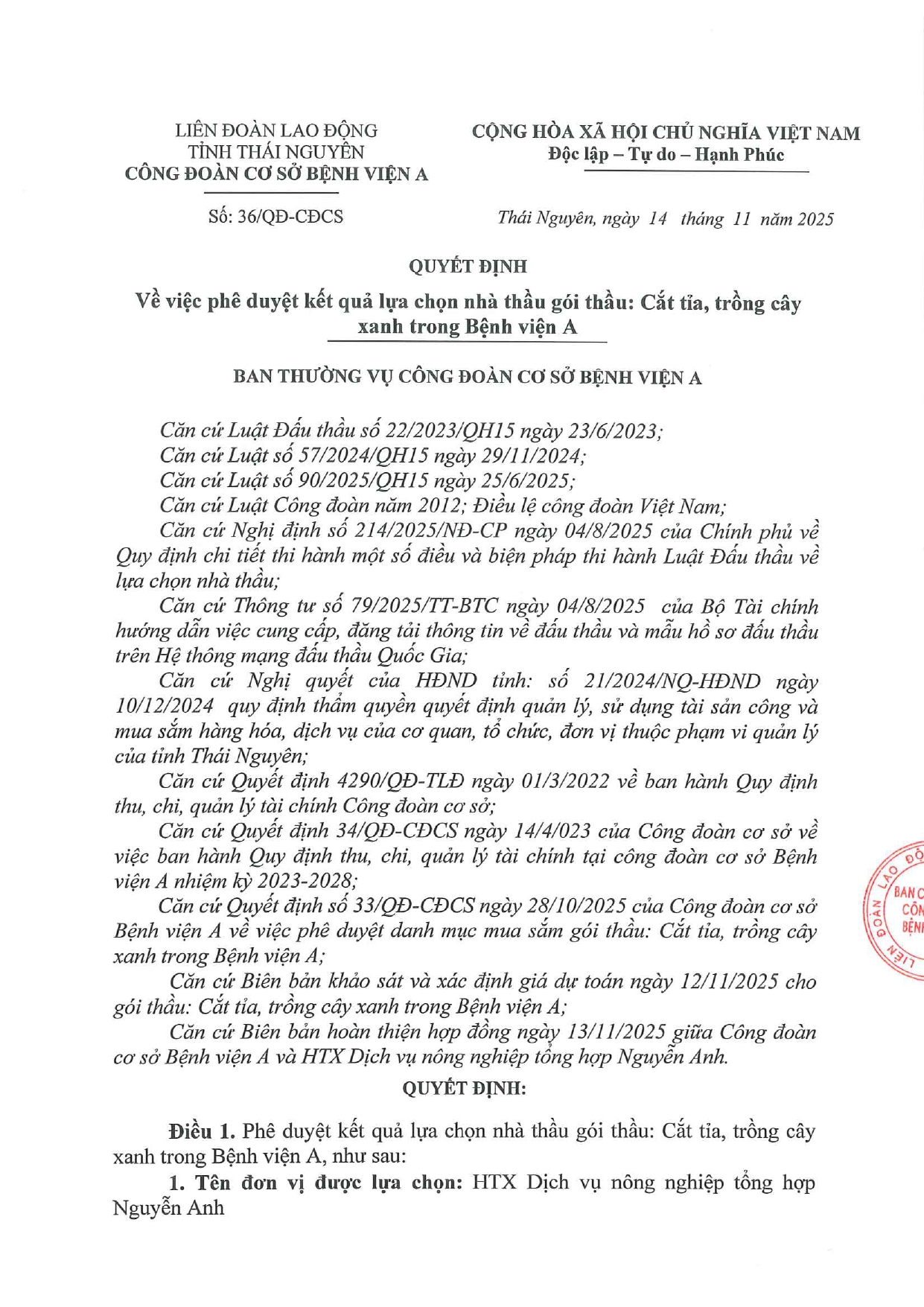 Quyết định về việc phê duyệt kết quả lựa chọn nhà thầu gói thầu: Cắt tỉa, trồng cây xanh trong Bệnh viện A