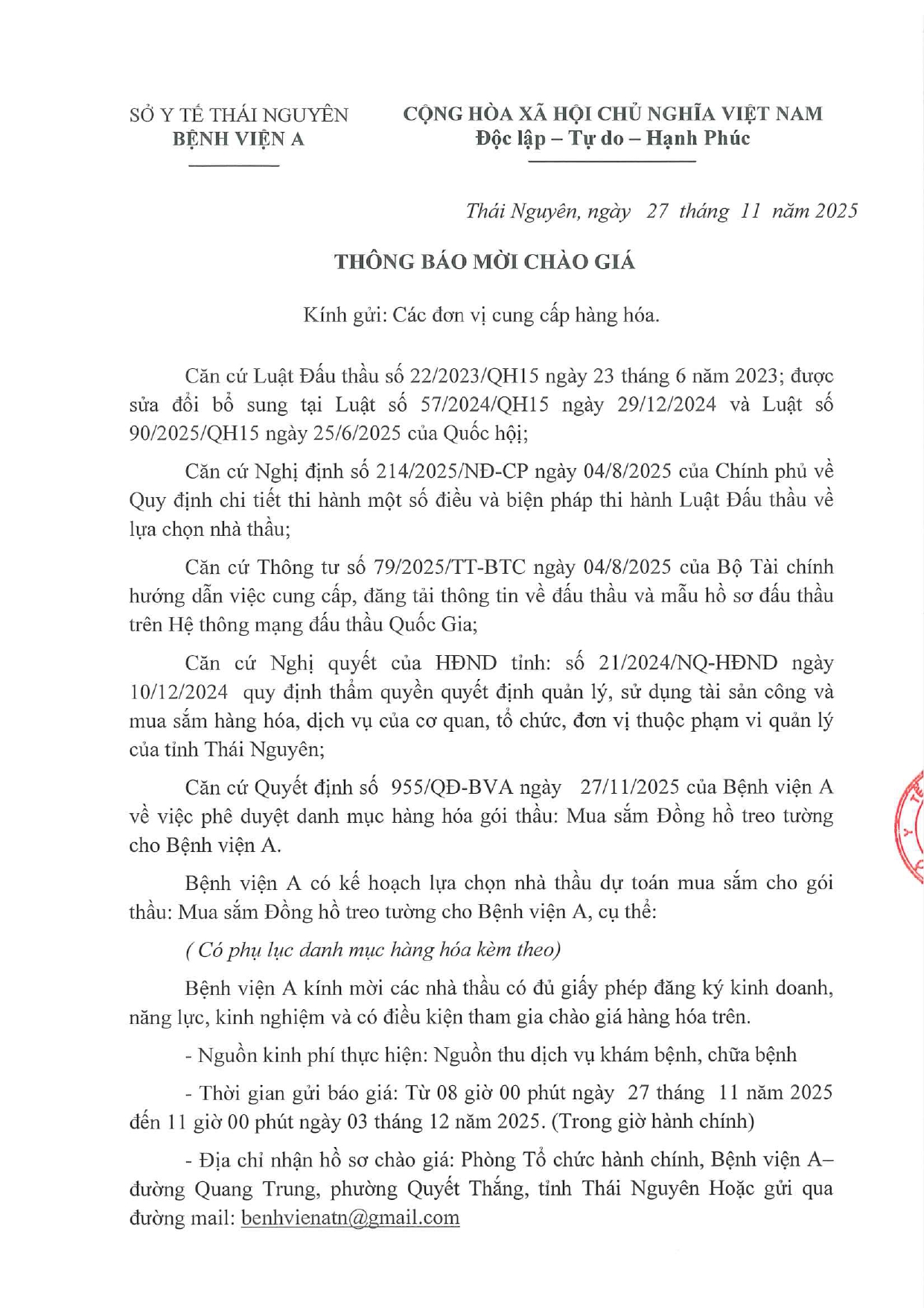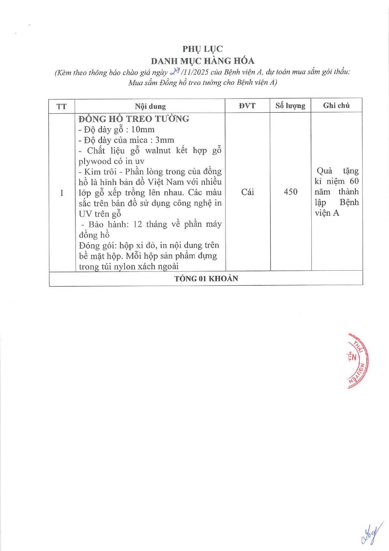 Thông báo mời chào giá gói thầu: Mua sắm đồng hồ treo tường cho Bệnh viện A