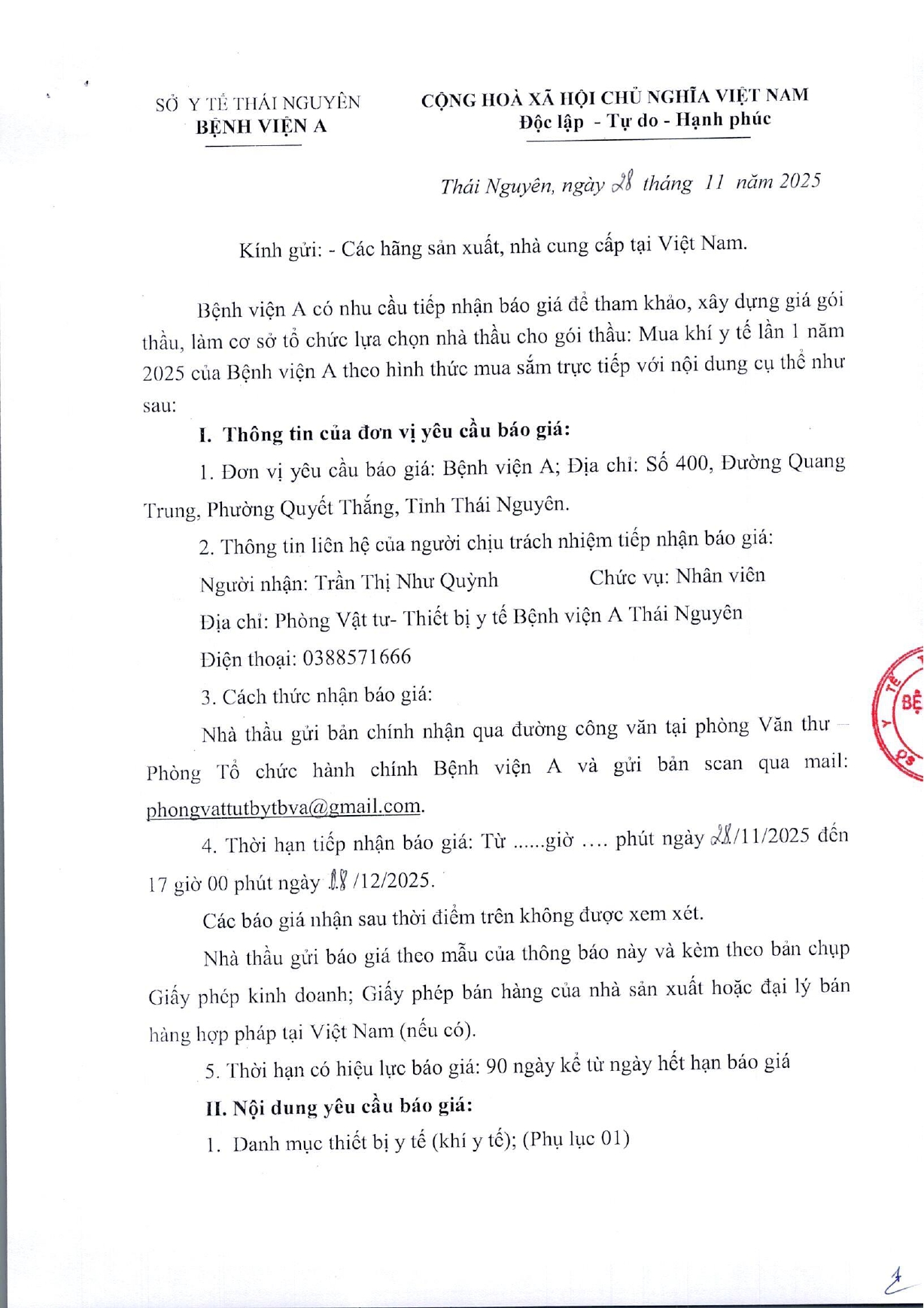 Thông báo mời chào giá gói thầu: Mua khí y tế lần 1 năm 2025 của Bệnh viện A