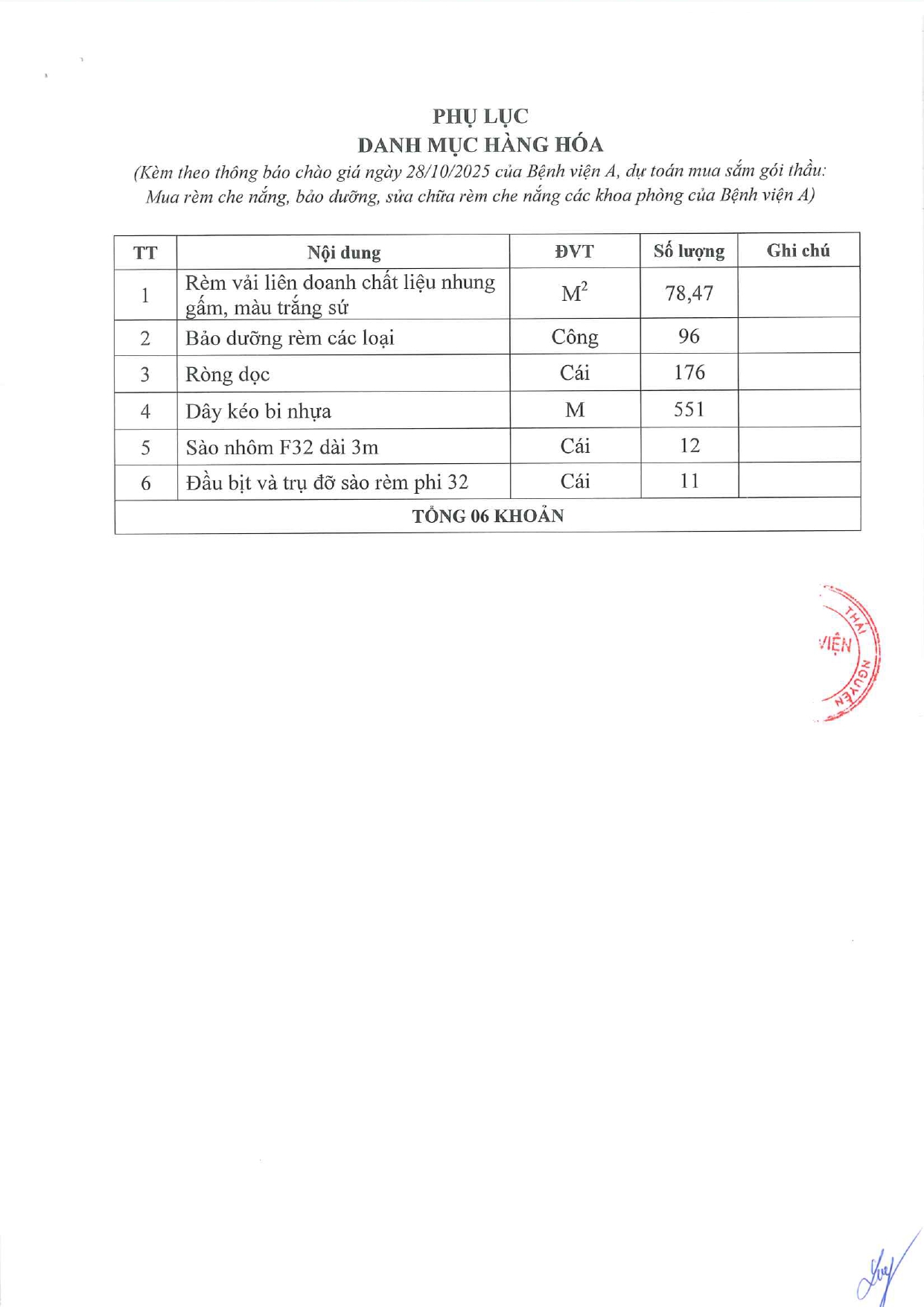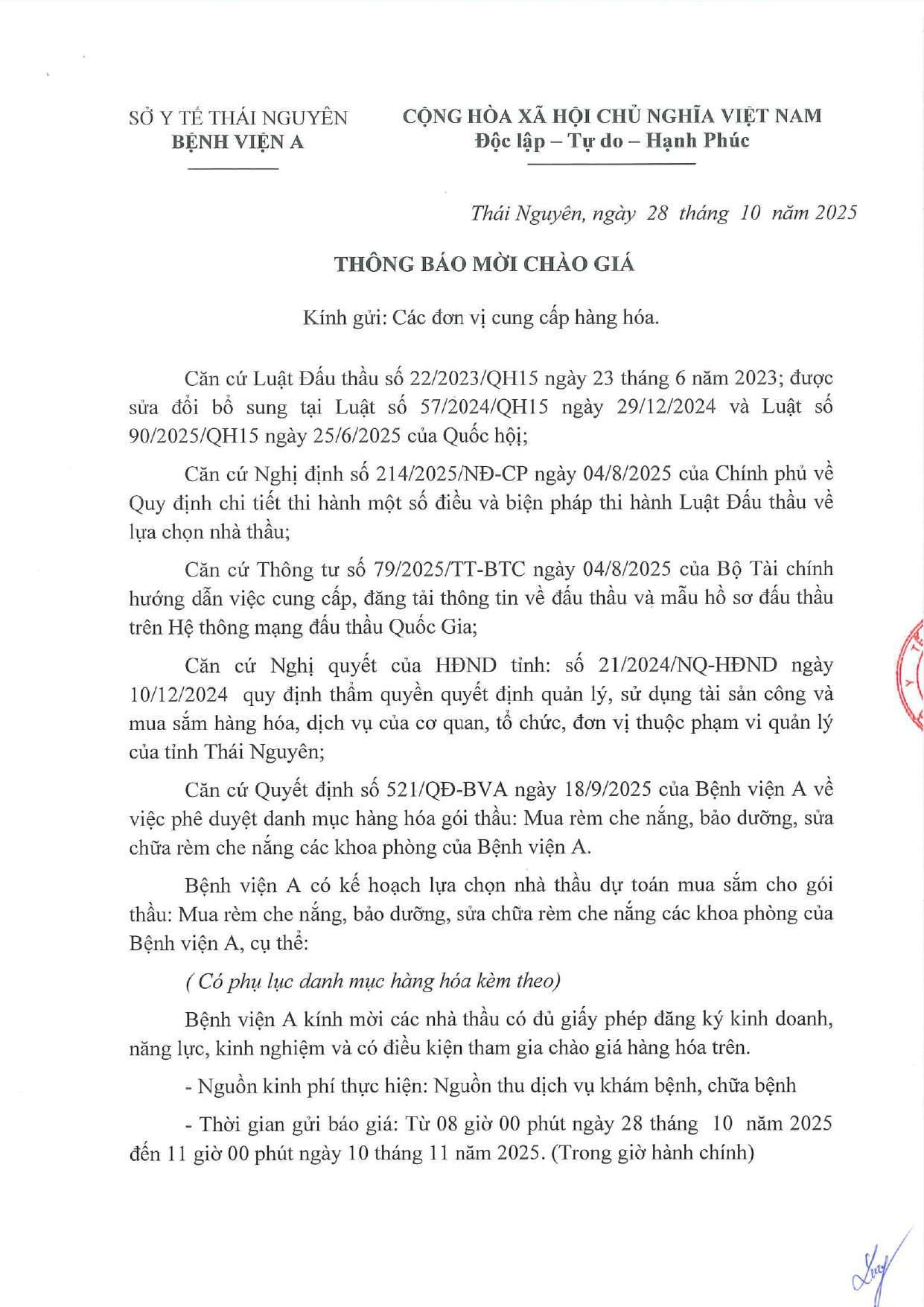 Thông báo mời chào giá gói thầu: Mua rèm che nắng, bảo dưỡng, sửa chữa rèm che nắng các khoa phòng của Bệnh viện A
