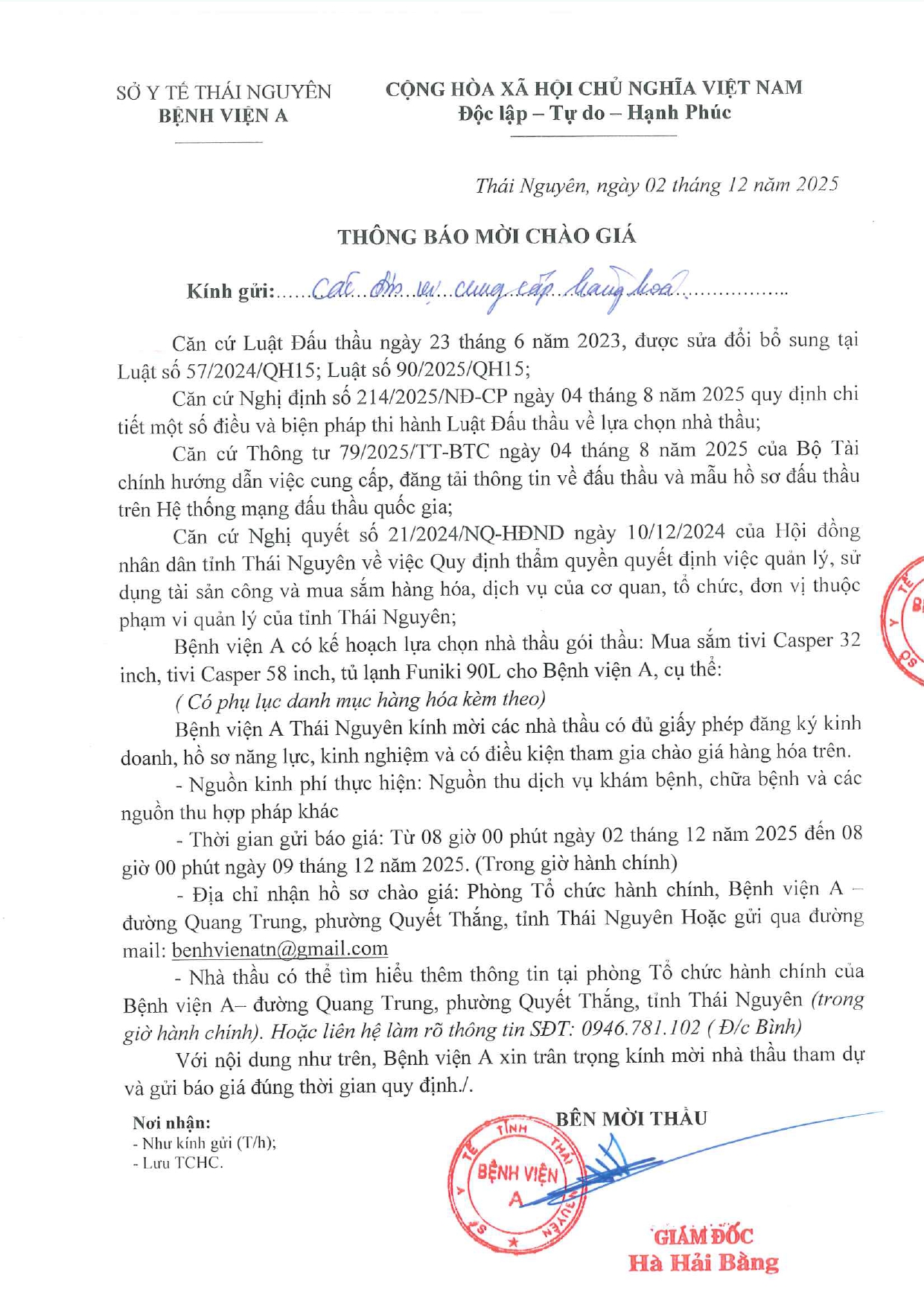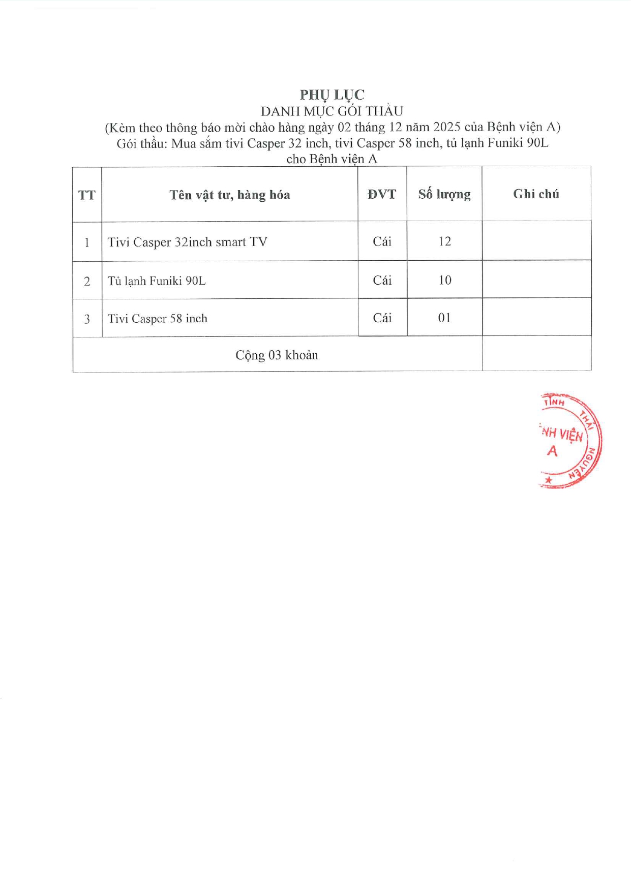 Thông báo mời chào giá gói thầu: Mua sắm tivi Casper 32 inch, tivi Casper 58 inch, tủ lạnh Funiki 90L cho Bệnh viện A