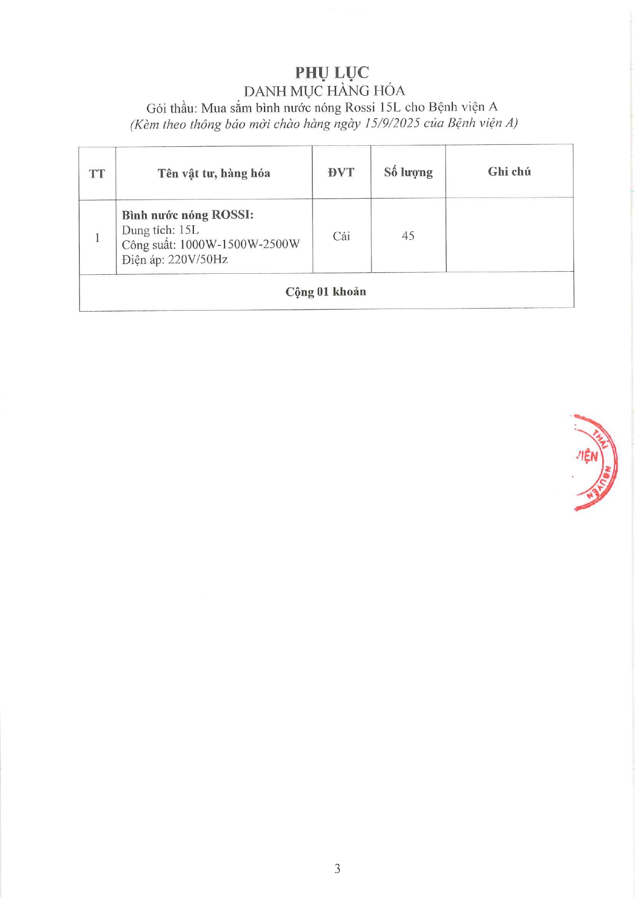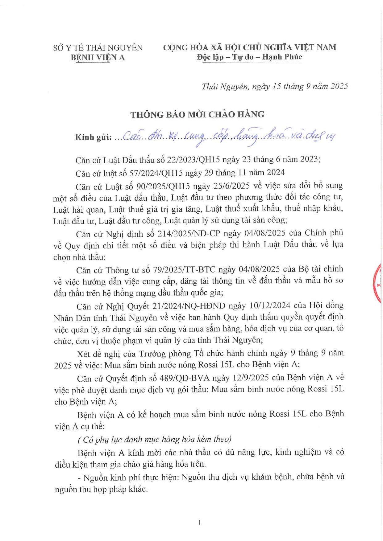 Thông báo mời chào giá gói thầu: Mua sắm bình nước nóng Rossi 15L cho Bệnh viện A