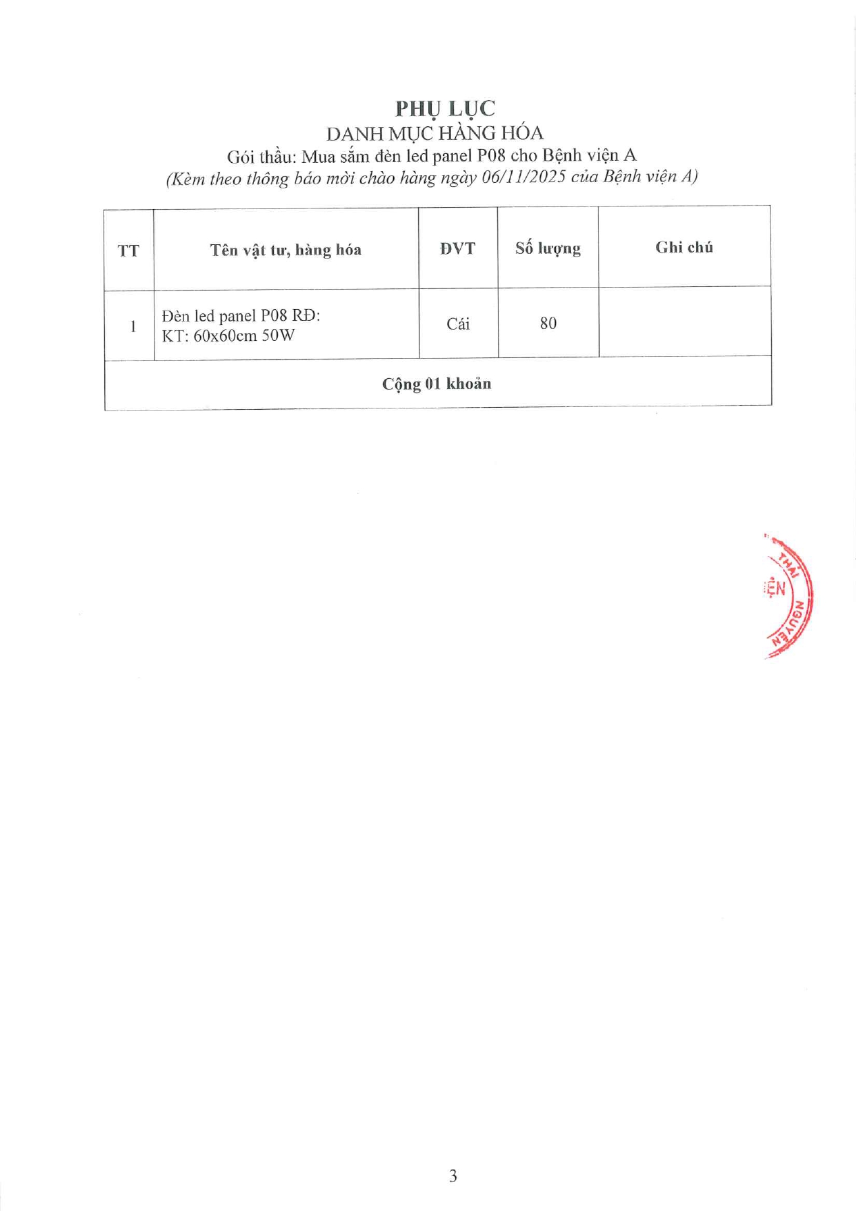 Thông báo mời chào hàng gói thầu: Mua sắm đèn led panel P08 cho Bệnh viện A