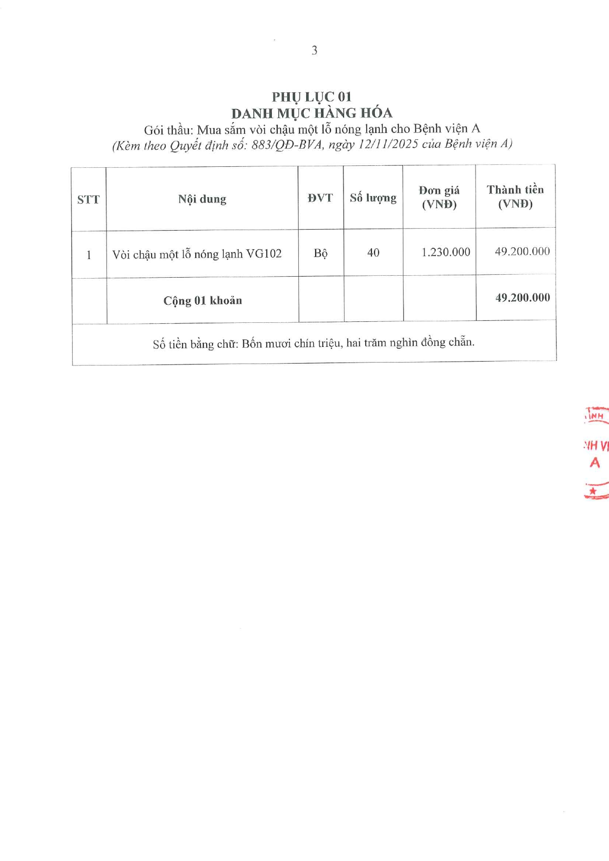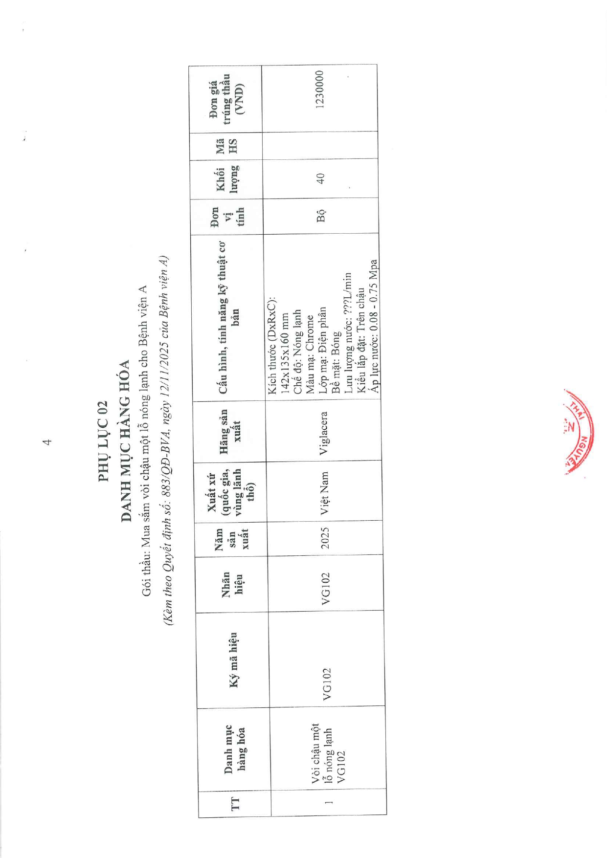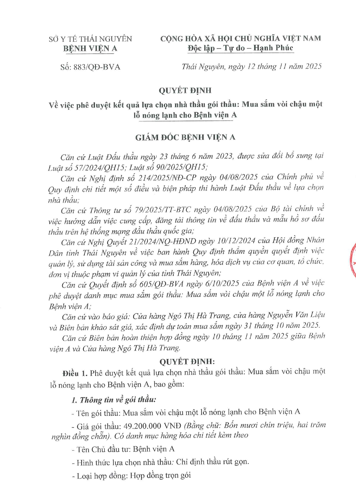 Quyết định về việc phê duyệt kết quả lựa chọn nhà thầu gói thầu: Mua sắm vòi chậu một lỗ nóng lạnh cho Bệnh viện A