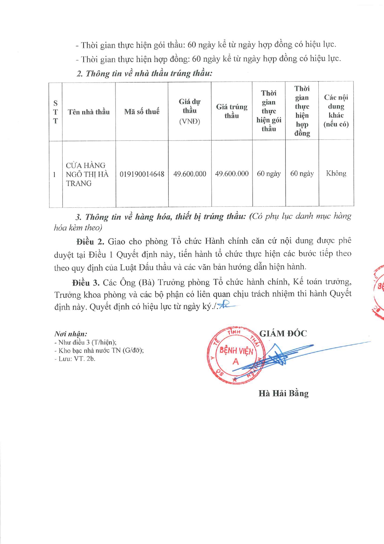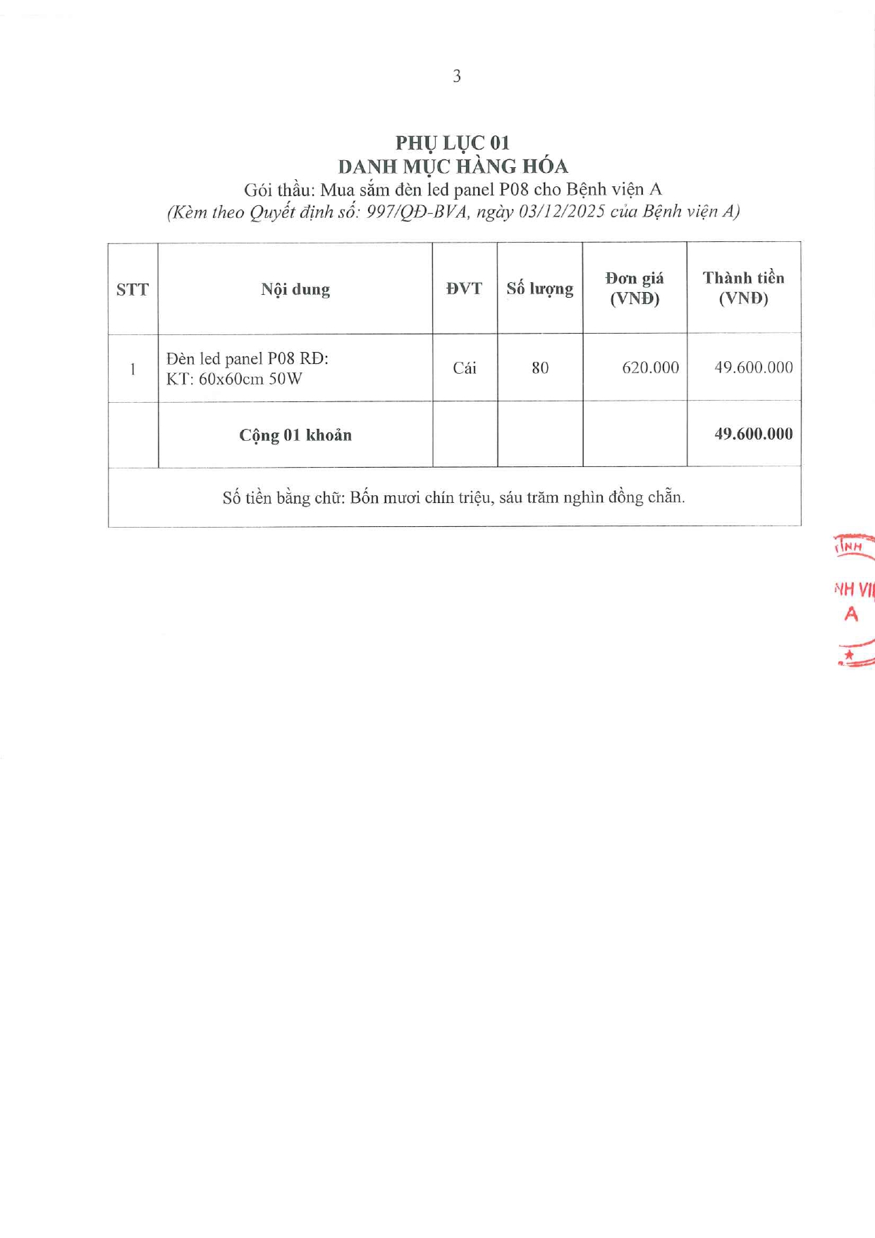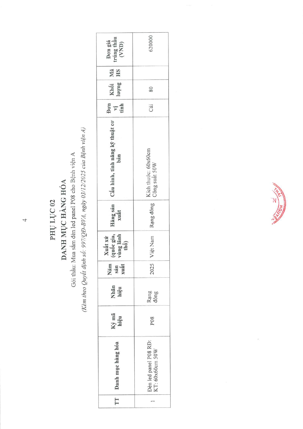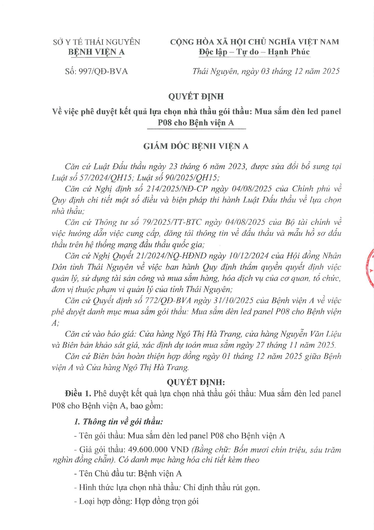 Quyết định về việc phê duyệt kết quả lựa chọn nhà thầu gói thầu: Mua sắm đèn led panel P08 cho Bệnh viện A