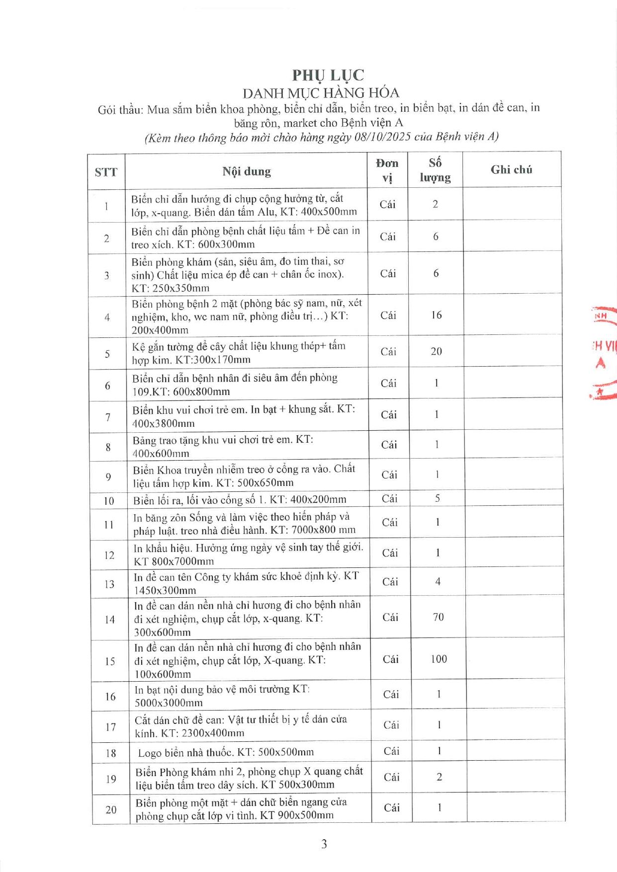 Thông báo mời chào giá gói thầu: Mua sắm biển khoa phòng, biển chỉ dẫn, biển treo, in biển bạt, in đề can, in băng rôn, market cho Bệnh viện A