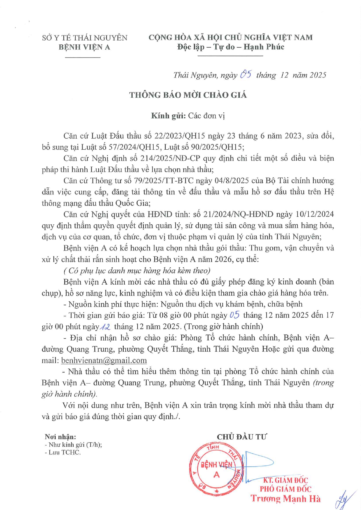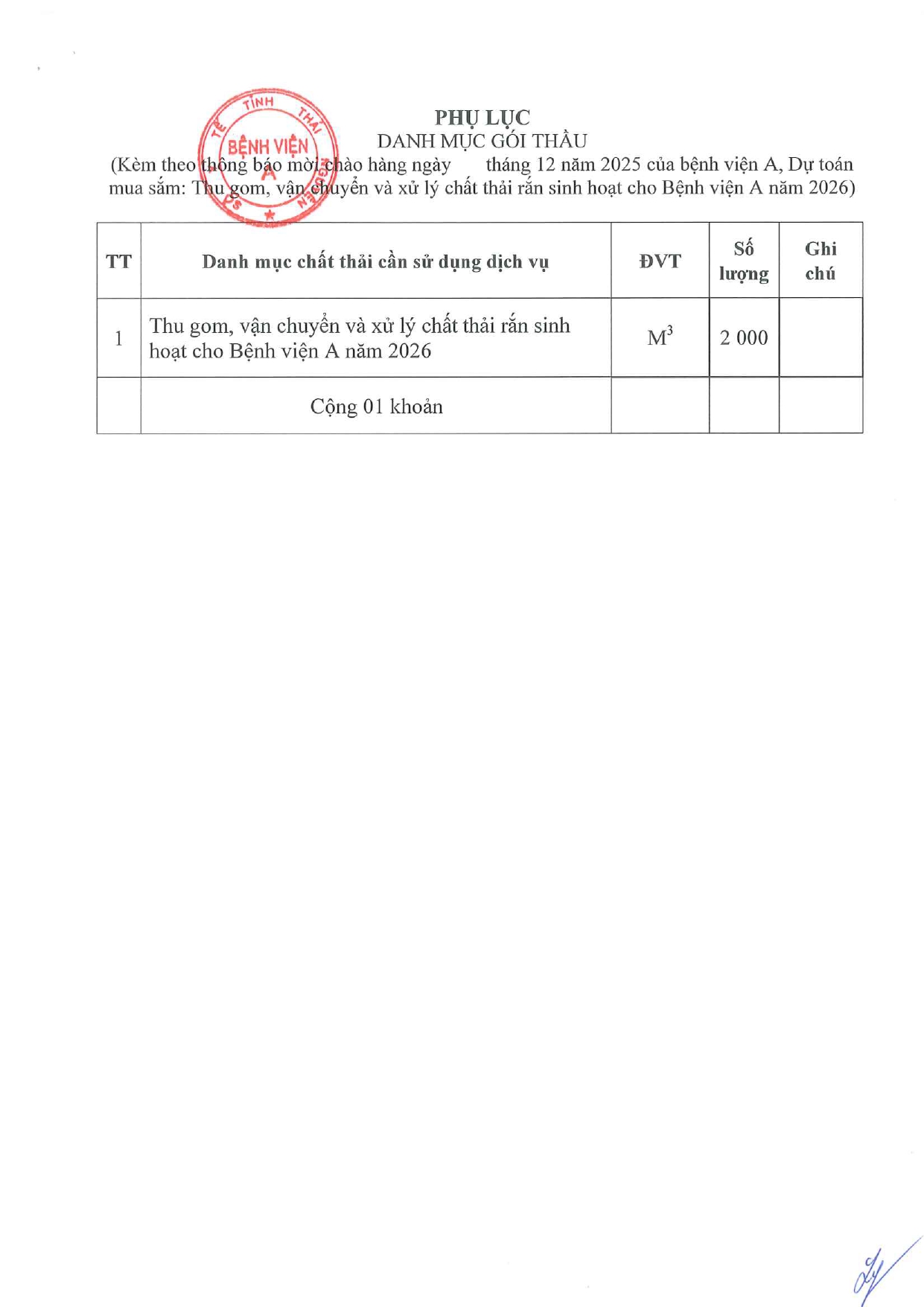 Thông báo mời chào giá gói thầu: Thu gom, vận chuyển và xử lý chất thải rắn sinh hoạt cho Bệnh viện A năm 2026