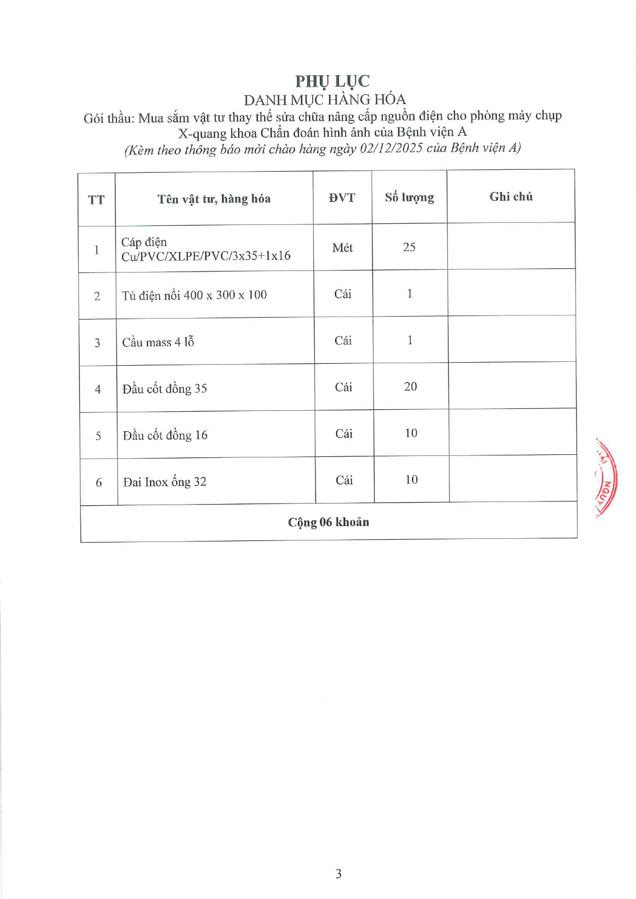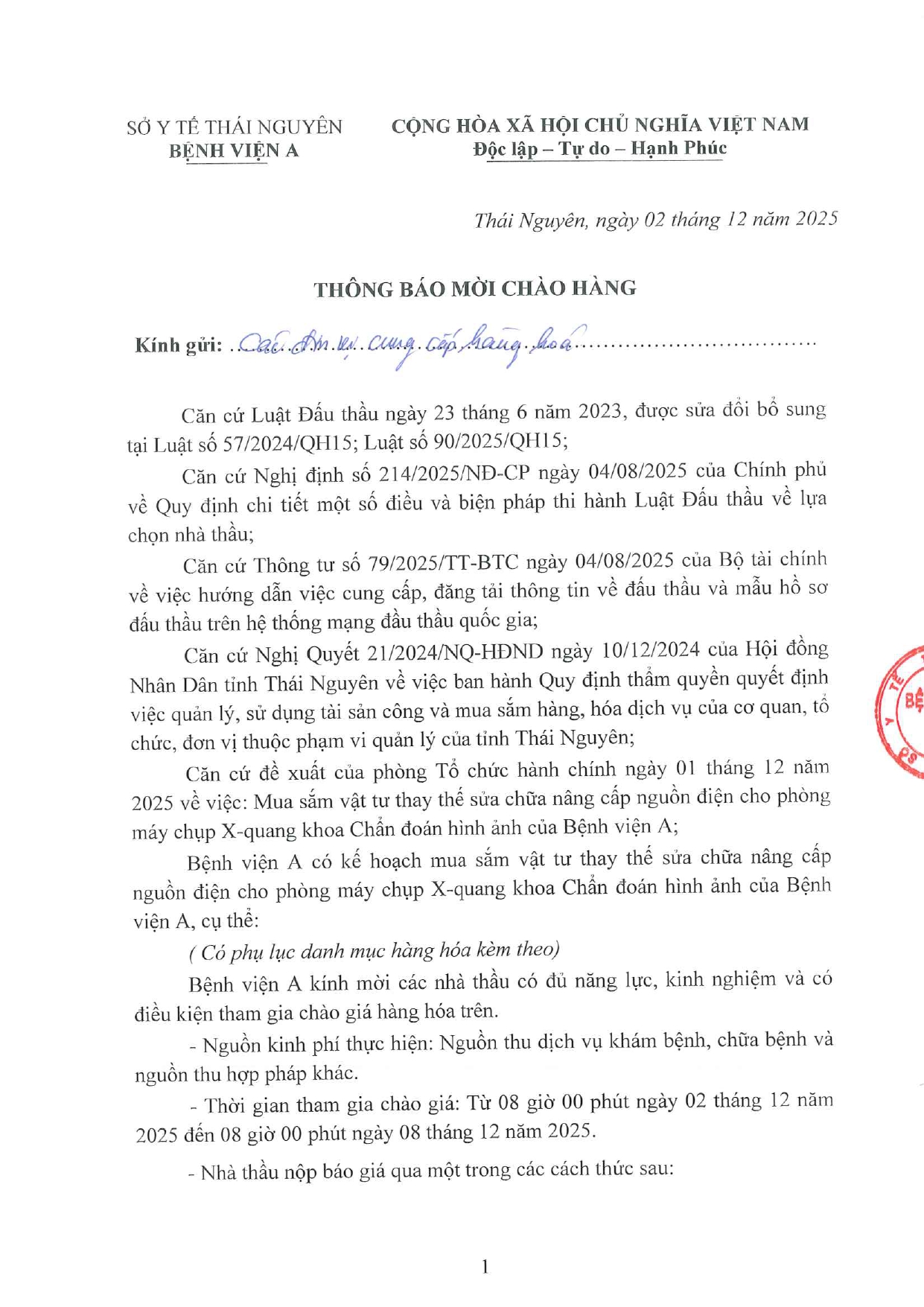 Thông báo mời chào giá gói thầu: Mua sắm vật tư thay thế sửa chữa nâng cấp nguồn điện cho phòng máy chụp X-quang khoa chẩn đoán hình ảnh của Bệnh viện A