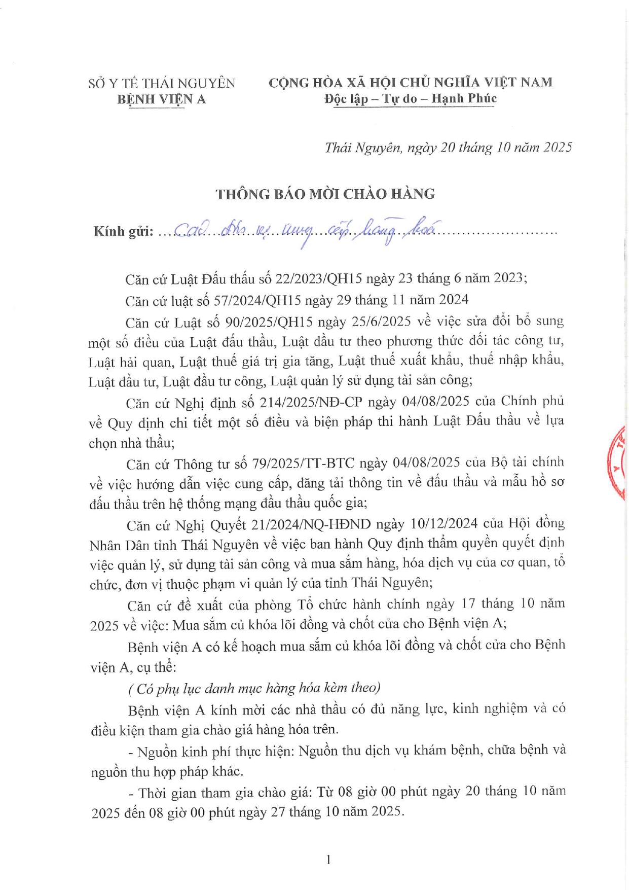 Thông báo mời chào giá gói thầu: Mua sắm củ khóa lõi đồng và chốt cửa cho Bệnh viện A