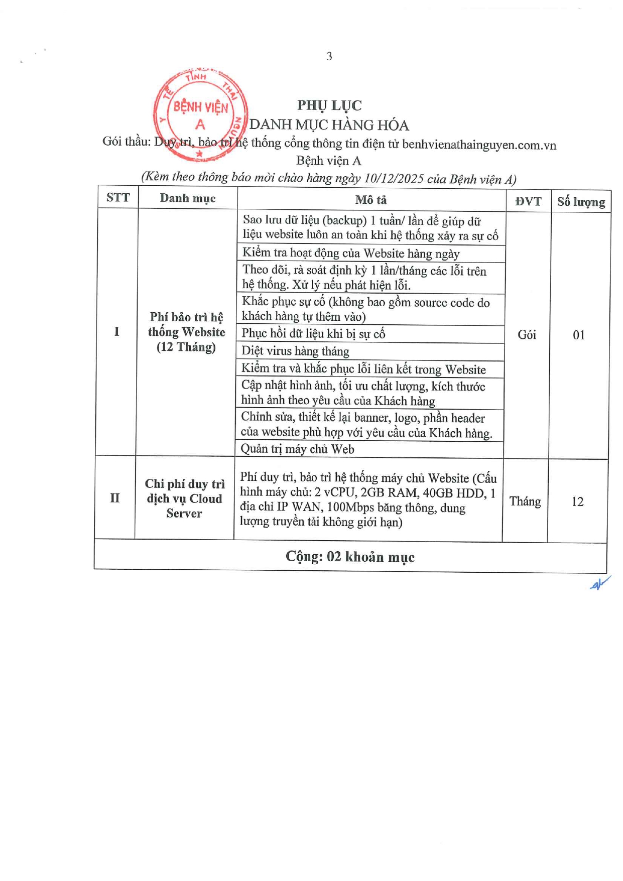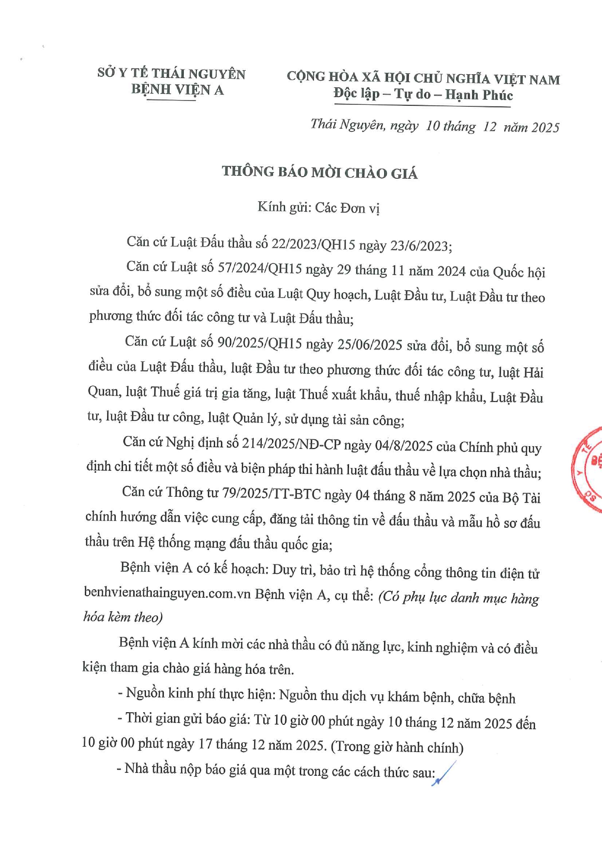 Thông báo mời chào hàng gói thầu: Duy trì, bảo trì hệ thống cổng thông tin điện tử benhvienathainguyen.com.vn