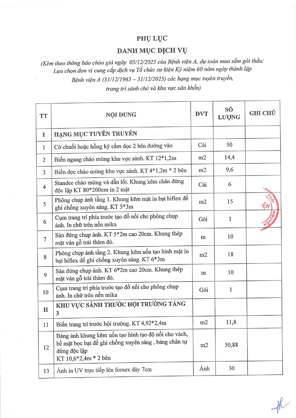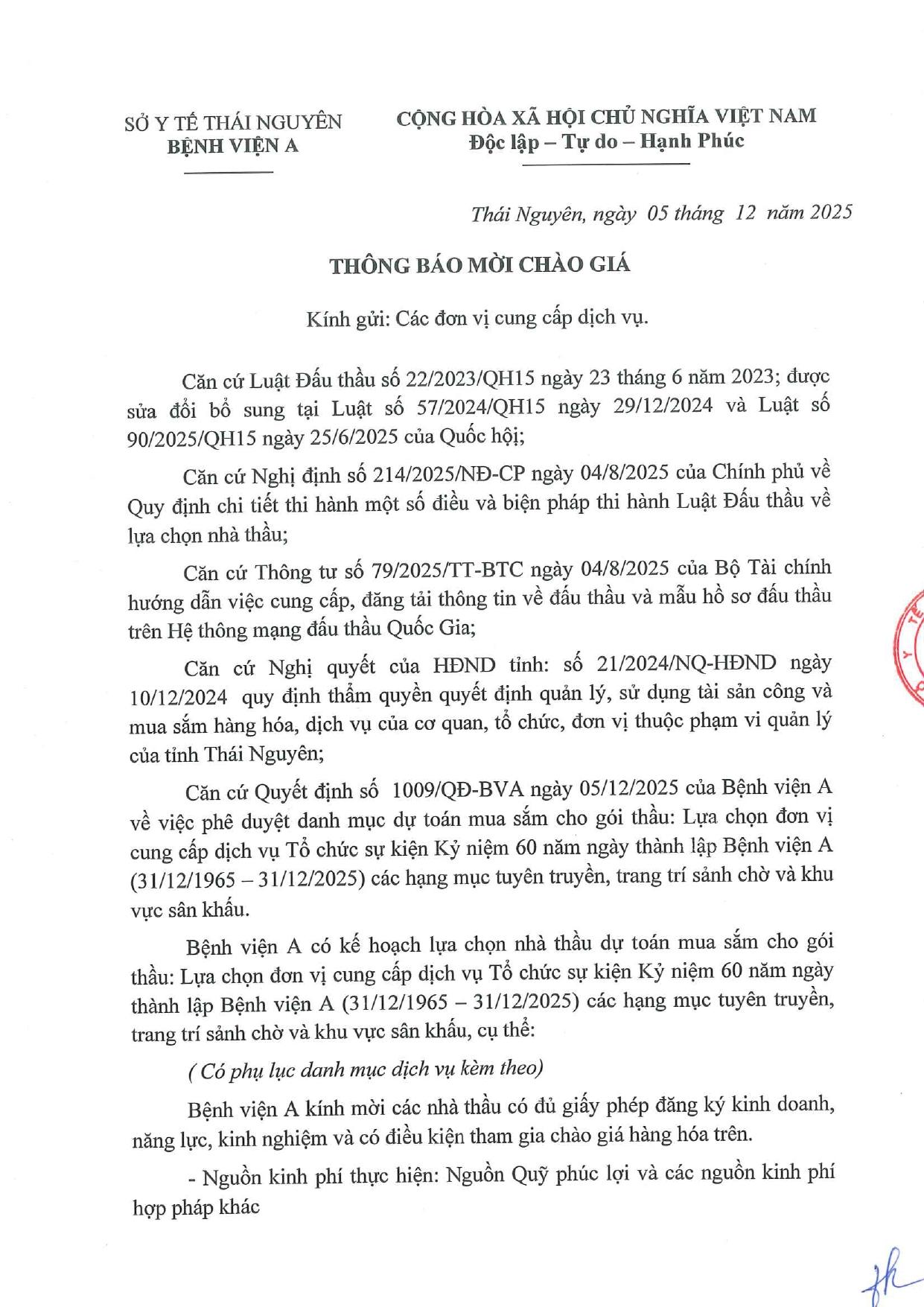 • Thông báo mời chào giá gói thầu: Lựa chọn đơn vị cung cấp dịch vụ thuê hội trường phục vụ lễ kỷ niệm 60 năm thành lập Bệnh viện A ( 05/12/2025)