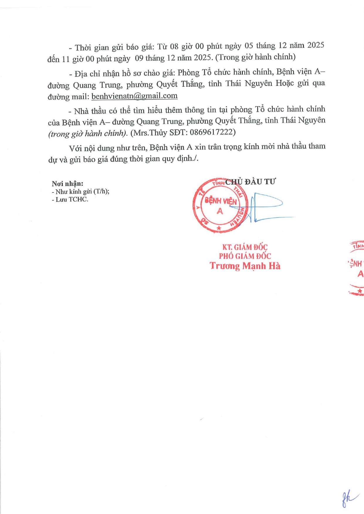 • Thông báo mời chào hàng gói thầu: Duy trì, bảo trì hệ thống cổng thông tin điện tử benhvienathainguyen.com.vn ( 10/12/2025)