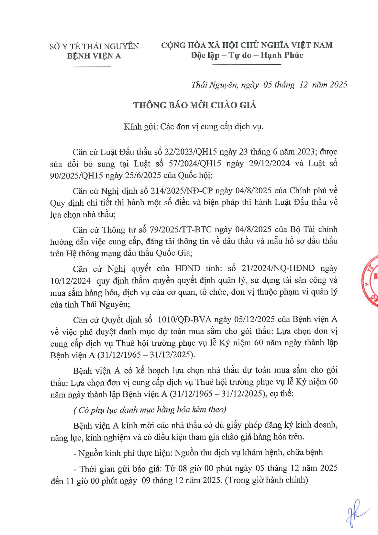• Thông báo mời chào giá gói thầu: Lựa chọn đơn vị cung cấp dịch vụ Tổ chức sự kiện 60 năm ngày thành lập Bệnh viện A ( 05/12/2025)
