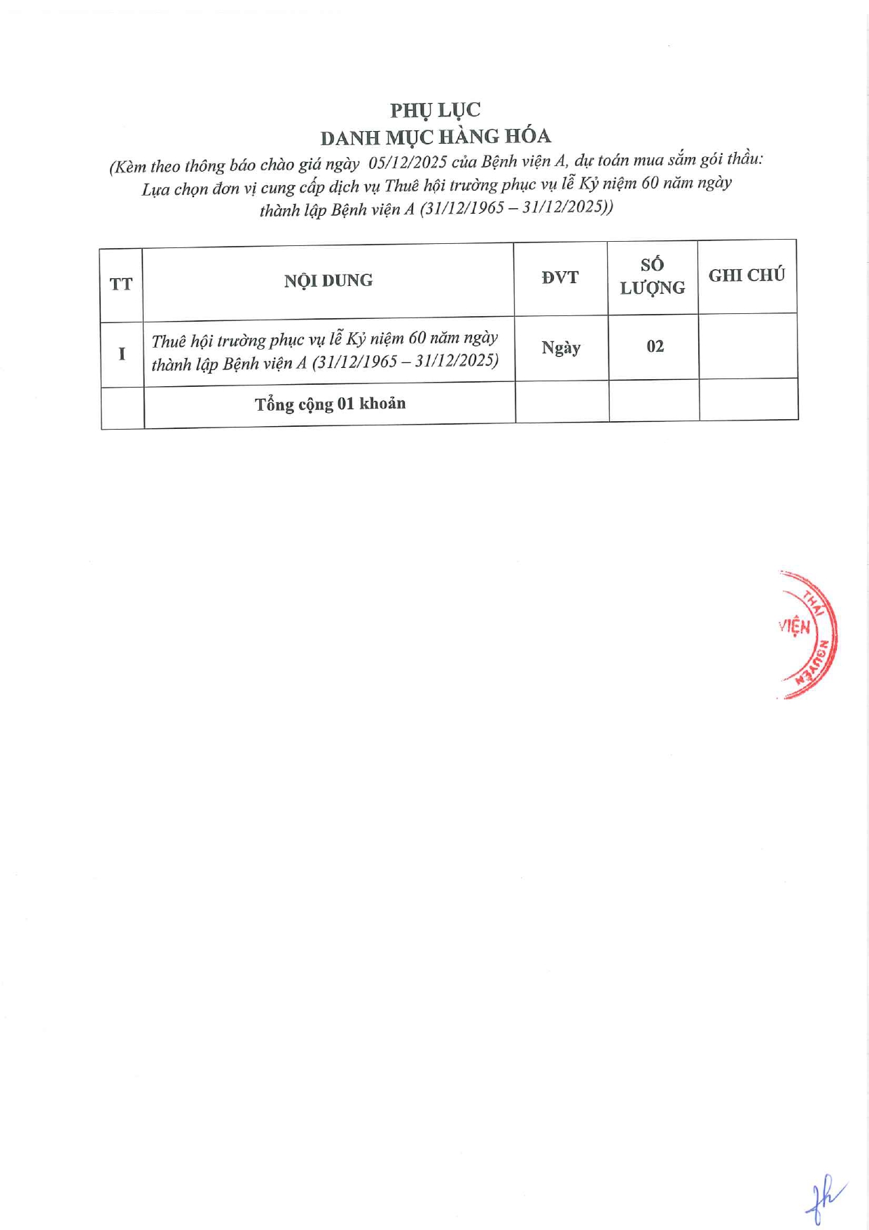 Thông báo mời chào giá gói thầu: Lựa chọn đơn vị cung cấp dịch vụ thuê hội trường phục vụ lễ kỷ niệm 60 năm thành lập Bệnh viện A