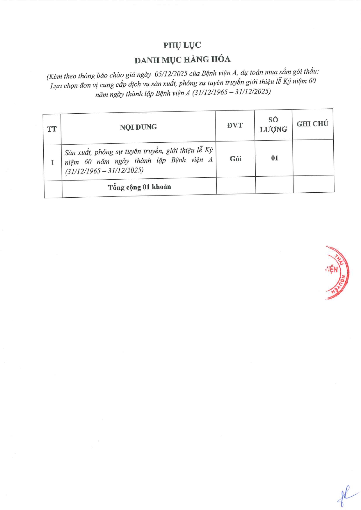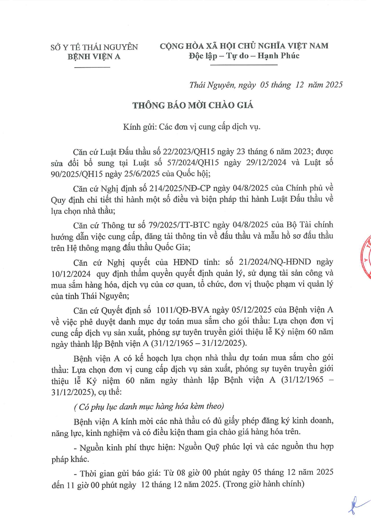 Thông báo mời chào giá gói thầu: Lựa chọn đơn vị cung cấp dịch vụ sản xuất, phóng sự tuyên truyền giới thiệu lễ Kỷ niệm 60 năm ngày thành lập Bệnh viện A
