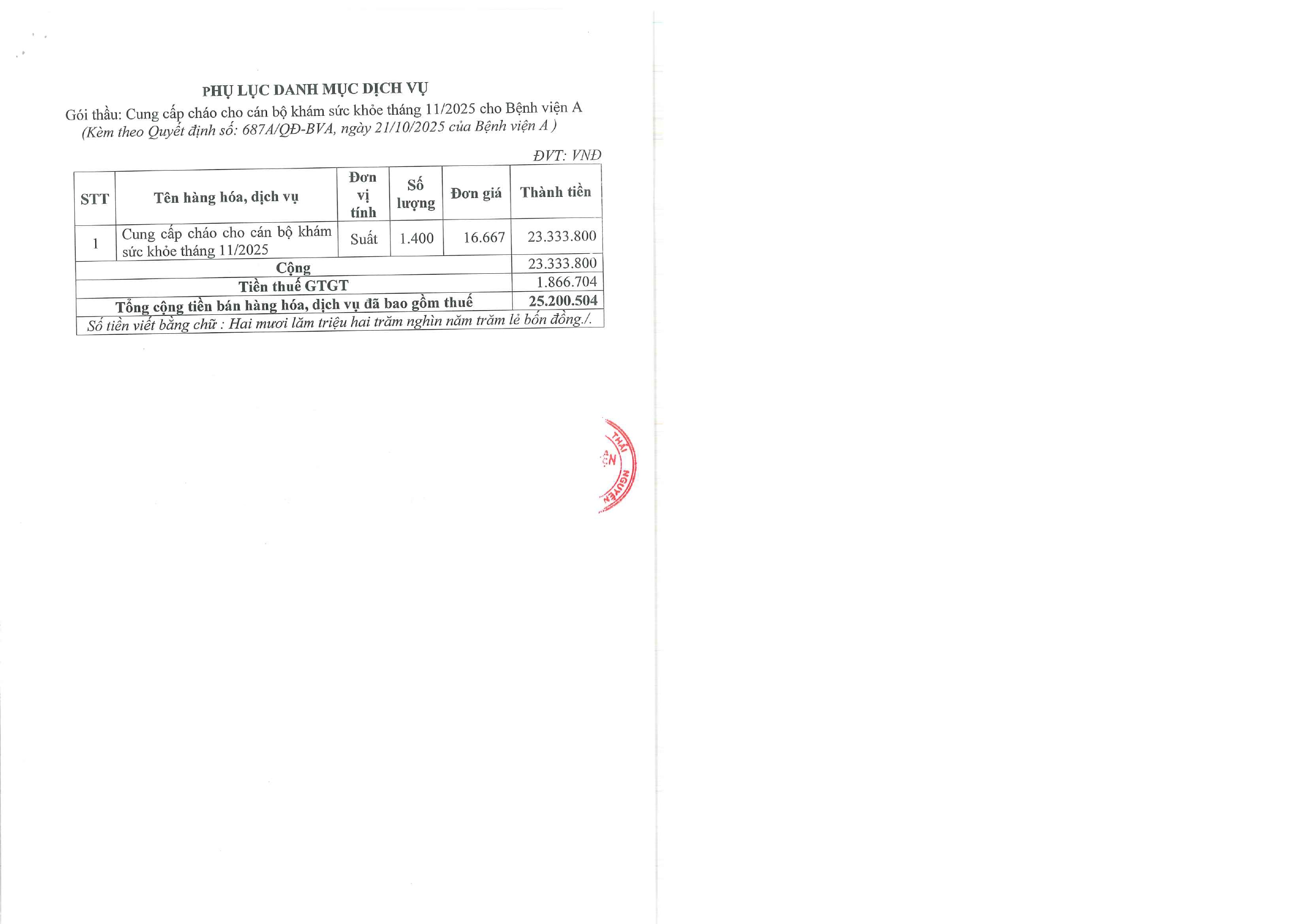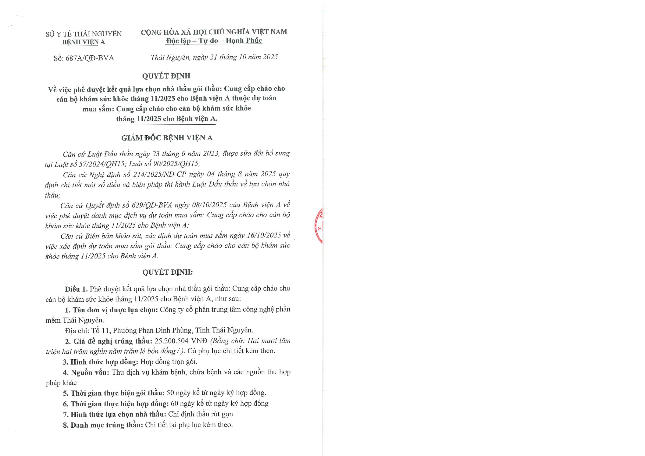 Quyết định về việc phê duyệt kết quả lựa chọn nhà thầu gói thầu: Cung cấp cháo cho cán bộ khám sức khỏe tháng 11/2025 cho Bệnh viện A