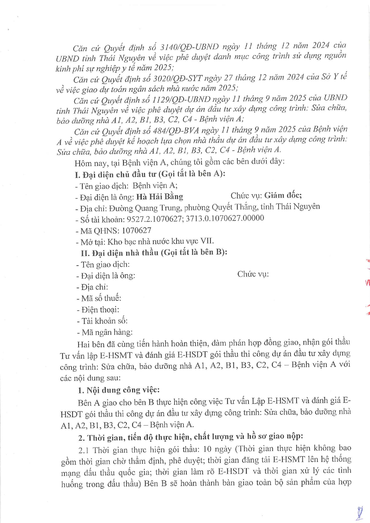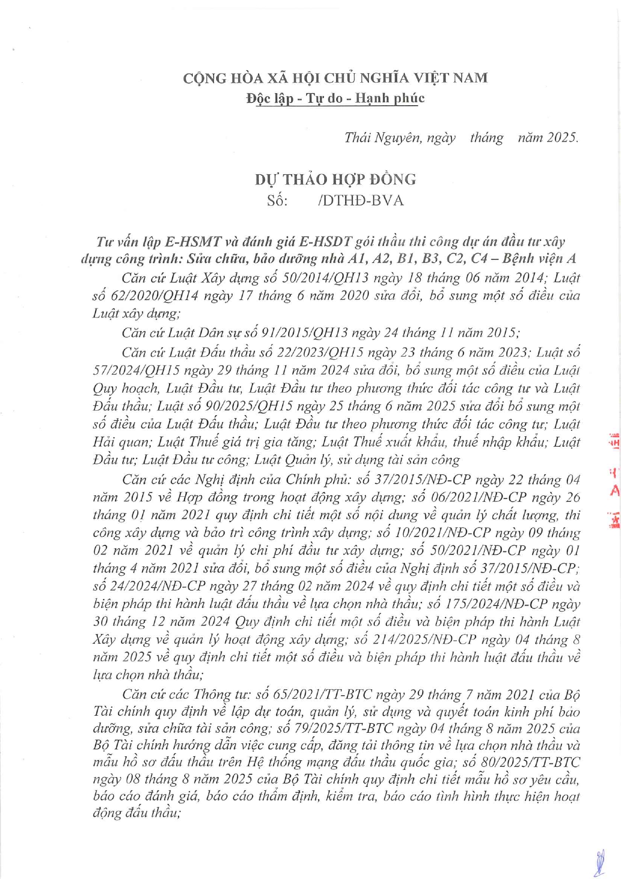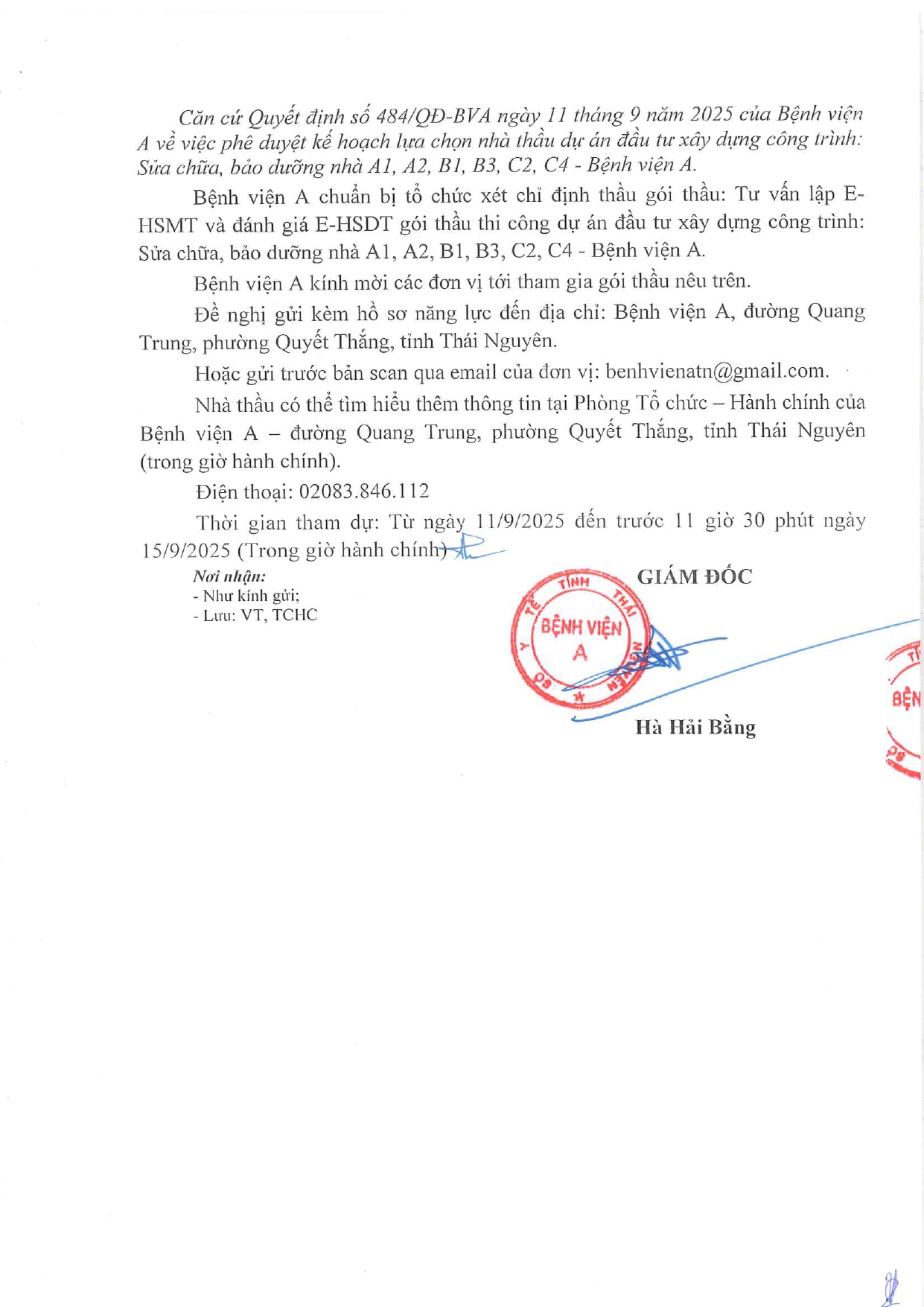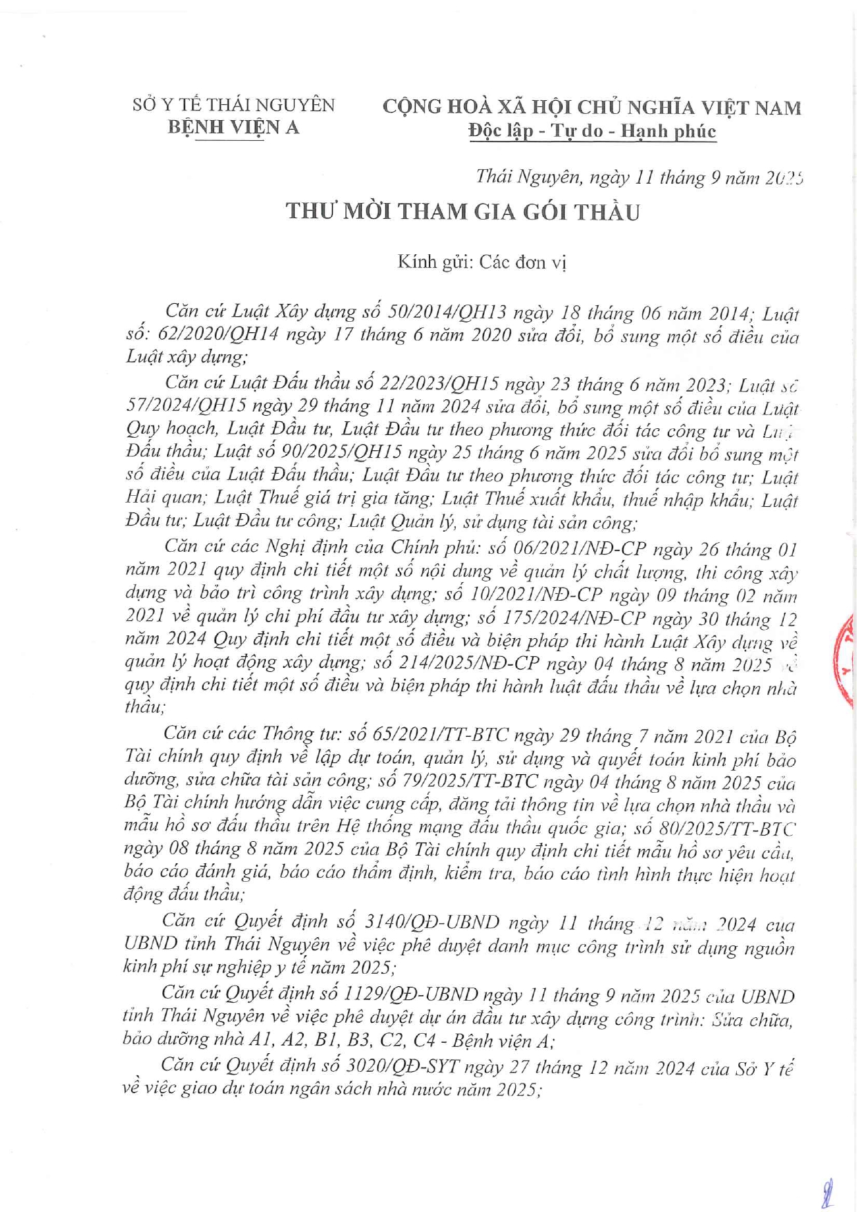 Thư mời tham gia gói thầu: Sửa chữa bảo dưỡng nhà A1, A2, B1, B3, C2, C4 - Bệnh viện A