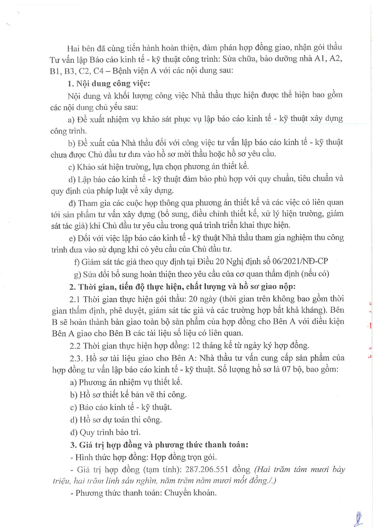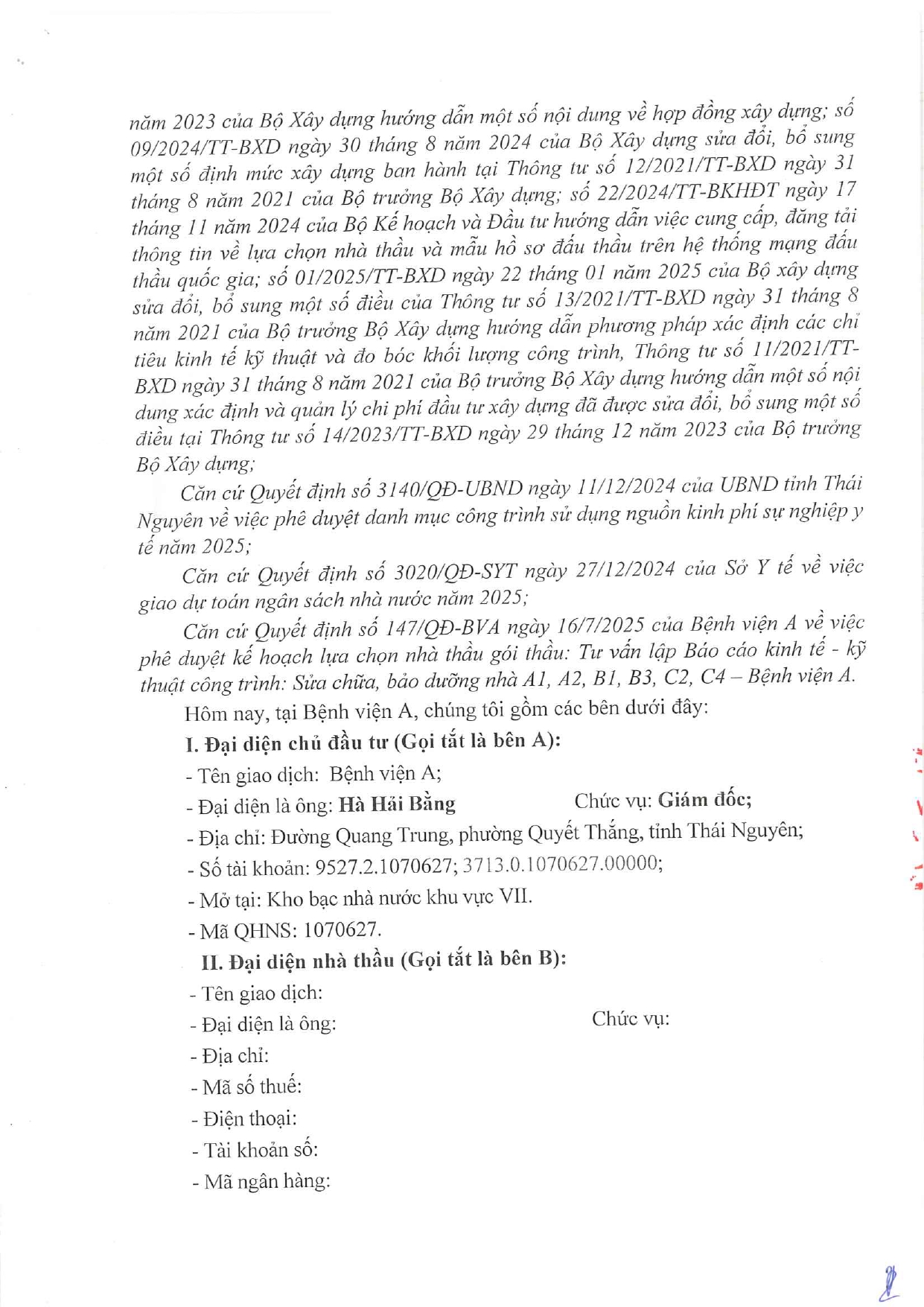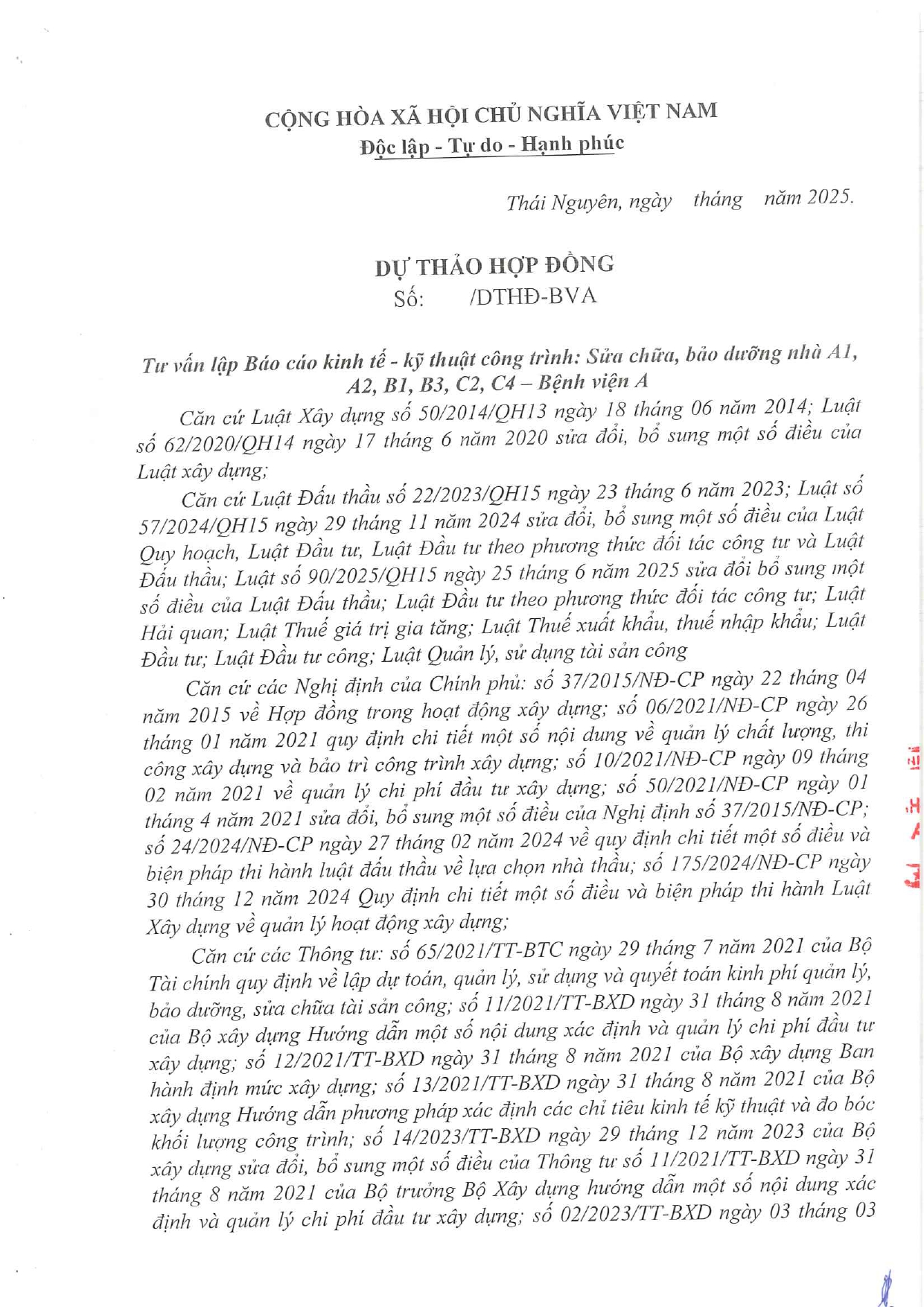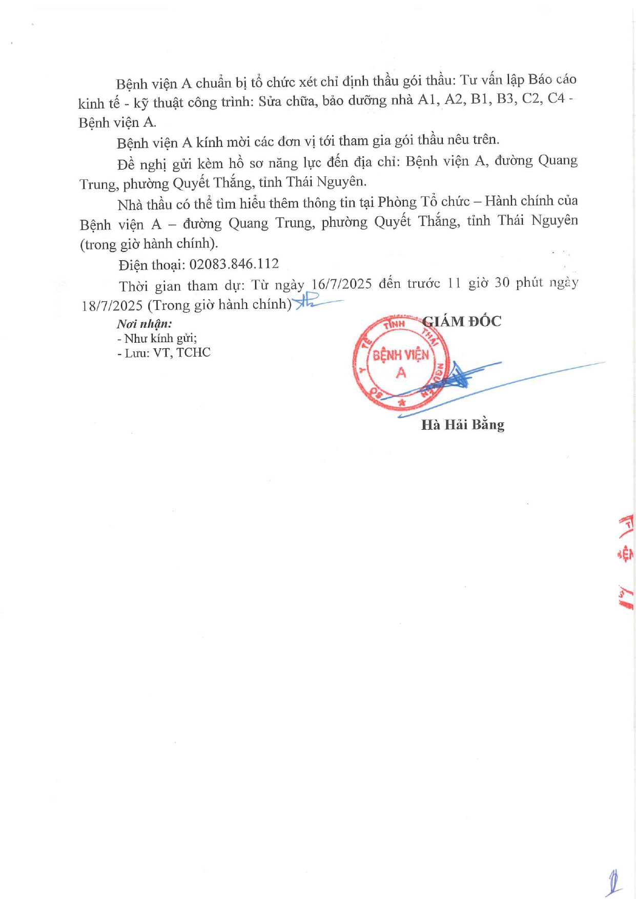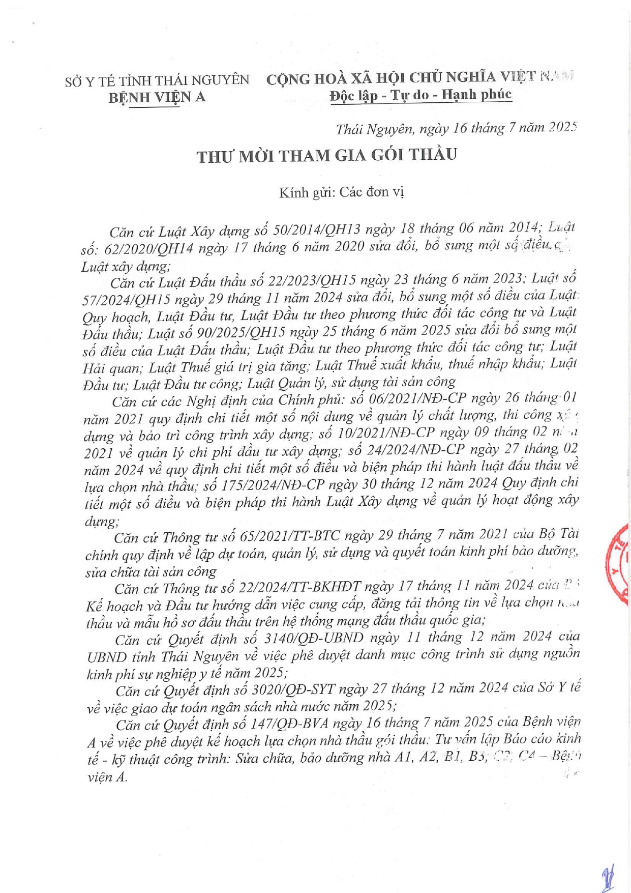 Thư mời tham gia gói thầu: Sủa chữa, bảo dưỡng nhà A1, A2, B1, B3, C2, C4 - Bệnh viện A