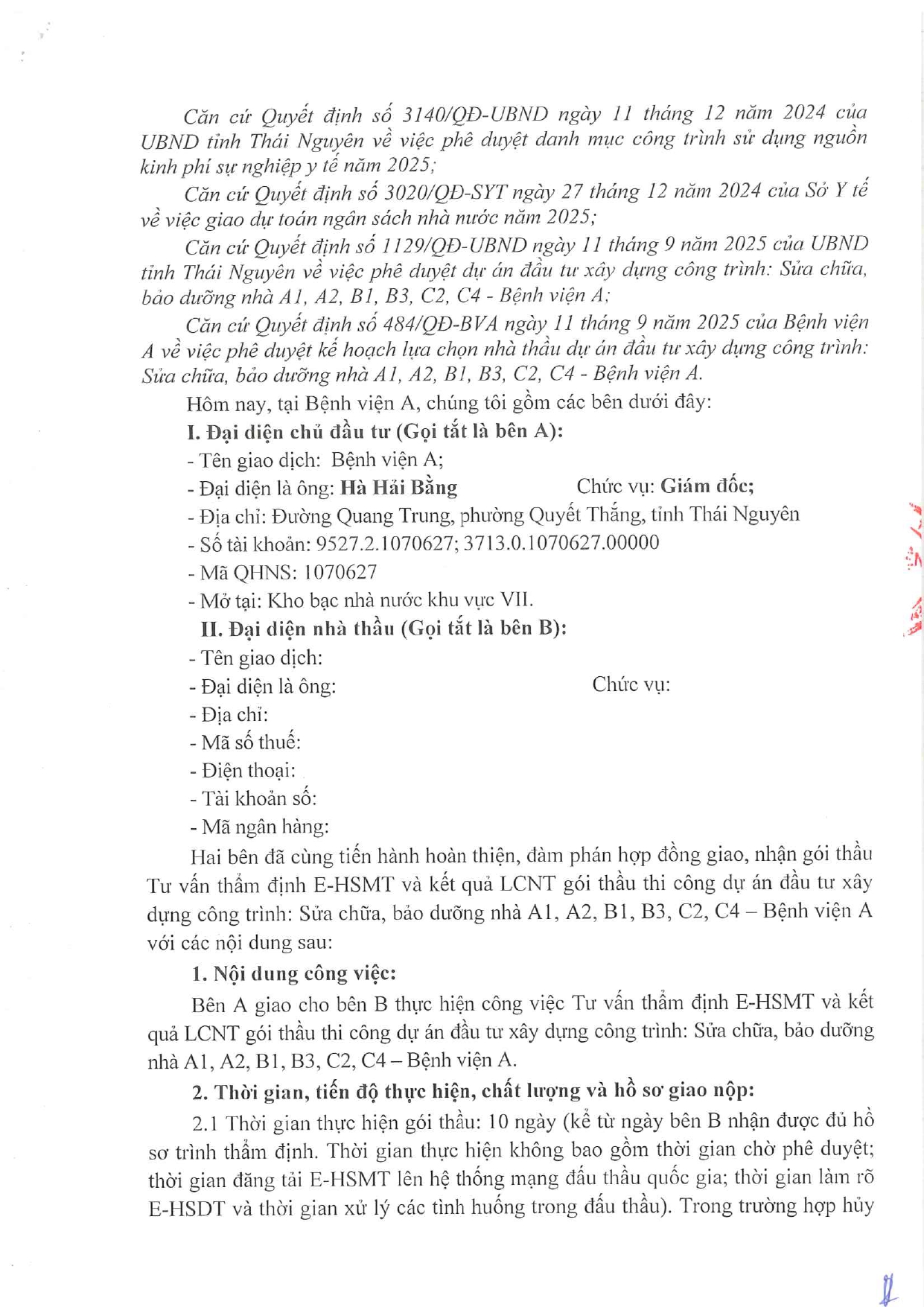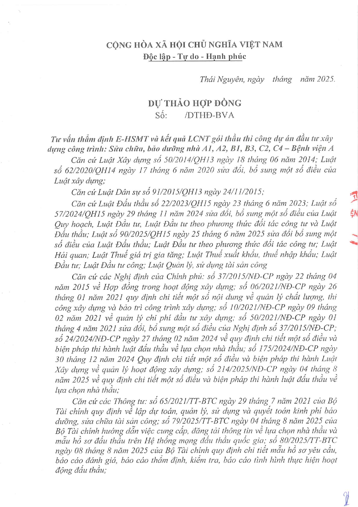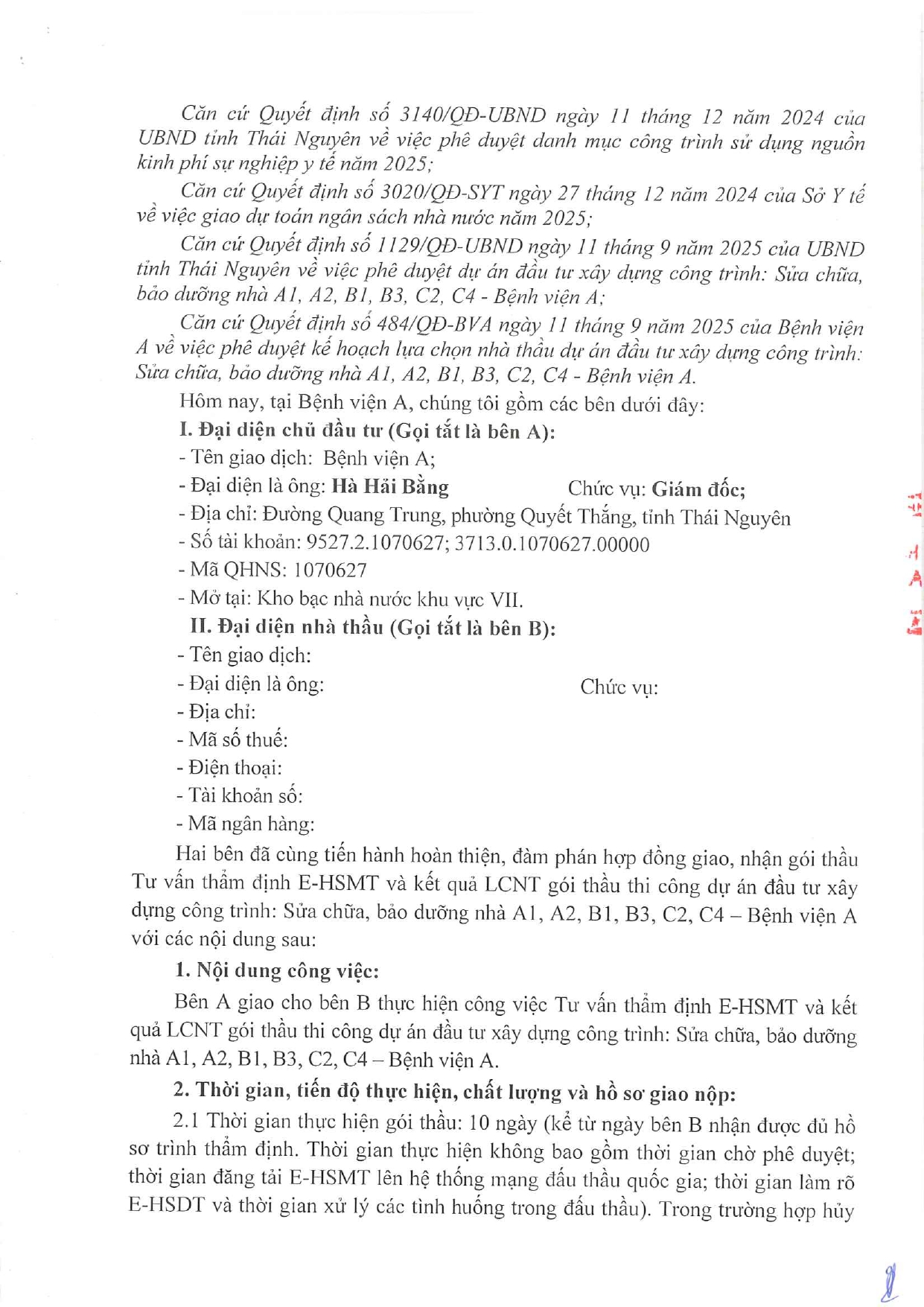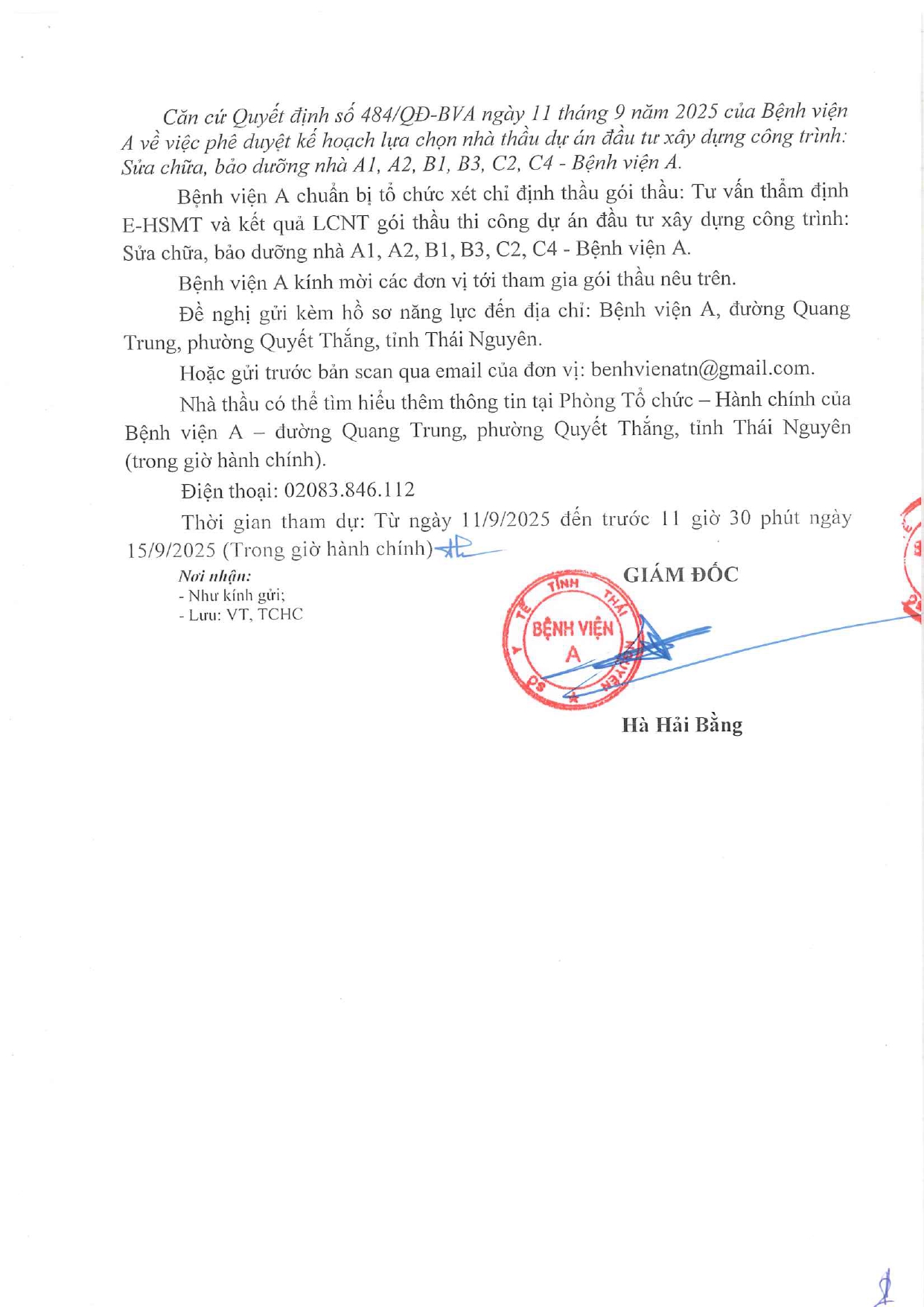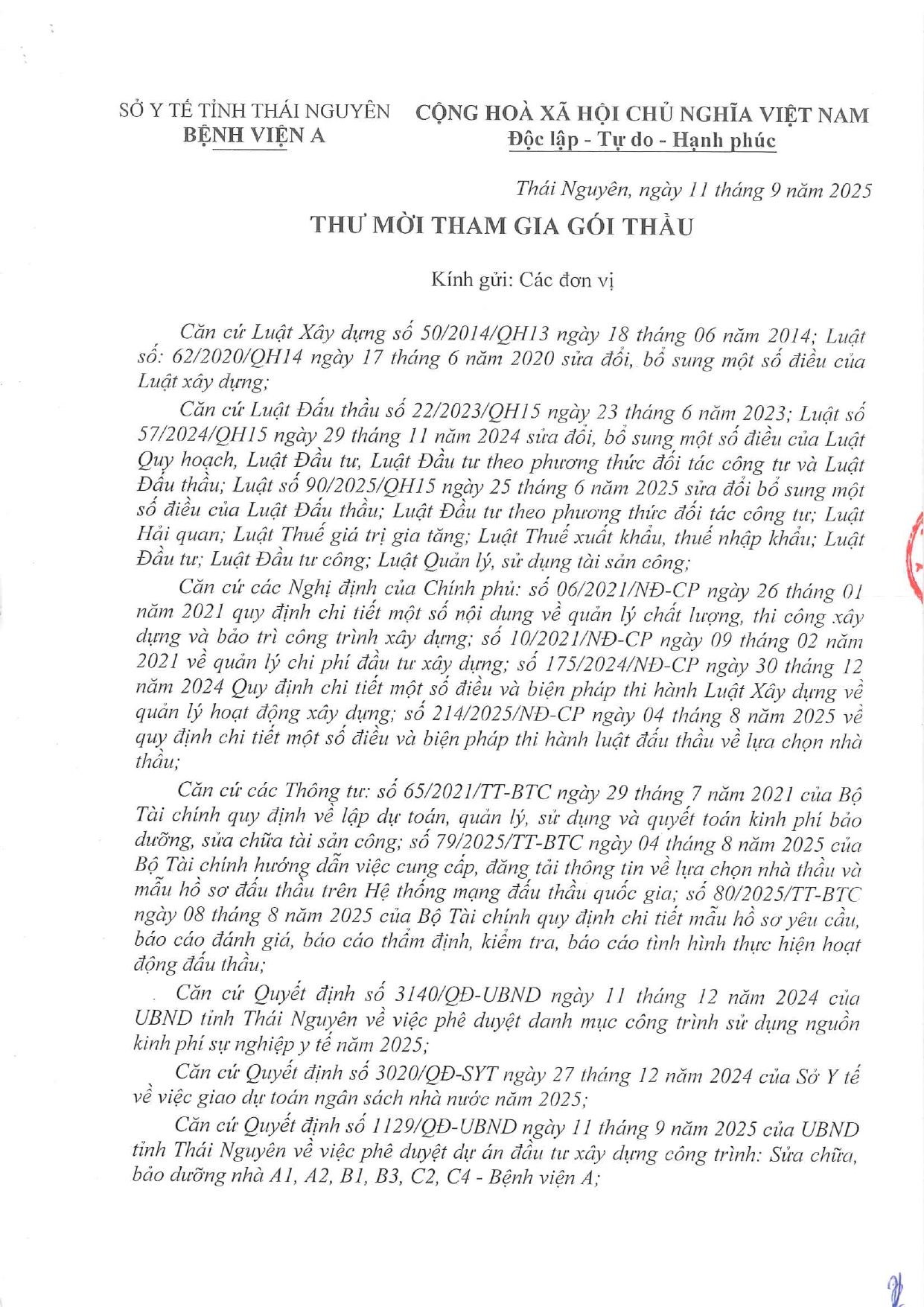Thư mời tham gia gói thầu: Sửa chữa, bảo dưỡng nhà A1, A2, B1, C2, C4 - Bệnh viện A