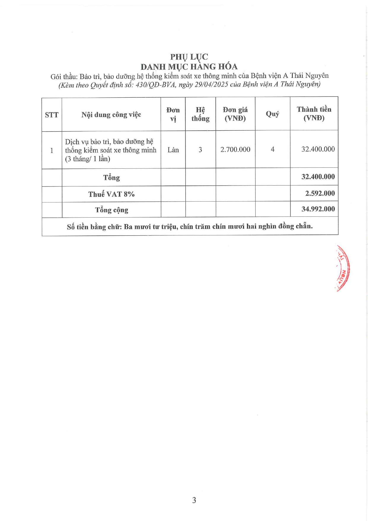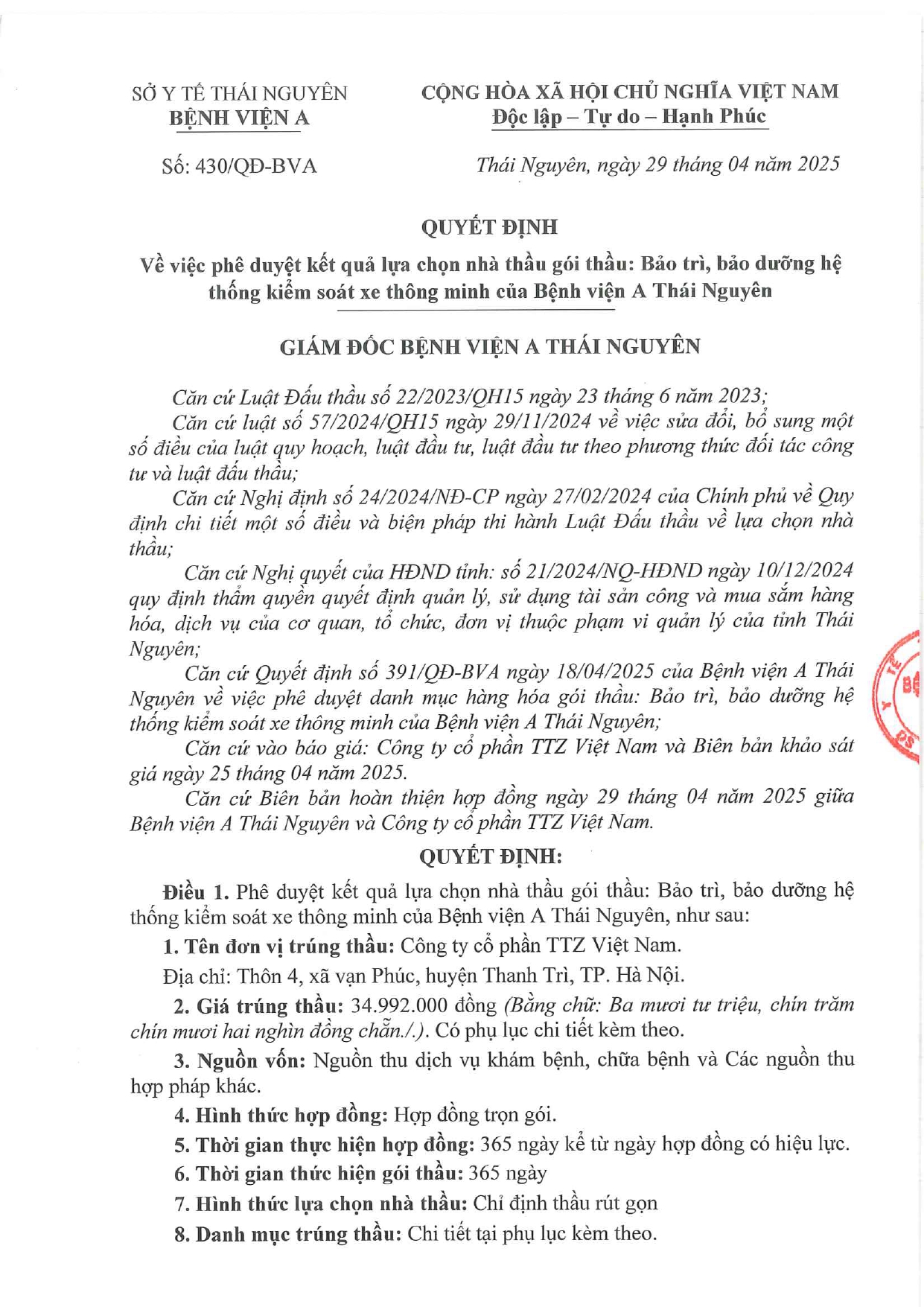 Quyết định về việc phê duyệt kết quả lựa chọn nhà thầu gói thầu: Bảo trì, bảo dưỡng hệ thống kiểm soát xe thông minh của Bệnh viện A