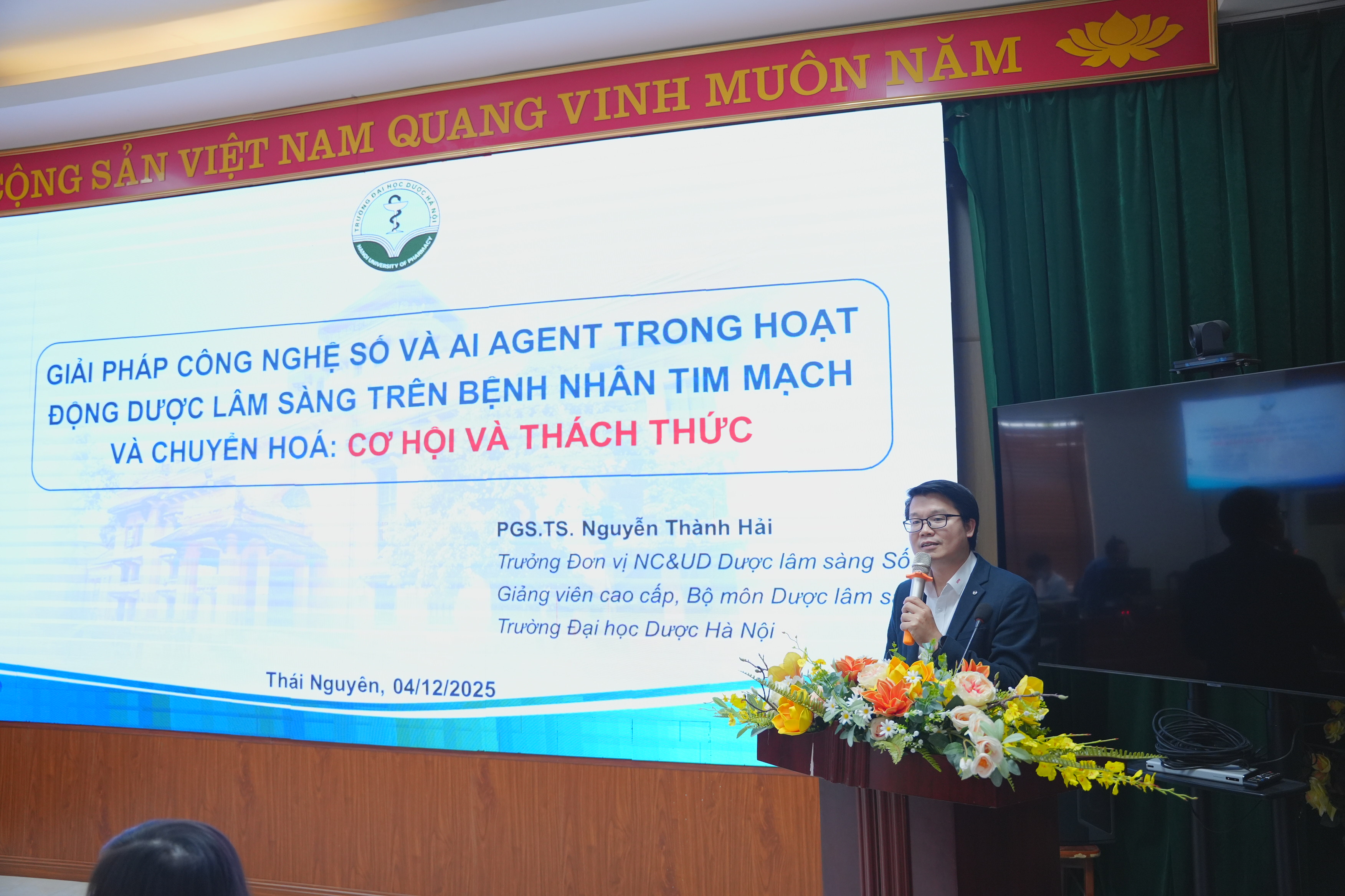 PGS.TS. Nguyễn Thành Hải, Trưởng đơn vị NC & UD Dược lâm sàng số, Trường Đại học Dược Hà Nội trình bày nội dung về “Giải pháp công nghệ số và AI Agent trong hoạt động dược lâm sàng trên bệnh nhân tim mạch và chuyển hoá: Cơ hội và thách thức”