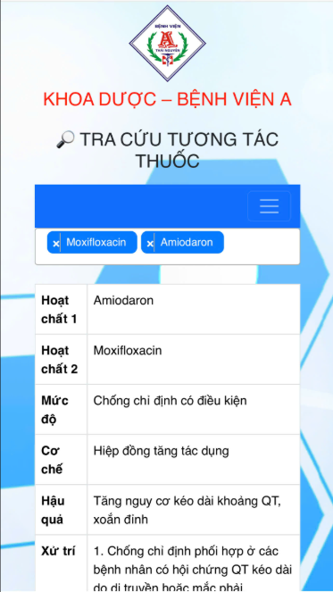 Bên cạnh đó, khoa Dược bệnh viện cũng đã tích hợp các cảnh báo/ thông tin hỗ trợ khi kê đơn trên phần mềm HIS, cũng như xây dựng Wedapp tra cứu thông tin thuốc cho cán bộ y tế và người bệnh được thuận tiện nhất.